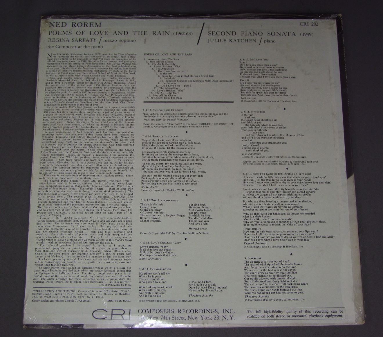 NED ROREM/Poems of Love & the Rain + Piano Sonata未開封 CRI202 製造国:米国盤 / Media:LP外観:M盤の状態:M 価格(税込):¥1,650(売約済) 送料 7inch:定形外郵便 360円~LP:定形外郵便 660円~送料は、注文の最終画面で確認頂けます。 > > NED ROREM/Poems of Love & the Rain + Piano Sonata 盤の状態 (M)特記事項:未開封盤Mの共通説明:新品。 Tweet それぞれの画像をクリックすると、大きい写真が見られます こちらの商品もお勧めです 1,430円 KARAJAN / TCHAIKOWSKY-VERDI UND PONCHELLI 2,420円 KARAJAN / STRAUSS-SALOME 990円 KLEMPERER / ANTON BRUCKNER-SYM. NR4 ES DUR ROMANTISCHE 1,320円 TOSCANINI / BEETHOVEN-SYM. 7 1,540円 LEOPOLD HARGER - MOZARTEUM-ORCHESTER SALZBURG / MOZART - BASTIEN UND BASTIENNE 990円 ORMANDYオーマンディ / TCHAIKOVSKY WALTZES 1,320円 IONA BROWN / MOZART-VIOLIN CONC. K207-K219 1,760円 GIULINI / SCHUMANN SYM. NO3 `RHEINISCHE`