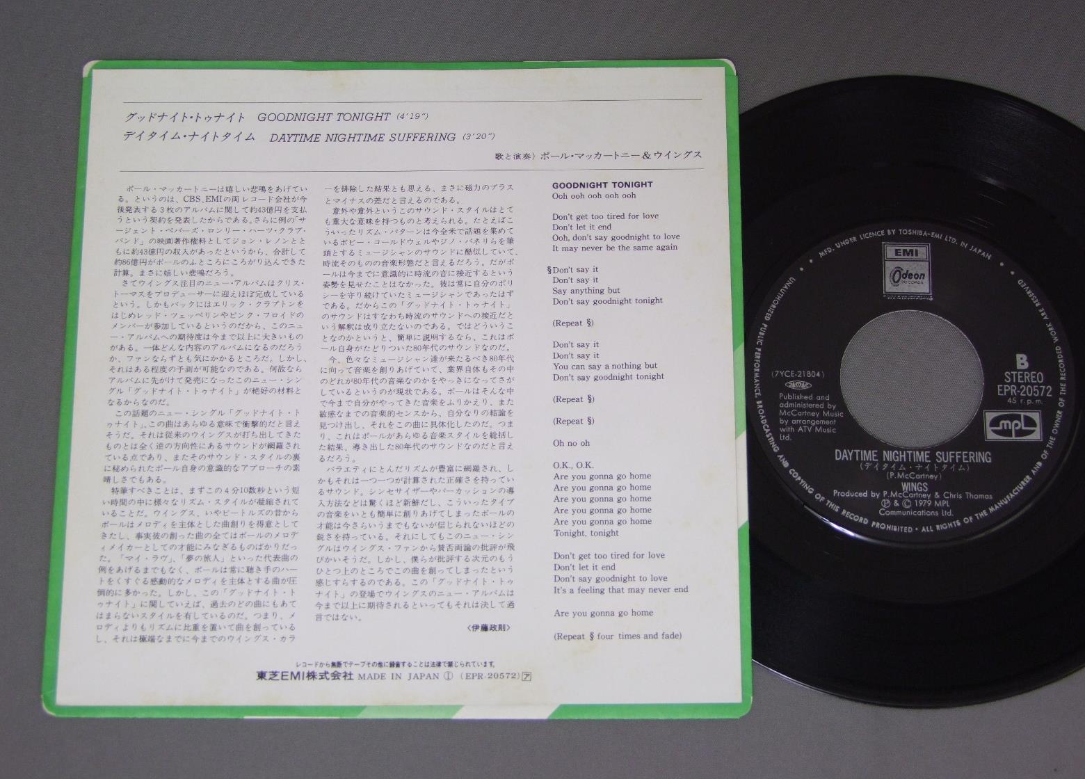 WINGSウイングス/GOODNIGHT TONIGHTグッドナイト・トゥナイト EPR20572 製造国:日本盤 / Media:7inch外観:EX盤の状態:EX+ 価格(税込):¥660 送料 7inch:定形外郵便 360円~LP:定形外郵便 660円~送料は、注文の最終画面で確認頂けます。 > > WINGS/GOODNIGHT TONIGHT 外観 (EX)特記事項:裏ジャケに薄いシミあり。外観EXの共通説明:ダメージが限定的。中古品としては保存状態がよい方。シミ、ヨゴレ、スレ 少し~軽度。 盤の状態 (EX+)特記事項:極薄いスリキズ・スレ少し。一見してきれいな状態です。盤EX+の共通説明:盤面の極薄いスリキズ、スレ少し程度 音に出そうなものは無いように見える(極軽微なソフトティック音は除く)。 Tweet それぞれの画像をクリックすると、大きい写真が見られます こちらの商品もお勧めです 1,650円 GEORGE HARRISONジョージ・ハリスン / DARK HORSEダーク・ホース 1,650円 GEORGE HARRISONジョージ・ハリソン / EXTRA TEXTUREジョージ・ハリソン帝国 770円 WINGSポール・マッカートニー&ウイングス / VENUS AND MARSヴィーナス・アンド・マース 880円 PAUL MCCARTNEYポール・マッカートニー / TUG OF WARタッグ・オブ・ウォー 770円 PAUL MCCARTNEY&WINGSポール・マッカートニー&ウイングス / BAND ON THE RUNバンド・オン・ザ・ラン 880円 WINNGSウイングス / VENUS AND MARS WIGSヴィーナス・アンド・マース 1,210円 WINGSウィングス / WINGS OVER AMERICAウィングスU.S.A ライヴ 770円 PAUL MCCARTNEY & WINGSポール・マッカートニー & ウイングス / WINGS AT THE SPEED OF SOUNDスピード・オヴ・サウンド