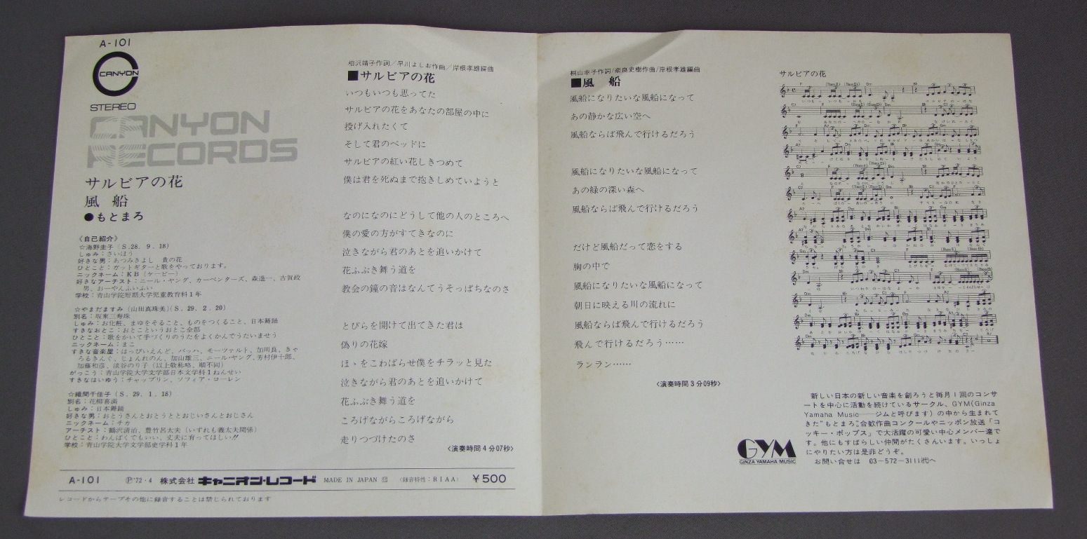 MOTOMAROもとまろ/サルビアの花 A101 製造国:日本盤 / Media:7inch外観:EX-盤の状態:EX+ 価格(税込):¥440(売約済) 送料 7inch:定形外郵便 360円~LP:定形外郵便 660円~送料は、注文の最終画面で確認頂けます。 > > MOTOMARO/ 外観 (EX-)特記事項:見開きや裏側に薄いシミ。表ジャケはそうでも無い感じ。外観EX-の共通説明:ダメージ軽度~多少。 中古品としては普通の状態。シミ、ヨゴレ、スレなど軽く~多少。 盤の状態 (EX+)特記事項:極薄いスリキズ・スレ少し。一見してきれいな状態です。盤EX+の共通説明:盤面の極薄いスリキズ、スレ少し程度 音に出そうなものは無いように見える(極軽微なソフトティック音は除く)。 Tweet それぞれの画像をクリックすると、大きい写真が見られます こちらの商品もお勧めです 2,200円 YUTAKA SADOYAMA佐渡山豊 / MOTTO CHIKAKUHEもっと近くへ 1,980円 JIRO`Sジローズ / BRAND NEW SONGS JORO`S 2新しい唄 ジローズ 2 1,650円 ITSUTSUNO AKAI FUSEN五つの赤い風船 / 2nd ALBUMフォーク・アルバム第2集 2,200円 FLUID古井戸 / FLUID VOL.4四季の詩 770円 SHIGERU IZUMIYA泉谷しげる / GOLD RUSH黄金狂時代 770円 KATSUYUKI MIYAZAWA宮沢勝之 / LIVE IN KIYOSE 81 AUTOGRAPHED陽気に生きようこの人生をさ LIVE IN 清瀬 サイン付 1,760円 TAKASHI NISHIOKA西岡たかし / LIFEらいふ 3,080円 UTANOICHI唄の市 / 2nd ALBUMセカンド
