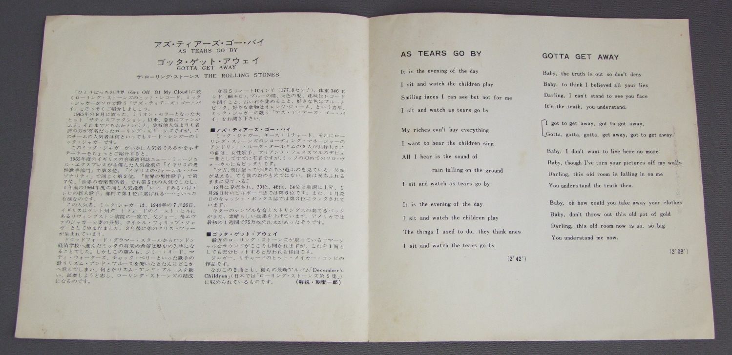 ROLLING STONESローリング・ストーンズ/AS TEARS GO BYアズ・ティアーズ・ゴー・バイ TOP1013 製造国:日本盤 / Media:7inch外観:EX-盤の状態:VG+ 価格(税込):¥3,300(売約済) 送料 7inch:定形外郵便 360円~LP:定形外郵便 660円~送料は、注文の最終画面で確認頂けます。 > > ROLLING STONES/AS TEARS GO BY 外観 (EX-)特記事項:見開きや裏ジャケにシミ。外観EX-の共通説明:ダメージ軽度~多少。 中古品としては普通の状態。シミ、ヨゴレ、スレなど軽く~多少。 盤の状態 (VG+)特記事項:薄いスリキズ・細かいスレ多少。全体的には軽微なものが中心です。少し聴いてみましたが、音自体はしっかりクリアーに鳴っているようでした。盤VG+の共通説明:盤面にスリキズが多少~やや有り、音に出そうなものも多少ある。 Tweet それぞれの画像をクリックすると、大きい写真が見られます こちらの商品もお勧めです 770円 MICK JAGGERミック・ジャガー / SHE`S THE BOSSシーズ・ザ・ボス