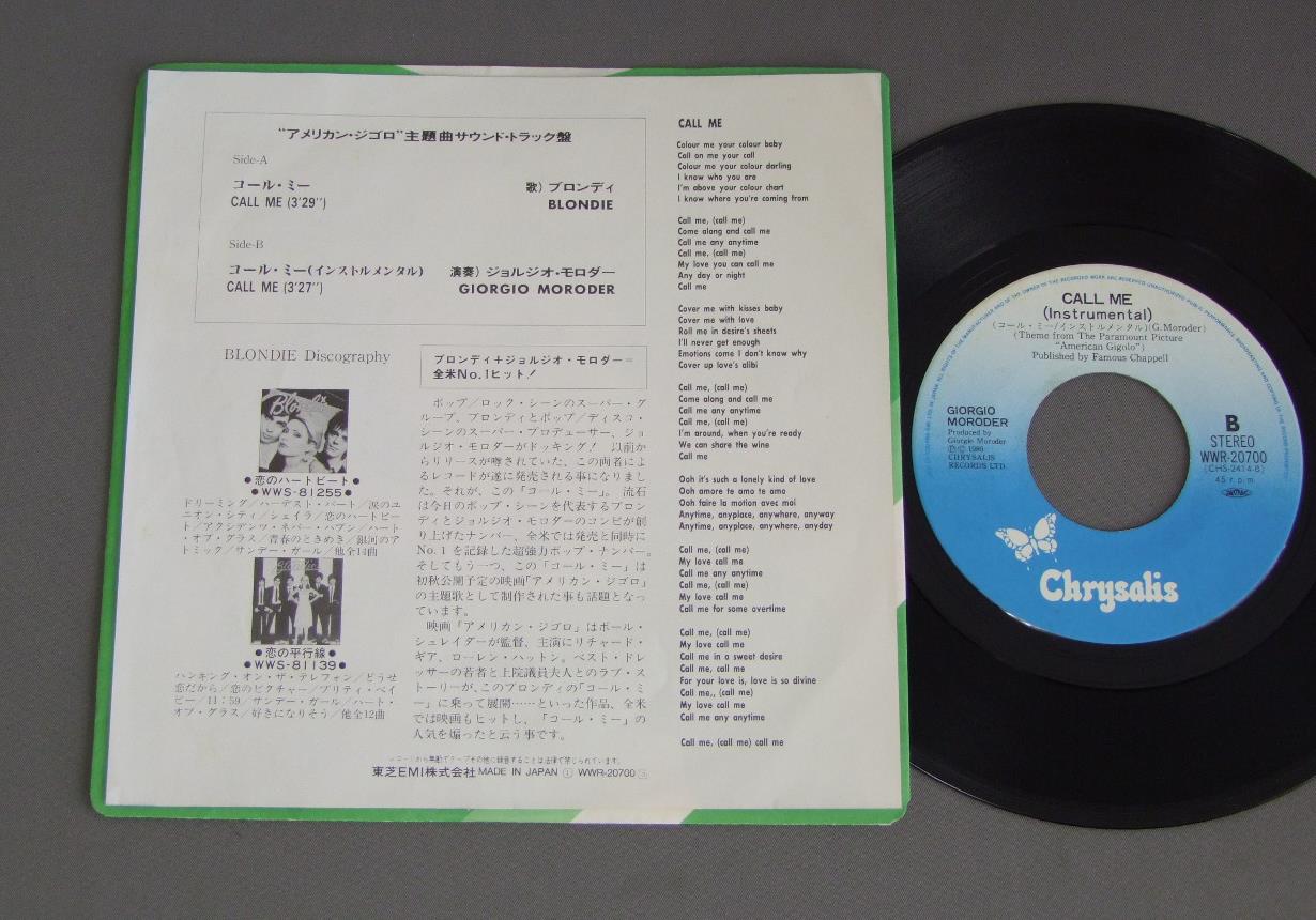 BLONDIEブロンディ/CALL ME映画「アメリカン・ジゴロ」 コール・ミー WWR20700 製造国:日本盤 / Media:7inch外観:EX+盤の状態:EX+ 価格(税込):¥660(売約済) 送料 7inch:定形外郵便 360円~LP:定形外郵便 660円~送料は、注文の最終画面で確認頂けます。 > > BLONDIE/CALL ME 外観 (EX+)特記事項:特記なし。外観EX+の共通説明:中古としては美品、一見してきれいでダメージが軽微。シミ、ヨゴレ、スレ有っても僅か~少し。 盤の状態 (EX+)特記事項:極薄いスリキズ・スレ少し。一見してきれいな状態です。盤EX+の共通説明:盤面の極薄いスリキズ、スレ少し程度 音に出そうなものは無いように見える(極軽微なソフトティック音は除く)。 Tweet それぞれの画像をクリックすると、大きい写真が見られます こちらの商品もお勧めです 1,320円 ADAM AND THE ANTSアダム&ジ・アンツ / KINGS OF THE WILD FRONTIERアダムの王国 1,320円 DEAD OR ALIVEデッド・オア・アライヴ / YOUTHQUAKEユースクエイク 1,320円 CULTURE CLUBカルチャー・クラブ / COLOUR BY NUMBERSカラー・バイ・ナンバーズ 1,320円 BLONDIEブロンディ / AUTOAMERICANオート・アメリカン 1,320円 ELVIS COSTELLOエルヴィス・コステロ / GOODBYE CRUEL WORLDグッバイ・クルエル・ワールド 1,320円 DOOL BY DOOLドール・バイ・ドール / GYPSY BLOODジプシー・ブラッド 880円 SNIFF `N` THE TEARSスニッフ&ザ・ティアーズ / LOVE ACTION夜の眩暈 1,210円 ULTRAVOXウルトラヴォックス / NEW EUROPEANS新欧州人