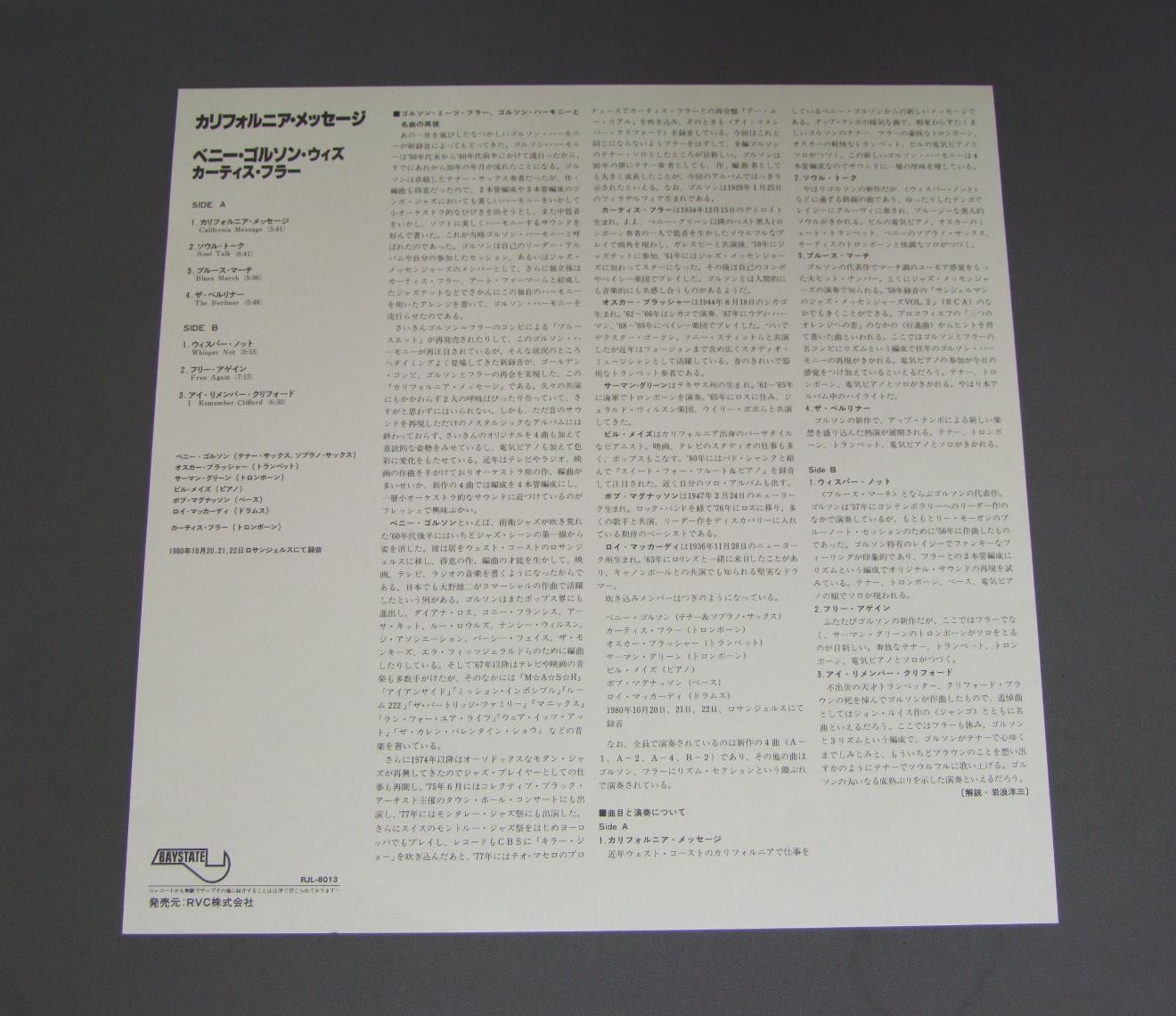 BENNY GOLSON/CALIFORNIA MESSAGE RJL8013 製造国:日本盤 / Media:LP外観:EX盤の状態:EX+ 価格(税込):¥660(売約済) 送料 7inch:定形外郵便 360円~LP:定形外郵便 660円~送料は、注文の最終画面で確認頂けます。 > > BENNY GOLSON/CALIFORNIA MESSAGE 外観 (EX)特記事項:特記なし。外観EXの共通説明:ダメージが限定的。中古品としては保存状態がよい方。シミ、ヨゴレ、スレ 少し~軽度。 盤の状態 (EX+)特記事項:薄いスリキズ・スレ少し。一見してきれいな状態です。盤EX+の共通説明:盤面の極薄いスリキズ、スレ少し程度 音に出そうなものは無いように見える(極軽微なソフトティック音は除く)。 Tweet それぞれの画像をクリックすると、大きい写真が見られます こちらの商品もお勧めです 770円 RICHARD RODNEY BENNETTリチャード・ロドニー・ベネット / I GOT RHYTHMアイ・ゴット・リズム 770円 JACQUES LOUSSIER TRIOジャック・ルーシェ・トリオ / PLAY BACH VOL4プレイ・バッハ第4集 1,320円 JOHN COLTRANE & WILBURN HARDENジョン・コルトレーン&ウィルバー・ハーディン / MAINSTREAM 1958メインストリーム1958 1,210円 EDDIE CONDONエディ・コンドン楽団 / ERA OF CONDON JAZZ栄光のコンドン・ジャズ 1,210円 OSCAR PETERSONオスカー・ピーターソン / BLUES ETUDEジャズ・ピアノの真髄 770円 MATT DENNIS & RED NORVOマット・デニス & レッド・ノーヴォ / SOME OF MY FAVORITESサム・オブ・マイ・フェイバリッツ 1,320円 SONNY CLARK TRIOソニー・クラーク・トリオ / SAME TITEL 1,320円 HERBIE MANNハービー・マン楽団 / ST.THOMAS 60s ISSUEセント・トーマス ペラジャケ