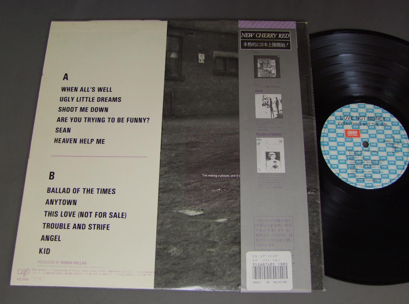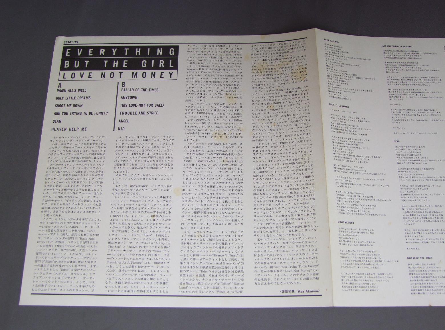 EVERYTHING BUT THE GIRLエヴリシング・バット・ザ・ガール/LOVE NOT MONEYラヴ・ノット・マネー 35501 25 製造国:日本盤 / Media:LP外観:EX盤の状態:EX+帯:EX- 価格(税込):¥1,980(売約済) 送料 7inch:定形外郵便 360円~LP:定形外郵便 660円~送料は、注文の最終画面で確認頂けます。 > > EVERYTHING BUT THE GIRL/LOVE NOT MONEY 外観 (EX)特記事項:表裏ジャケ共に薄いシミが少し。外観EXの共通説明:ダメージが限定的。中古品としては保存状態がよい方。シミ、ヨゴレ、スレ 少し~軽度。 盤の状態 (EX+)特記事項:極薄いスリキズ・スレ少し。一見してきれいな状態です。盤EX+の共通説明:盤面の極薄いスリキズ、スレ少し程度 音に出そうなものは無いように見える(極軽微なソフトティック音は除く)。 帯の状態 (EX-):シミ軽多少有り。 Tweet それぞれの画像をクリックすると、大きい写真が見られます こちらの商品もお勧めです 770円 NENAネーナ / ? (FRAGEZEICHEN)? (クエスチョンマーク) 660円 CULTURE CLUBカルチャー・クラブ / KISSING TO BE CLEVER 770円 MEN AT WORKメン・アット・ワーク / BUSINESS AS USUALワーク・ソングズ 770円 CHEAP TRICKチープ・トリック / AT BUDOKANAT 武道館 770円 CHEAP TRICKチープ・トリック / HEAVEN TONIGHT天国の罠 770円 TAZMANIAN DEVILSタズマニアン・デヴィルズ / アメリカン・ドリームを探して 770円 CULTURE CLUBカルチャー・クラブ / WAR SONG戦争のうた 1,320円 TAZMANIAN DEVILSタズマニアン・デヴィルズ / TAZMANIAN DEVILSアメリカン・ドリームを探して