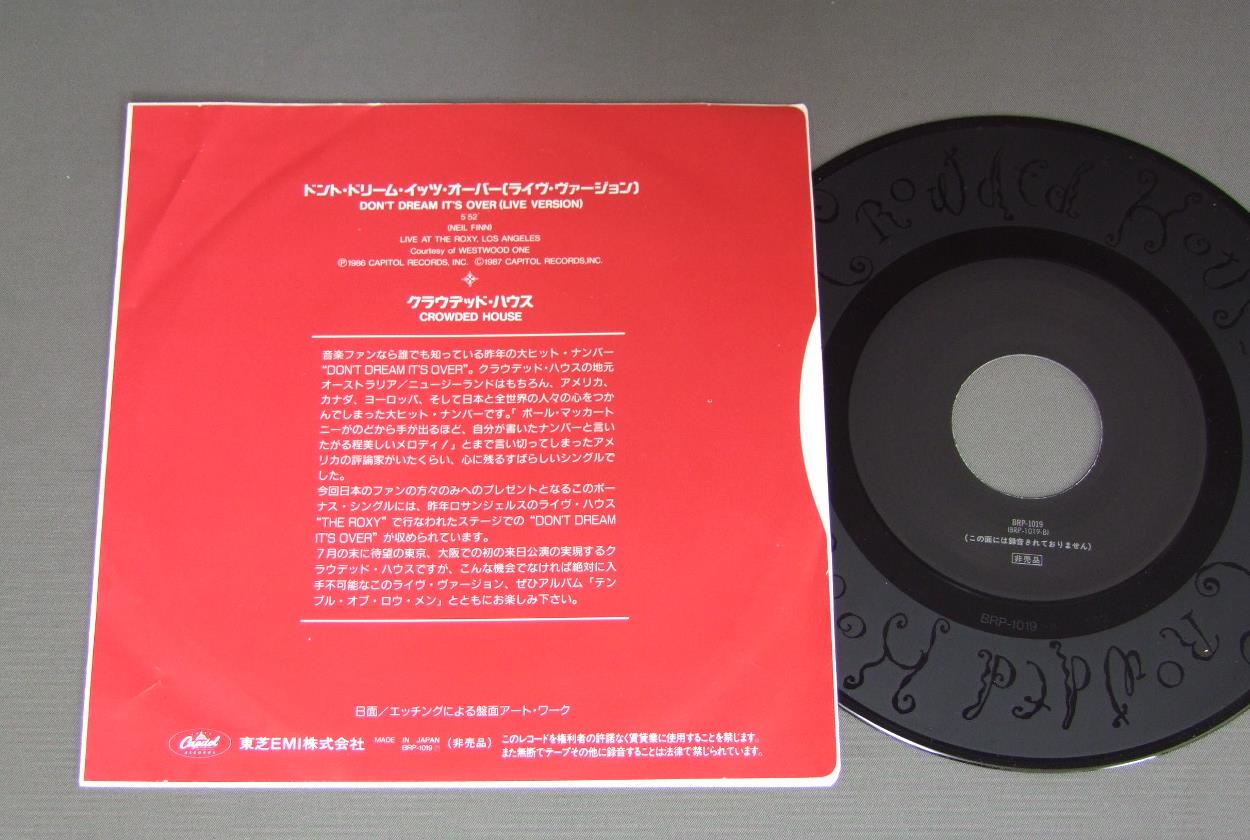 CROWDED HOUSEクラウデッド・ハウス/DON`T DREAM IT`S OVER(LIVE VERSION) ONE SIDE SINGLE見本盤片面シングル BRP1019 製造国:日本盤 / Media:7inch外観:EX盤の状態:EX+ 価格(税込):¥1,100(売約済) 送料 7inch:定形外郵便 360円~LP:定形外郵便 660円~送料は、注文の最終画面で確認頂けます。 > > CROWDED HOUSE/DON`T DREAM IT`S OVER(LIVE VERSION) ONE SIDE SINGLE 外観 (EX)特記事項:多少ヨレ有り。外観EXの共通説明:ダメージが限定的。中古品としては保存状態がよい方。シミ、ヨゴレ、スレ 少し~軽度。 盤の状態 (EX+)特記事項:薄いスリキズ・スレ少し。一見してきれいな状態です。盤EX+の共通説明:盤面の極薄いスリキズ、スレ少し程度 音に出そうなものは無いように見える(極軽微なソフトティック音は除く)。 その他:見本盤 Tweet それぞれの画像をクリックすると、大きい写真が見られます こちらの商品もお勧めです 1,320円 TAZMANIAN DEVILSタズマニアン・デヴィルズ / TAZMANIAN DEVILSアメリカン・ドリームを探して 550円 BOOM CRASH OPERAブーム・クラッシュ・オペラ / GREAT WALLグレイト・ウォール 1,320円 NENAネーナ / NENAロックバルーンは99 440円 SCREAMING BLUE MESSIAHSスクリーミング・ブルー・メサイアズ / BIKINI REDビキニ・レッド 440円 GLASS TIGERグラス・タイガー / DIAMOND SUNダイヤモンド・サン 550円 TOUCH / TOUCH 662円 ISLE OF MANアイル・オブ・マン / ISLE OF MANアイル・オブ・マン 550円 HUNG CHUNGワン・チャン / HUNG CHUNGダンス・ホール・デイズ