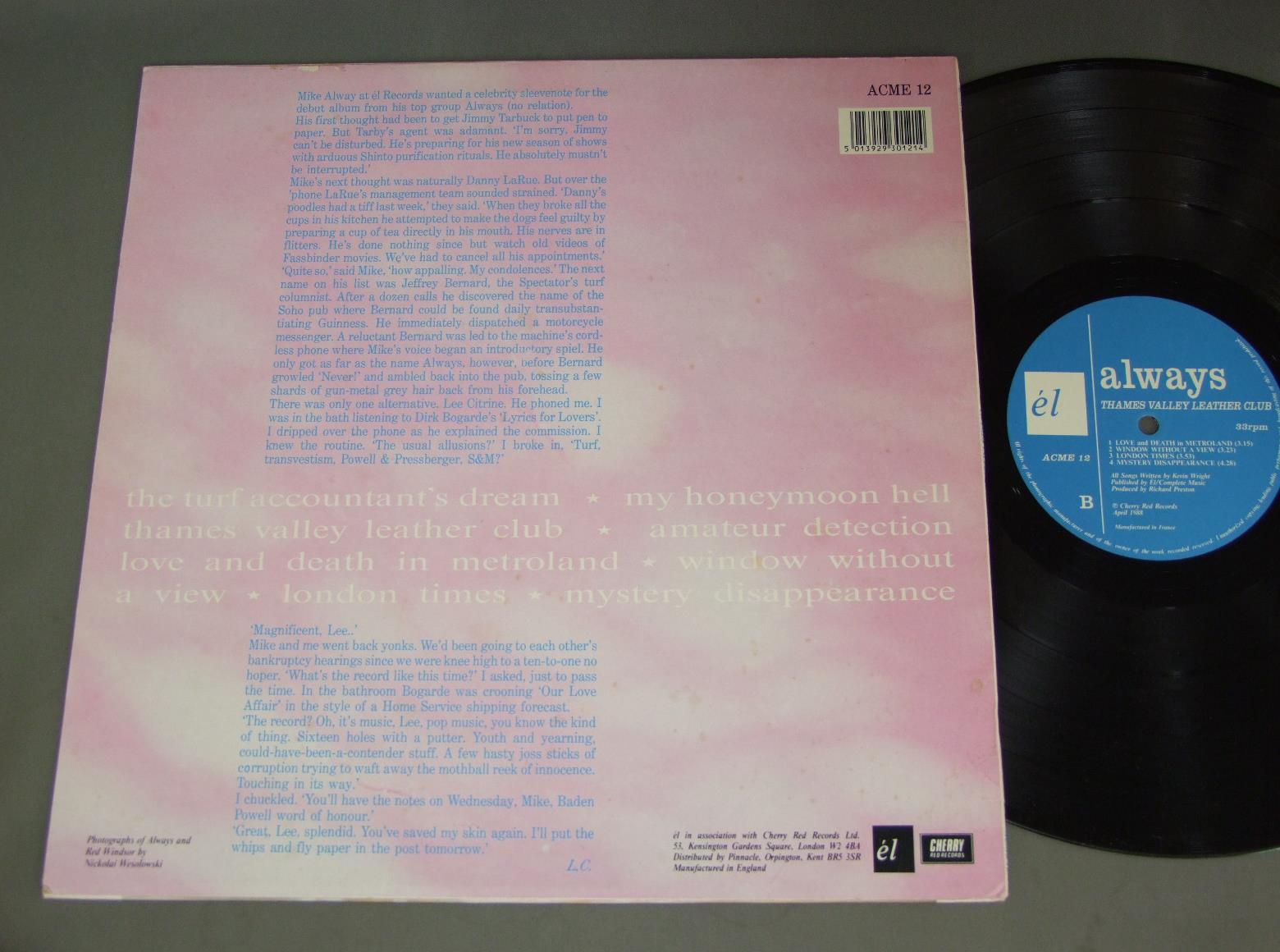 THAMES VALLEY LEATHER CLUB/ALWAYS ACME12 製造国:仏盤 / Media:LP外観:EX-盤の状態:EX 価格(税込):¥3,435(売約済) 送料 7inch:定形外郵便 360円~LP:定形外郵便 660円~送料は、注文の最終画面で確認頂けます。 > > THAMES VALLEY LEATHER CLUB/ALWAYS 外観 (EX-)特記事項:表裏ジャケ共にシミやや有り。外観EX-の共通説明:ダメージ軽度~多少。 中古品としては普通の状態。シミ、ヨゴレ、スレなど軽く~多少。 盤の状態 (EX)特記事項:薄いスリキズ・スレ軽くある感じ。軽微なものの様子です。盤EXの共通説明:盤面のスリキズが薄いものが少し~軽度 音に出そうなものは無いように見える(軽微なソフトティック音は除く)。 Tweet それぞれの画像をクリックすると、大きい写真が見られます こちらの商品もお勧めです 1,100円 INNCONTROLLABILE SERPENTI / BIANCANEVE E GORBACIOV 440円 ART COMPANY / GET IT OUT OF YOUR HEAD 1,320円 UNTOUCHABLES / WILD CHILD 770円 CLASSIX NOUVEAUX / CLASSIX NOUVEAUX 440円 STEEL BREEZE / STEEL BREEZE 660円 THOMPSON TWINS / HERE`S TO FUTURE DAYS 1,650円 FRONT / UNDERWORLD 550円 FIRE FALL / UNDERTOW