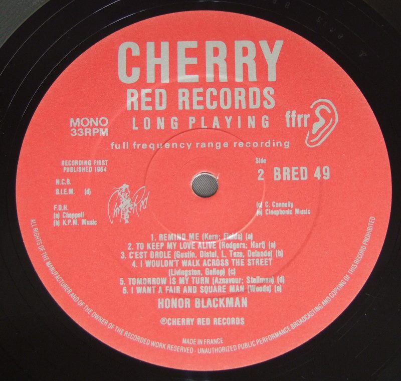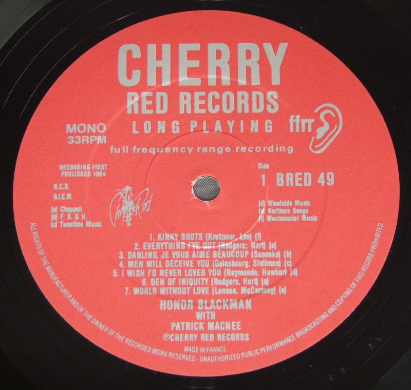 HONOR BLACKMAN WITH PATRICK MACNEE/EVERYTHING I`VE GOTCHERRY RED再発盤 BRED49 製造国:英国盤 / Media:LP外観:EX+盤の状態:EX 価格(税込):¥4,400(売約済) 送料 7inch:定形外郵便 360円~LP:定形外郵便 660円~送料は、注文の最終画面で確認頂けます。 > > HONOR BLACKMAN WITH PATRICK MACNEE/EVERYTHING I`VE GOT 外観 (EX+)特記事項:表裏ジャケ共に厚手のコーティング仕様。ジャケ表面は全体的にスレやスリキズ、よごれ等はあまりない感じ。外観EX+の共通説明:中古としては美品、一見してきれいでダメージが軽微。シミ、ヨゴレ、スレ有っても僅か~少し。 盤の状態 (EX)特記事項:極薄いスリキズ・スレ少しある程度。音に出そうなものもなく一見してきれいな状態です。曲間など、静かなところを中心に聴いて見ましたが、チリノイズ少ないきれいな再生具合でした。盤EXの共通説明:盤面のスリキズが薄いものが少し~軽度 音に出そうなものは無いように見える(軽微なソフトティック音は除く)。 その他:オリジナル盤は64年デッカ盤 Tweet それぞれの画像をクリックすると、大きい写真が見られます こちらの商品もお勧めです 3,850円 NICO / THE END 4,950円 SANDY DENNY / RENDEZVOUS 5,060円 JONI MITCHELL / CHALK MARK IN A RAIN STORM 4,950円 JONI MITCHELL / DOG EAT DOG 7,700円 SUSAN MAUGHAN / I WANNA BE BOBBY`S GIRL 4,400円 JONI MITCHELL / DOG EAT DOG