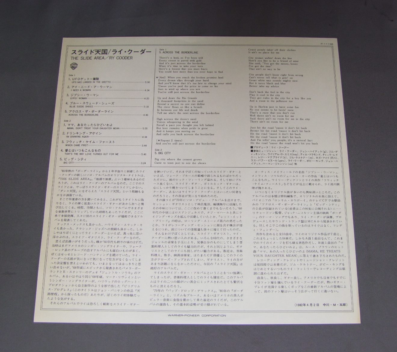 RY COODERライ・クーダー/SLIDE AREAスライド天国 P11136 製造国:日本盤 / Media:LP外観:EX盤の状態:EX+ 価格(税込):¥1,100(売約済) 送料 7inch:定形外郵便 360円~LP:定形外郵便 660円~送料は、注文の最終画面で確認頂けます。 > > RY COODER/SLIDE AREA 外観 (EX)特記事項:表ジャケにスレよごれ。表裏ジャケ共に背付近に日焼け。外観EXの共通説明:ダメージが限定的。中古品としては保存状態がよい方。シミ、ヨゴレ、スレ 少し~軽度。 盤の状態 (EX+)特記事項:極薄いスリキズ・スレ少し。一見してきれいな状態です。盤EX+の共通説明:盤面の極薄いスリキズ、スレ少し程度 音に出そうなものは無いように見える(極軽微なソフトティック音は除く)。 その他:白見本盤 Tweet それぞれの画像をクリックすると、大きい写真が見られます こちらの商品もお勧めです 770円 BOZ SCAGGSボズ・スキャッグス / DOWN TWO THEN LEFTダウン・トゥー・ゼン・レフト 770円 CAT STEVENSキャット・スティーヴンス / CATCH BULL AT FOURキャッチ・ブル・アット・フォー 880円 NEIL DIAMONDニール・ダイアモンド / NEIL DIAMONDアイム・ア・ビリーバー 770円 CHARLES AZNAVOURシャルル・アズナヴール / LA MAMMAラ・マンマ 770円 TOM ROBINSONトム・ロビンソン / STILL LOVING YOUスティル・ラヴィング・ユー 1,320円 NEIL DIAMONDニール・ダイアモンド / HOT AUGUST NIGTグリーク・シアター・コンサート 1,210円 ADAMOアダモ / ALL ABOUT ADAMO DELUXE DOUBLEデラックス・ダブル アダモのすべて 1,210円 TIM GOODMANティム・グッドマン / FOOTSTEPSフリーダム・ストリート