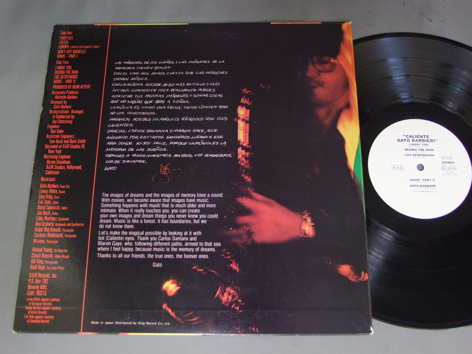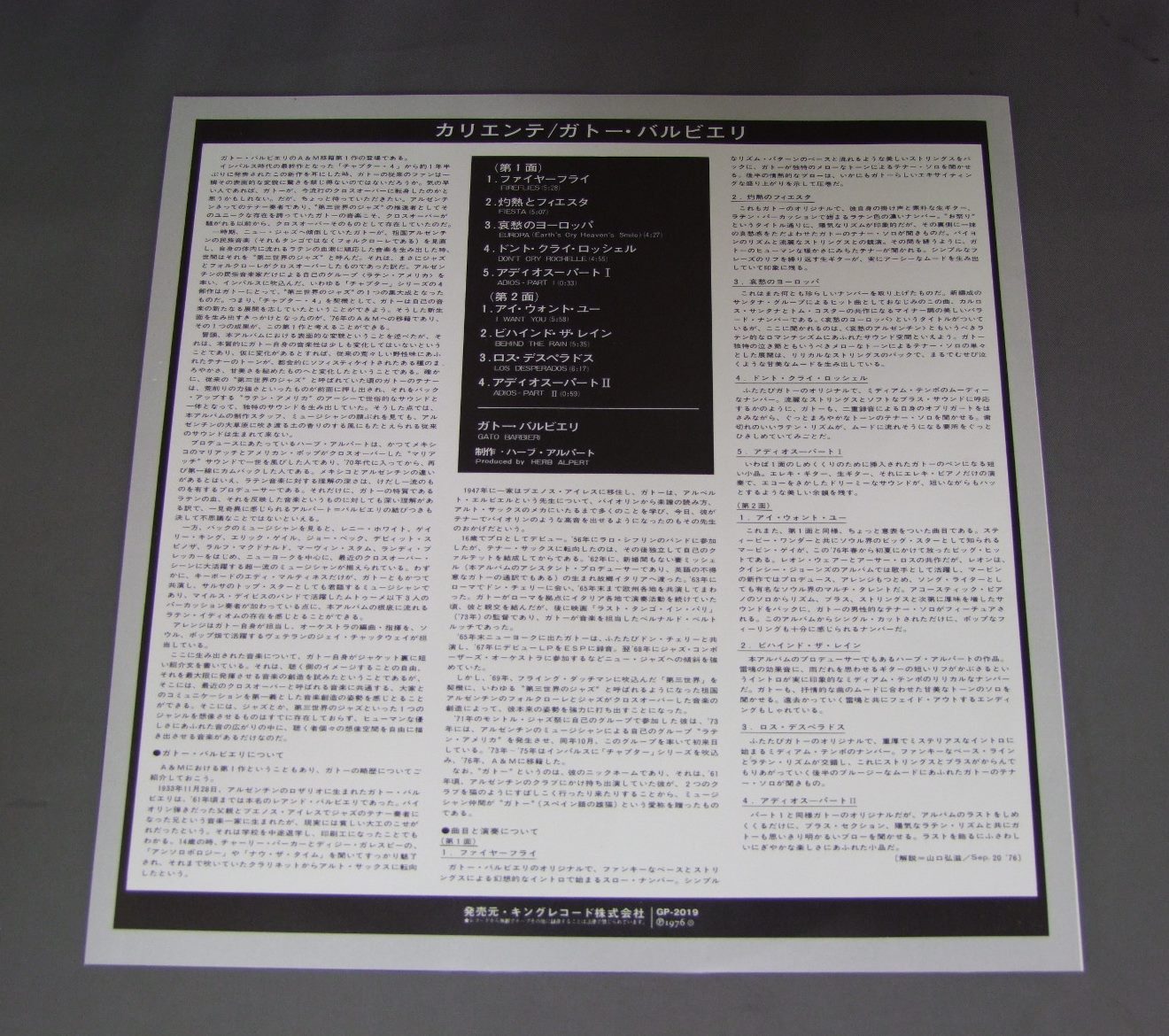 GATO BARBIERI/CALIENTE!カリエンテ GP2019 製造国:日本盤 / Media:LP外観:EX盤の状態:EX+ 価格(税込):¥1,320(売約済) 送料 7inch:定形外郵便 360円~LP:定形外郵便 660円~送料は、注文の最終画面で確認頂けます。 > > GATO BARBIERI/CALIENTE! 外観 (EX)特記事項:上下ヘリスレ多少有り。外観EXの共通説明:ダメージが限定的。中古品としては保存状態がよい方。シミ、ヨゴレ、スレ 少し~軽度。 盤の状態 (EX+)特記事項:極薄いスリキズ・スレ少し。一見してきれいな状態です。盤EX+の共通説明:盤面の極薄いスリキズ、スレ少し程度 音に出そうなものは無いように見える(極軽微なソフトティック音は除く)。 その他:白見本盤 Tweet それぞれの画像をクリックすると、大きい写真が見られます こちらの商品もお勧めです 3,300円 EDDIE CONDON ALL STARSエディ・コンドン・オール・スターズ / EDDIE CONDON ALL STARS 1945 5LP BOX SETエディ・コンドン・オール・スターズ1945 5枚組 1,210円 OSCAR PETERSONオスカー・ピーターソン / BLUES ETUDEジャズ・ピアノの真髄 880円 EUGENE CICEROオイゲン・キケロ / 3 GREAT ARTISTSスリー・グレイト・アーティスト 990円 GARY BURTONゲイリー・バートン / ALONE AT LASTアローン・アット・ラスト 1,210円 BUCK CLAYTONバック・クレイトン / PASSORT TO PARADISEスポート・トゥ・パラダイス 990円 MEL POWELLメル・パウエル / OUT ON A LIMBアウト・オン・ア・リム 1,210円 RED NICHOLS & HIS FIVE PENNIESレッド・ニコルスとファイブ・ペニーズ / RED NICHOLS STORYレッド・ニコルス物語 660円 KAZUMI BAND香津美バンド / TALK YOU ALL TIGHT頭狂好児唐眼