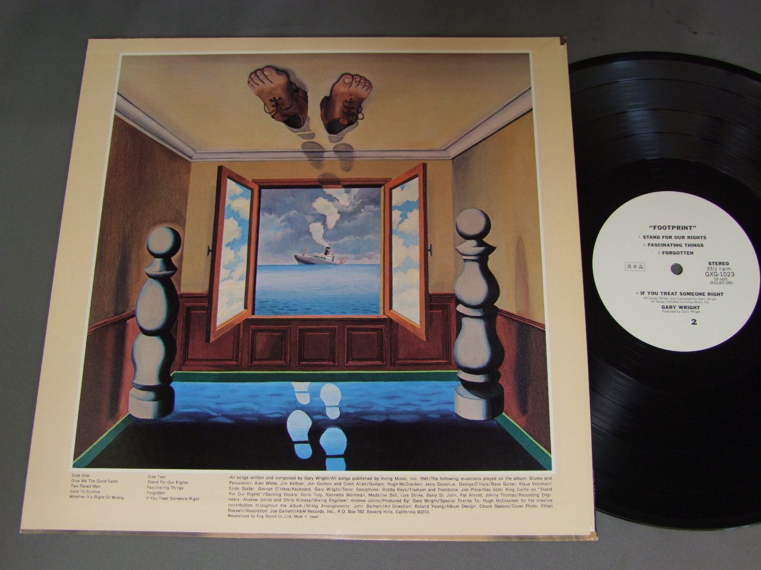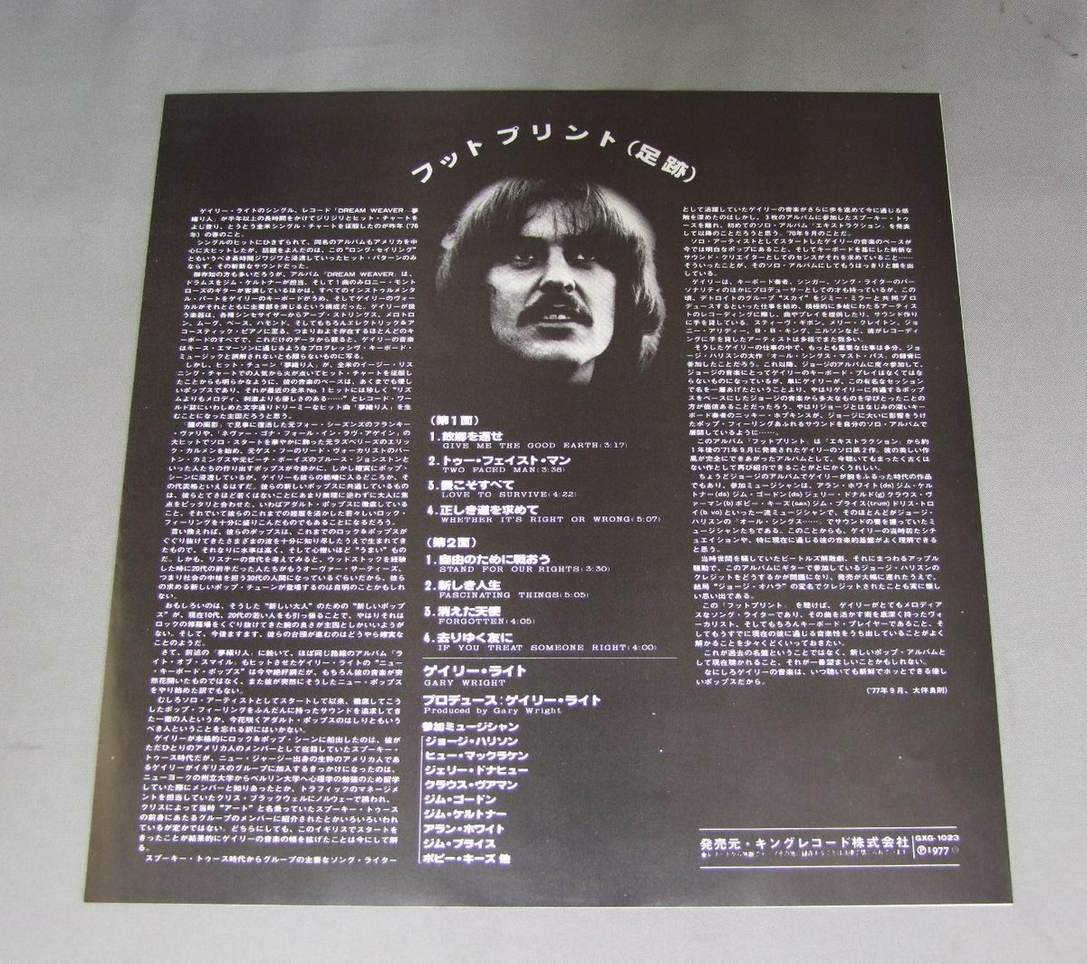GARY WRIGHT/FOOTPRINT足跡 GXG1023 製造国:日本盤 / Media:LP外観:EX+盤の状態:EX+ 価格(税込):¥1,320(売約済) 送料 7inch:定形外郵便 360円~LP:定形外郵便 660円~送料は、注文の最終画面で確認頂けます。 > > GARY WRIGHT/FOOTPRINT 外観 (EX+)特記事項:特記なし。外観EX+の共通説明:中古としては美品、一見してきれいでダメージが軽微。シミ、ヨゴレ、スレ有っても僅か~少し。 盤の状態 (EX+)特記事項:極薄いスリキズ・スレ少し。一見してきれいな状態です。盤EX+の共通説明:盤面の極薄いスリキズ、スレ少し程度 音に出そうなものは無いように見える(極軽微なソフトティック音は除く)。 その他:白見本盤 Tweet それぞれの画像をクリックすると、大きい写真が見られます こちらの商品もお勧めです 440円 JOHNNY MATHISジョニー・マチス / LOVE IS BLUE恋はみずいろ 990円 SHAUN CASSIDYショーン・キャシディ / ROOM SERVICEルーム・サーヴィス 770円 YVES MONTANDイヴ・モンタン / WONDERFUL MELODIESイヴ・モンタン・ヒット集 770円 JOHN DENVERジョン・デンバー / BACK HOME AGAINバック・ホーム・アゲイン 990円 CLIFF RICHARDクリフ・リチャード / DELUXE IN CLIFF RICHARDデラックス イン クリフ・リチャード 770円 HUBERT KAHヒューバート・カー / ANGEL 07エンジェル07 770円 ELTON JOHNエルトン・ジョン / SINGLE MANシングル・マン 1,650円 ELTON JOHNエルトン・ジョン / ELTON JOHNエルトン・ジョン