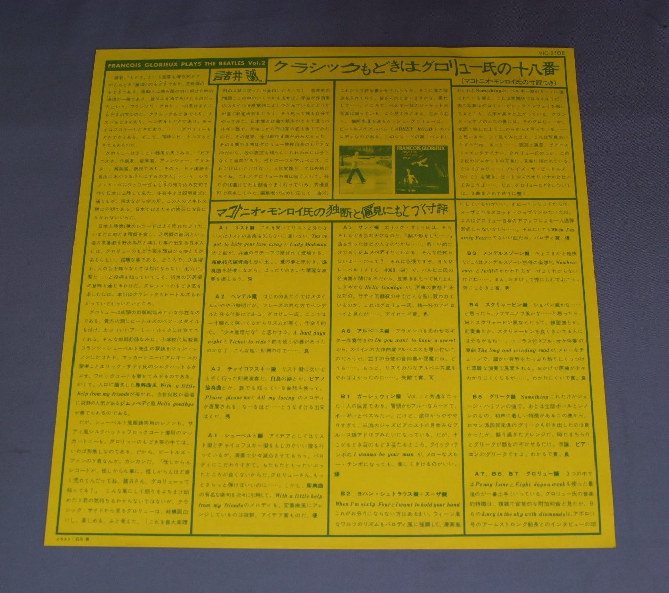 FRANCOIS GLORIEUXフランソワ・グロリュー/FRANCOIS GLORIEUX PLAYS THE BEATLES VOL.2驚異の才人グロリュー. ビートルズを弾く VOL.2 VIC2108 製造国:日本盤 / Media:LP外観:EX盤の状態:EX+帯:EX- 価格(税込):¥1,100(売約済) 送料 7inch:定形外郵便 360円~LP:定形外郵便 660円~送料は、注文の最終画面で確認頂けます。 > > FRANCOIS GLORIEUX/FRANCOIS GLORIEUX PLAYS THE BEATLES VOL.2 外観 (EX)特記事項:特記なし。外観EXの共通説明:ダメージが限定的。中古品としては保存状態がよい方。シミ、ヨゴレ、スレ 少し~軽度。 盤の状態 (EX+)特記事項:極薄いスリキズ・スレ少し。一見してきれいな状態です。盤EX+の共通説明:盤面の極薄いスリキズ、スレ少し程度 音に出そうなものは無いように見える(極軽微なソフトティック音は除く)。 帯の状態 (EX-):シミ有。 Tweet それぞれの画像をクリックすると、大きい写真が見られます こちらの商品もお勧めです 1,650円 GEORGE HARRISONジョージ・ハリスン / DARK HORSEダーク・ホース 770円 WINGSポール・マッカートニー&ウイングス / VENUS AND MARSヴィーナス・アンド・マース 880円 PAUL MCCARTNEYポール・マッカートニー / TUG OF WARタッグ・オブ・ウォー 880円 WINNGSウイングス / VENUS AND MARS WIGSヴィーナス・アンド・マース 1,650円 WINGSウィングス / OVER AMERICAUSAライブ 1,540円 WINGSポール・マッカートニーとウイングス / LONDON TOWN 770円 PAUL MCCARTNEY & WINGSポール・マッカートニー & ウイングス / WINGS AT THE SPEED OF SOUNDスピード・オヴ・サウンド 770円 PAUL MCCARTNEY&WINGSポール・マッカートニー&ウイングス / BAND ON THE RUNバンド・オン・ザ・ラン
