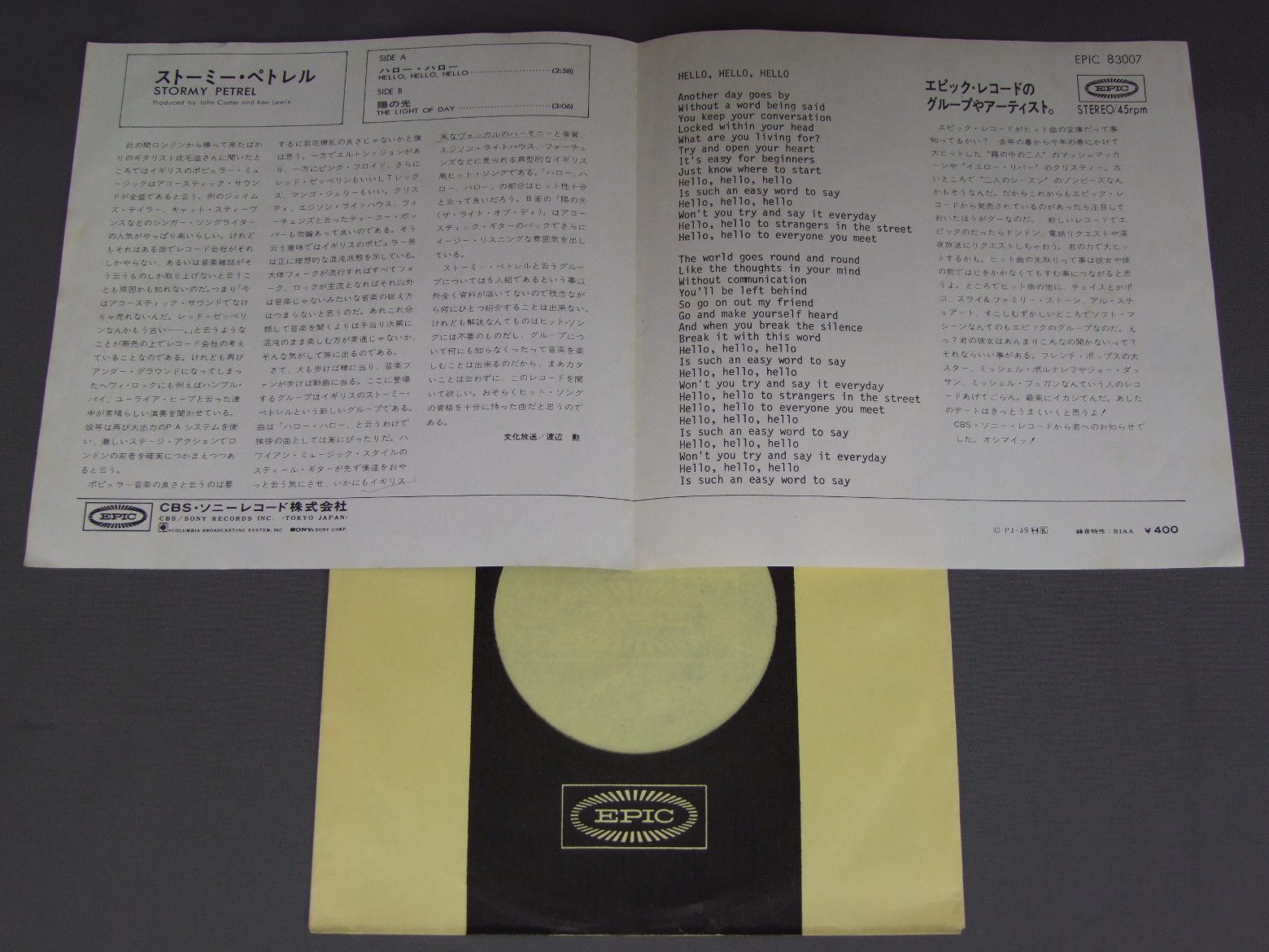STORMY PETRELストーミー・ペトレル/HELLO. HELLO. HELLOハロー・ハロー EPIC83007 製造国:日本盤 / Media:7inch外観:EX盤の状態:EX+ 価格(税込):¥550(売約済) 送料 7inch:定形外郵便 360円~LP:定形外郵便 660円~送料は、注文の最終画面で確認頂けます。 > > STORMY PETREL/HELLO. HELLO. HELLO 外観 (EX)特記事項:多少ヨレやスレ有。外観EXの共通説明:ダメージが限定的。中古品としては保存状態がよい方。シミ、ヨゴレ、スレ 少し~軽度。 盤の状態 (EX+)特記事項:極薄いスリキズ・スレ少し。一見してきれいな状態です。盤EX+の共通説明:盤面の極薄いスリキズ、スレ少し程度 音に出そうなものは無いように見える(極軽微なソフトティック音は除く)。 Tweet それぞれの画像をクリックすると、大きい写真が見られます こちらの商品もお勧めです 440円 BOB SEGER & THE SILVER BULLET BANDボブ・シーガー&ザ・シルバー・ブレット・バンド / DISTANCEディスタンス 770円 DOOBIE BROTHERS / WHAT WERE ONCE VICES ARE NOW HABITS 770円 5TH DIMENSIONフィフス・ディメンション / THE BESTベスト 1,320円 STYXスティクス / KILROY WAS HEREキルロイ・ワズ・ヒア 1,210円 EAGLESイーグルス / LONG RUNザ・ロング・ラン 880円 MARC TANNER BANDマーク・タナー・バンド / NO ESCAPEノー・エスケープ 770円 SANTANAサンタナ / FESTIVALフェスティバル 770円 STYXスティクス / CORNERSTONEコーナーストーン