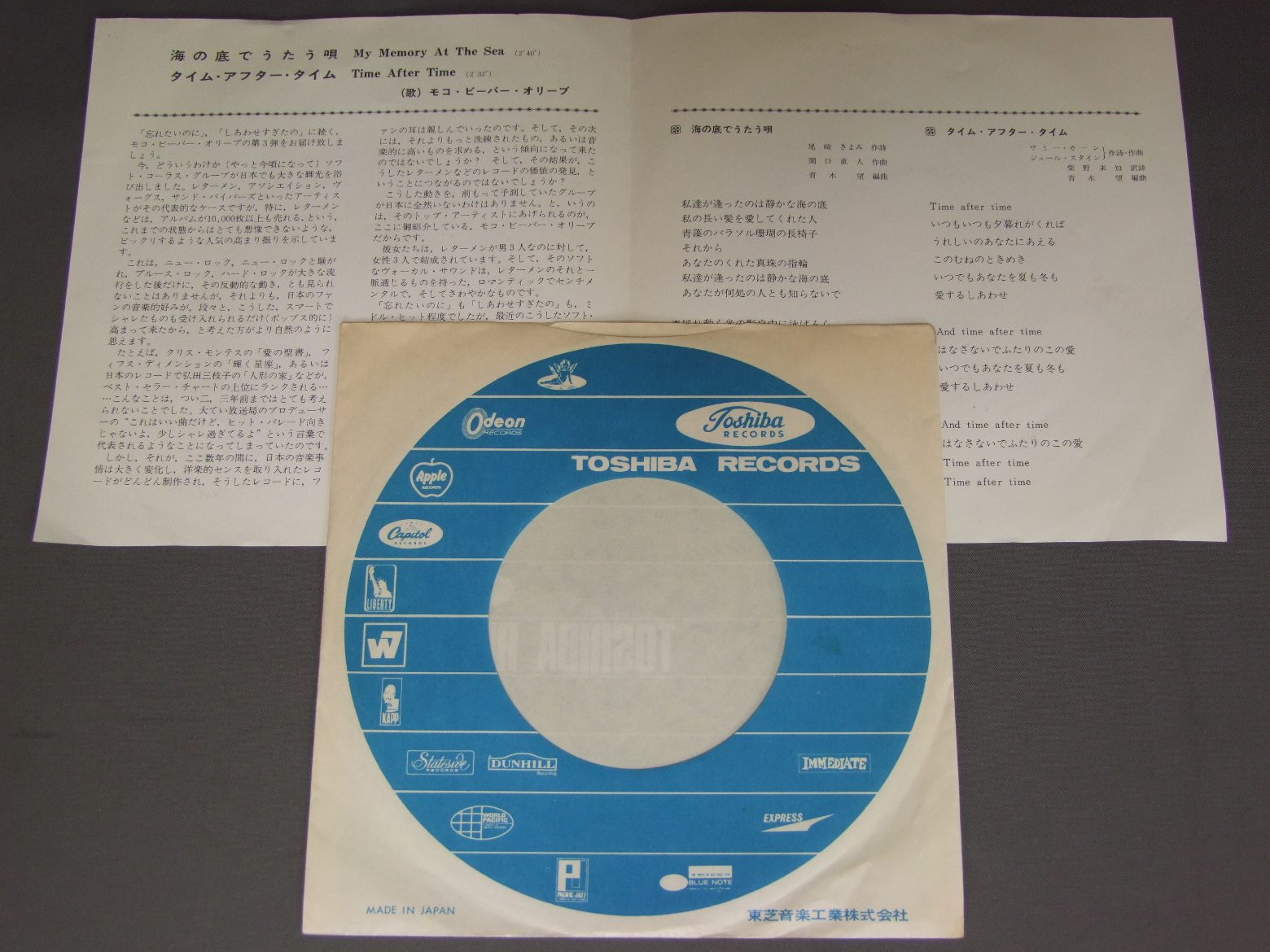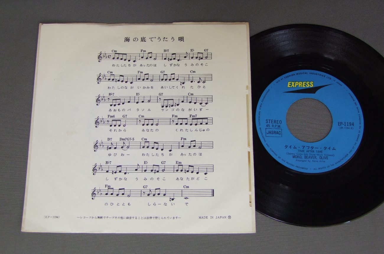 MOKO.BEAVER.OLIVEモコ・ビーバー・オリーブ/MY MEMORY AT THE SEA海の底でうたう唄 EP1194 製造国:日本盤 / Media:7inch外観:EX盤の状態:EX+ 価格(税込):¥1,320(売約済) 送料 7inch:定形外郵便 360円~LP:定形外郵便 660円~送料は、注文の最終画面で確認頂けます。 > > MOKO.BEAVER.OLIVE/MY MEMORY AT THE SEA 外観 (EX)特記事項:特記なし。外観EXの共通説明:ダメージが限定的。中古品としては保存状態がよい方。シミ、ヨゴレ、スレ 少し~軽度。 盤の状態 (EX+)特記事項:極薄いスリキズ・スレ少し。一見してきれいな状態です。盤EX+の共通説明:盤面の極薄いスリキズ、スレ少し程度 音に出そうなものは無いように見える(極軽微なソフトティック音は除く)。 Tweet それぞれの画像をクリックすると、大きい写真が見られます こちらの商品もお勧めです 1,210円 ALFIEアルフィー / GREENHORN ( VICTOR YEARS 1974-76 ) + OUTER COVERGREENHORN ( VICTOR YEARS 1974-76 ) + オリジナル外袋 1,210円 VARIOUS HANDICAPPED SINGERSたんぽぽの会 / INTERNATIONAL MUSIC FESTIVAL WATABOSHI小さな一歩 世界わたぼうし音楽祭 1,210円 RYOKO MORIYAMA森山良子 / IN NASHVILLEイン・ナッシュビル 770円 EPOエポ / PUMP ! PUMP ! 770円 CHIKA UEDA上田知華 / MISS HEARTミス・ハート 770円 YUZO KAYAMA加山雄三 / ALL ABOUT YUZO KAYAMA VOL2加山雄三の全て第2集 440円 OFF COURSEオフコース / THREE AND TWOスリー・アンド・トゥ 2,200円 HIKASUEヒカシュー / SUMMER夏