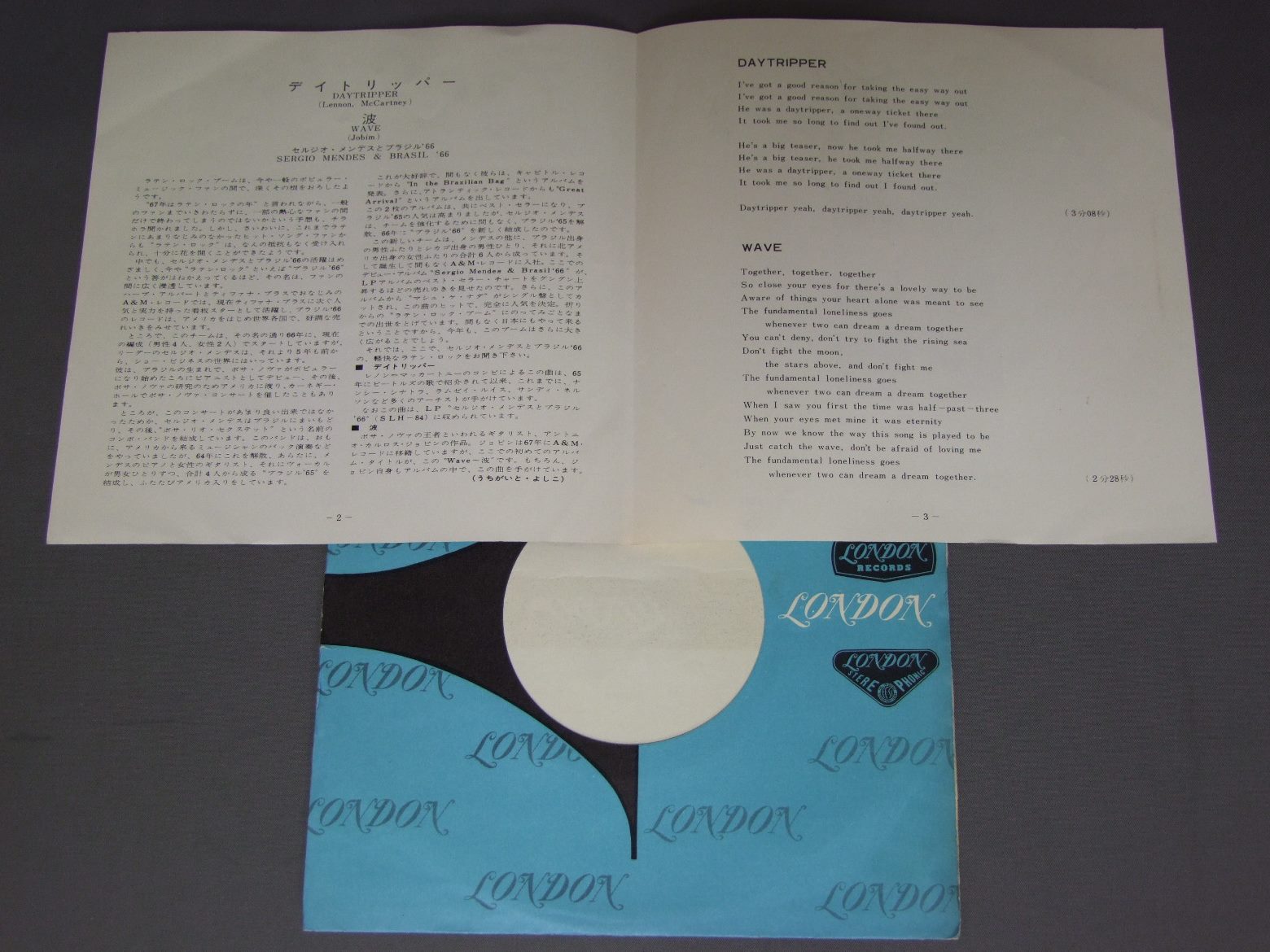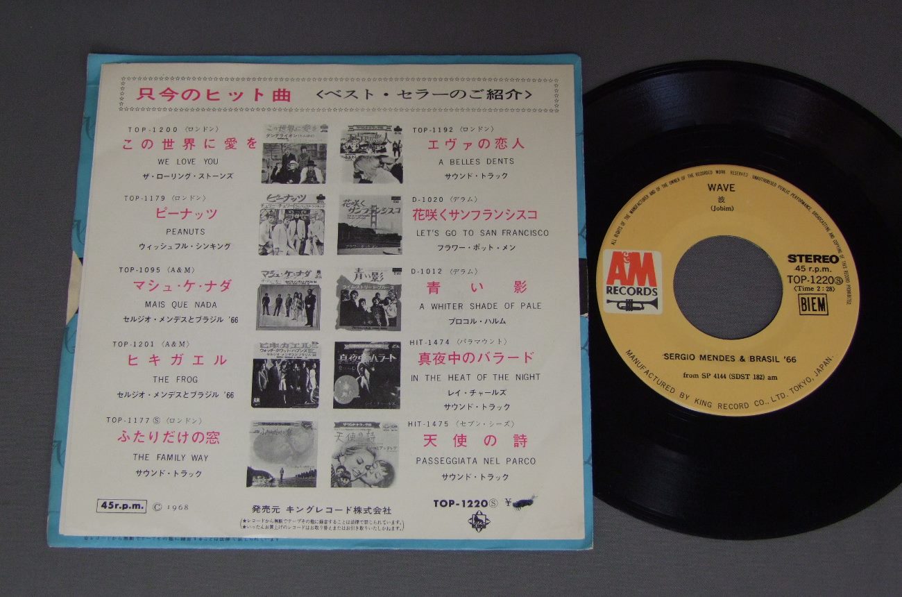 SERGIO MENDES & BRASIL `66セルジオ・メンデスとブラジル`66/DAYTRIPPERデイトリッパー TOP1220 製造国:日本盤 / Media:7inch外観:EX盤の状態:EX+ 価格(税込):¥550(売約済) 送料 7inch:定形外郵便 360円~LP:定形外郵便 660円~送料は、注文の最終画面で確認頂けます。 > > SERGIO MENDES & BRASIL `66/DAYTRIPPER 外観 (EX)特記事項:特記なし。外観EXの共通説明:ダメージが限定的。中古品としては保存状態がよい方。シミ、ヨゴレ、スレ 少し~軽度。 盤の状態 (EX+)特記事項:極薄いスリキズ・スレ少し。一見してきれいな状態です。盤EX+の共通説明:盤面の極薄いスリキズ、スレ少し程度 音に出そうなものは無いように見える(極軽微なソフトティック音は除く)。 Tweet それぞれの画像をクリックすると、大きい写真が見られます こちらの商品もお勧めです 1,210円 CLARKE BOLAND BIG BAND / SAME TITEL 770円 THAD JONES & MEL LEWISサド・ジョーンズ & メル・ルイス / LIVE IN TOKYOライブ・イン・東京 770円 RAY BAYANT TRIOレイ・ブライアント・トリオ / CON ALMAコン・アルマ 440円 SADAO WATANABE渡辺貞夫 / MORNING ISLANDモーニング・アイランド 1,320円 WILTON FELDERウィルトン・フェルダー / SECRETSシークレッツ 1,210円 RED NICHOLS & HIS FIVE PENNIESレッド・ニコルスとファイブ・ペニーズ / RED NICHOLS STORYレッド・ニコルス物語 1,210円 MODERN JAZZ QUARTETMJQ / ART OF THE MODERN JAZZ QUARTETアート・オブ・MJQ 1,650円 MASARU IMADA今田勝 / DAY IN THE PARADISEコーラルの涙