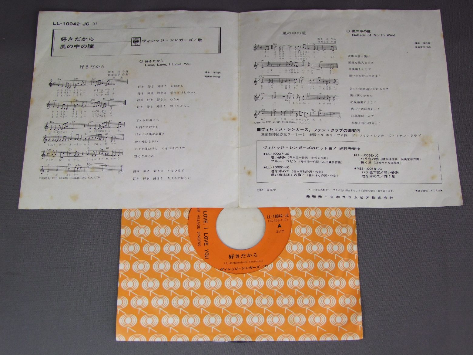 VILLAGE SINGERSヴィレッジ・シンガーズ/LOVE. LOVE. I LOVE YOU好きだから LL10042JC 製造国:日本盤 / Media:7inch外観:EX-盤の状態:EX- 価格(税込):¥440 送料 7inch:定形外郵便 360円~LP:定形外郵便 660円~送料は、注文の最終画面で確認頂けます。 > > VILLAGE SINGERS/LOVE. LOVE. I LOVE YOU 外観 (EX-)特記事項:見開きにシミ。ヨレ多少有り。外観EX-の共通説明:ダメージ軽度~多少。 中古品としては普通の状態。シミ、ヨゴレ、スレなど軽く~多少。 盤の状態 (EX-)特記事項:薄いスリキズ・細かい表面スレ軽くある感じです。プチ出そうな所は少し。軽微なものが中心の様子です。盤EX-の共通説明:盤面のスリキズが多少有り。音に出そうなものは殆ど無いように見える~さほど気にならないぐらいの軽いプチ数カ所程度。 Tweet それぞれの画像をクリックすると、大きい写真が見られます こちらの商品もお勧めです 770円 YUZO KAYAMA加山雄三 / GOLDEN ALBUMゴールデン・アルバム(あなたと共に)赤盤 660円 YUZO KAYAMA加山雄三 / AISURUTOKIHA IMA愛する時は今 3,850円 OXオックス / FIRST ALBUMファースト・アルバム 770円 TIGERSタイガース / HUMAN RENASCENCEヒューマン・ルネッサンス 1,650円 MUNETAKA INOUE & HIS SHARP FIVE井上宗孝とシャープ・ファイヴ / SHARP FIVE SCREEN GO GOシャープ・ファイヴ・スクリーン・ゴーゴー 2,420円 OXオックス / TELL ME-OX ON STAGE No1テルミー-オックス・オン・ステージ No1 770円 TIGERSタイガース / TIGERS 1982タイガース 1982 660円 YUZO KAYAMA加山雄三 / 15TH ANNIVERSARY加山雄三1976 武道館ライブ