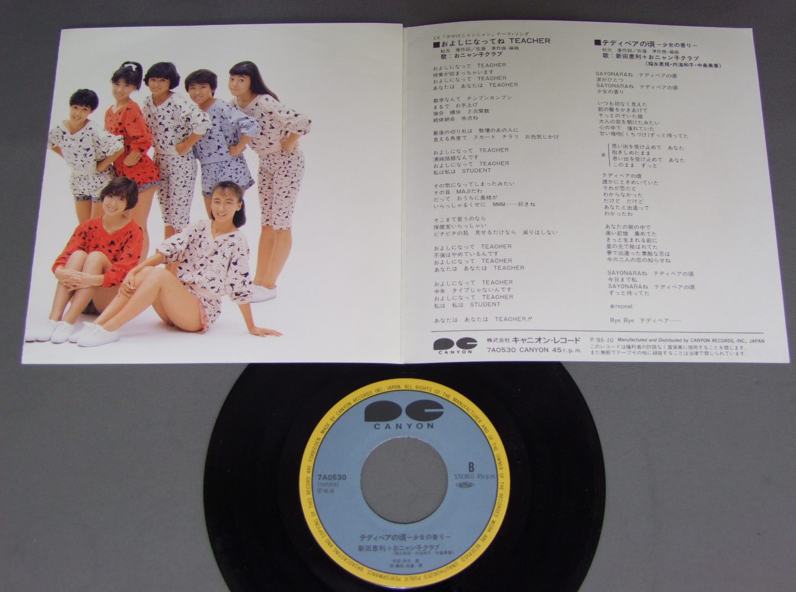 ONYANKO CLUBおニャン子クラブ/YUUYAKE NYAN NYAN THEME SONGバラエティー「夕やけニャンニャン」およしになってねティーチャー 7A0530 製造国:日本盤 / Media:7inch外観:EX+盤の状態:EX+ 価格(税込):¥440 送料 7inch:定形外郵便 360円~LP:定形外郵便 660円~送料は、注文の最終画面で確認頂けます。 > > ONYANKO CLUB/YUUYAKE NYAN NYAN THEME SONG 外観 (EX+)特記事項:特記なし。外観EX+の共通説明:中古としては美品、一見してきれいでダメージが軽微。シミ、ヨゴレ、スレ有っても僅か~少し。 盤の状態 (EX+)特記事項:極薄いスリキズ・スレ少し。一見してきれいな状態です。盤EX+の共通説明:盤面の極薄いスリキズ、スレ少し程度 音に出そうなものは無いように見える(極軽微なソフトティック音は除く)。 Tweet それぞれの画像をクリックすると、大きい写真が見られます こちらの商品もお勧めです 1,210円 PINK LADYピンク・レディー / PINK LADY CHALLENGE CONCERTピンク・レディー・チャレンジ・コンサート 990円 SONOKO KAWAI河合その子 / MODE DE SONOKOモード・デ・その子 1,210円 ONYANNKO CLUBおニャン子クラブ / DREAM CATALOGUE夢カタログ 1,320円 PINK LADYピンク・レディー / PINK LADY-SUMMER FIRE `77ピンク・レディー-サマー・ファイア `77 770円 YUKO ISHIKAWA石川優子 / REN`AI-KODOKU-JIN恋愛孤独人 770円 YUKO ISHIKAWA石川優子 / YUKO TOKIMEKU-KORO優子ときめくころ 1,210円 TSUKASA ITOH伊藤つかさ / SAYONARA KONNICHIWAさよなら、こんにちは 440円 YOU HAYAMI早見優 / MUSICミュージック
