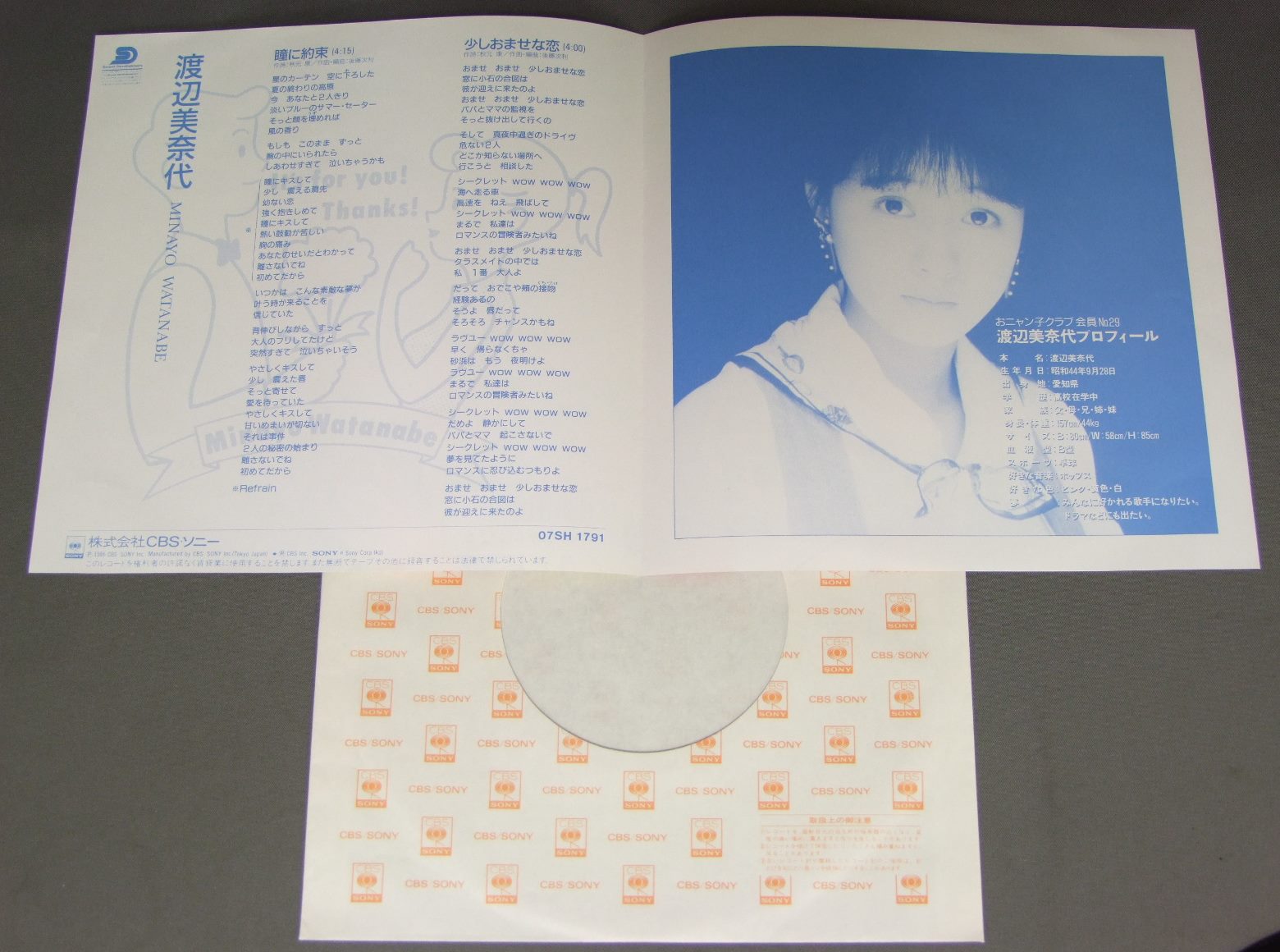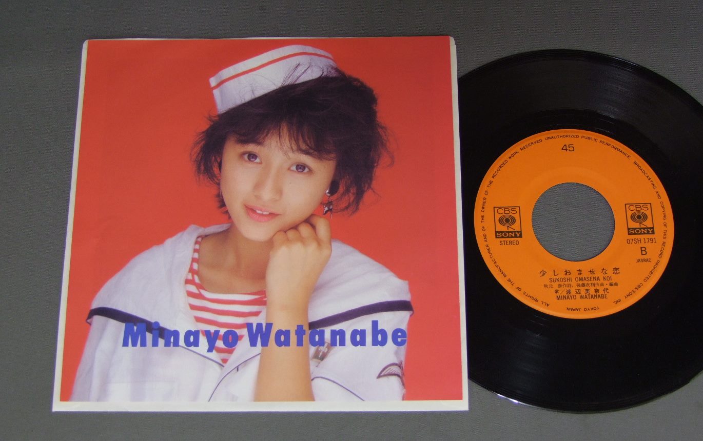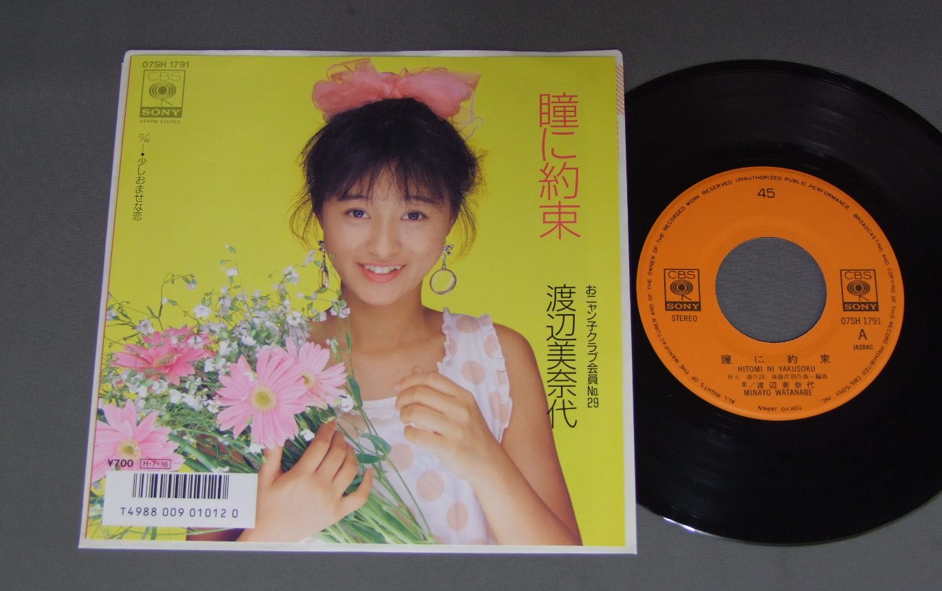 MINAYO WATANABE ( ONYANKO No29 )渡辺美奈代/HITOMI NI YAKUSOKU瞳に約束 07SH1791 製造国:日本盤 / Media:7inch外観:EX盤の状態:EX+ 価格(税込):¥440 送料 7inch:定形外郵便 360円~LP:定形外郵便 660円~送料は、注文の最終画面で確認頂けます。 > > MINAYO WATANABE ( ONYANKO No29 )/HITOMI NI YAKUSOKU 外観 (EX)特記事項:特記なし。外観EXの共通説明:ダメージが限定的。中古品としては保存状態がよい方。シミ、ヨゴレ、スレ 少し~軽度。 盤の状態 (EX+)特記事項:極薄いスリキズ・スレ少し。一見してきれいな状態です。盤EX+の共通説明:盤面の極薄いスリキズ、スレ少し程度 音に出そうなものは無いように見える(極軽微なソフトティック音は除く)。 Tweet それぞれの画像をクリックすると、大きい写真が見られます こちらの商品もお勧めです 1,210円 MOMOE YAMAGUCH山口百恵 / MOBIUS`S GAMEメビウス・ゲーム 1,320円 PINK LADYピンク・レディー / PINK LADY-SUMMER FIRE `77ピンク・レディー-サマー・ファイア `77 770円 YOSHIE KASHIWABARA柏原よしえ / SUMMER SENSATIONサマー・センセイション 880円 MAKO ISHINO石野真子 / MAKO2 1,210円 SAORI MINAMI南沙織 / HITOKAKERANO JUNJYOひとかけらの純情 1,210円 SONOKO KAWAI河合その子 / SIESTAシエスタ 880円 MOMOE YAMAGUCHI山口百恵 / BEST HITS山口百恵ヒット全曲集 770円 NAOKO KAWAI河合奈保子 / LOVEラブ