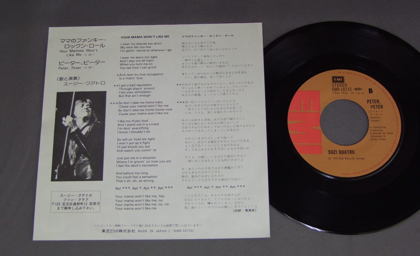 SUZI QUATROスージー・クアトロ/YOUR MAMMA WON`T LIKE MEママのファンキー・ロックン・ロール EMR10715 製造国:日本盤 / Media:7inch外観:EX盤の状態:EX+ 価格(税込):¥550 送料 7inch:定形外郵便 360円~LP:定形外郵便 660円~送料は、注文の最終画面で確認頂けます。 > > SUZI QUATRO/YOUR MAMMA WON`T LIKE ME 外観 (EX)特記事項:特記なし。外観EXの共通説明:ダメージが限定的。中古品としては保存状態がよい方。シミ、ヨゴレ、スレ 少し~軽度。 盤の状態 (EX+)特記事項:極薄いスリキズ・スレ少し。一見してきれいな状態です。盤EX+の共通説明:盤面の極薄いスリキズ、スレ少し程度 音に出そうなものは無いように見える(極軽微なソフトティック音は除く)。 Tweet それぞれの画像をクリックすると、大きい写真が見られます こちらの商品もお勧めです 770円 CHICAGOシカゴ / X 1,320円 DARYL HALL & JOHN OATESダリル・ホールとジョン・オーツ / X-STATICモダン・ポップ 990円 BYREDSバーズ / BYRDSバーズ 770円 STYXスティクス / BEST OF STYXレディ ( スティクス・ベスト ) 1,980円 STYXスティクス / PIECES OF EIGHTピーシズ・オブ・エイト (古代への追想) 770円 TOTO / ISOLATION + STICKERSアイソレーション 440円 BOB SEGER & THE SILVER BULLET BANDボブ・シーガー&ザ・シルバー・ブレット・バンド / DISTANCEディスタンス 550円 CHICAGOシカゴ / GREAT CHICAGO栄光のシカゴ