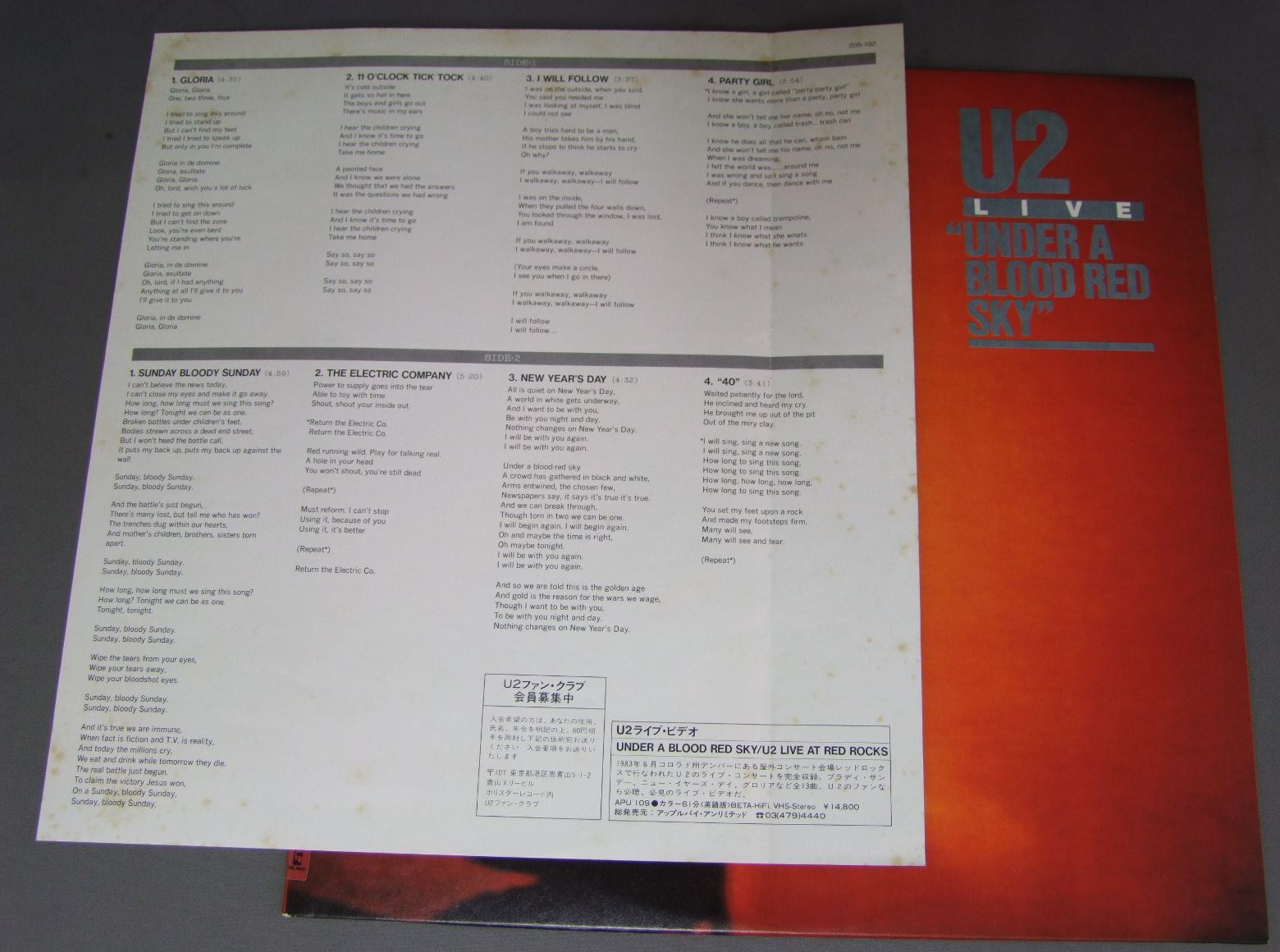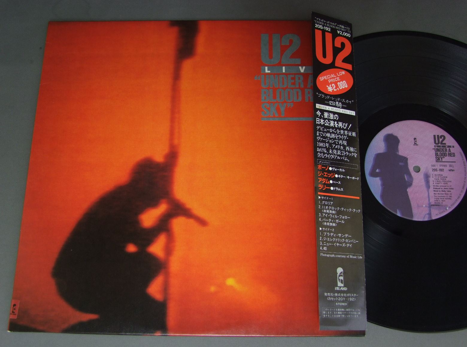 U2/U2 LIVE UNDER A BLOOD RED SKY 20S192 製造国:日本盤 / Media:LP外観:EX盤の状態:EX+ 価格(税込):¥1,650(売約済) 送料 7inch:定形外郵便 360円~LP:定形外郵便 660円~送料は、注文の最終画面で確認頂けます。 > > U2/U2 LIVE UNDER A BLOOD RED SKY 外観 (EX)特記事項:特記なし。外観EXの共通説明:ダメージが限定的。中古品としては保存状態がよい方。シミ、ヨゴレ、スレ 少し~軽度。 盤の状態 (EX+)特記事項:極薄いスリキズ・スレ少し。一見してきれいな状態です。盤EX+の共通説明:盤面の極薄いスリキズ、スレ少し程度 音に出そうなものは無いように見える(極軽微なソフトティック音は除く)。 Tweet それぞれの画像をクリックすると、大きい写真が見られます こちらの商品もお勧めです