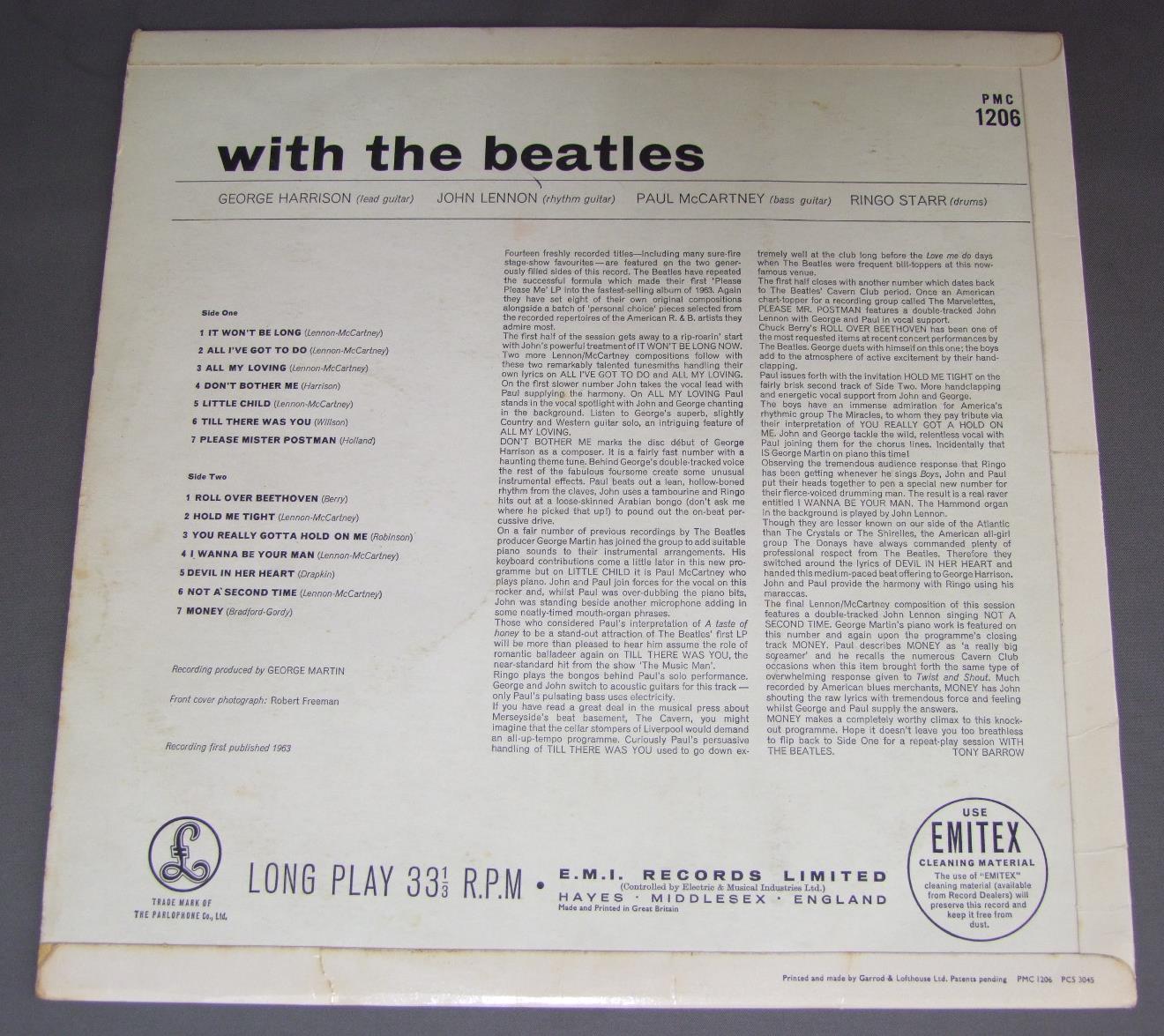 BEATLES/WITH THE BEATLES MONODECCA盤 PMC1206 製造国:英国盤 / Media:LPMatrix:7N/3 | 7N/3 スタンパーは見当たりません。外観:EX盤の状態:EX- 価格(税込):¥38,500(売約済) 送料 7inch:定形外郵便 360円~LP:定形外郵便 660円~送料は、注文の最終画面で確認頂けます。 > > BEATLES/WITH THE BEATLES MONO 外観 (EX)特記事項:表ジャケは周辺部にヨレシワ多少有りますが、全体的にはそれほど多い感じでも無いです。薄いレコードリングスレ多少有り。レコード取り出し口淵にヨレやシミが少し。 裏ジャケ側はスレよごれ多少有り。外観EXの共通説明:ダメージが限定的。中古品としては保存状態がよい方。シミ、ヨゴレ、スレ 少し~軽度。 盤の状態 (EX-)特記事項:薄いスリキズ・細かい表面スレ多少ある感じ。殆どが軽微なものの様子です。所々聴いてみましたが、チリプチも少なく、サウンド的にはEXに近い、オススメの音質。盤EX-の共通説明:盤面のスリキズが多少有り。音に出そうなものは殆ど無いように見える~さほど気にならないぐらいの軽いプチ数カ所程度。 その他:英国内で生産が一時間に合わなかった時にDECCAの工場に委託生産を行った時の盤。レーベルにデッカ工場特有のグルーブが有ります。音はデッカ風と言われています。 Tweet それぞれの画像をクリックすると、大きい写真が見られます こちらの商品もお勧めです 5,500円 BEATLES / AT THE HOLLYWOOD BOWL 5,500円 JOHN LENNON / SHAVED FISH 4,950円 JOHN & YOKO - PLASTIC ONO BANDF / SOME TIME IN NEW YORK CITY 5,500円 GEORGE HARRISON / LIVING IN THE MATERIAL WORLD 5,500円 GEORGE HARRISON / THIRTY THREE & 1/3
