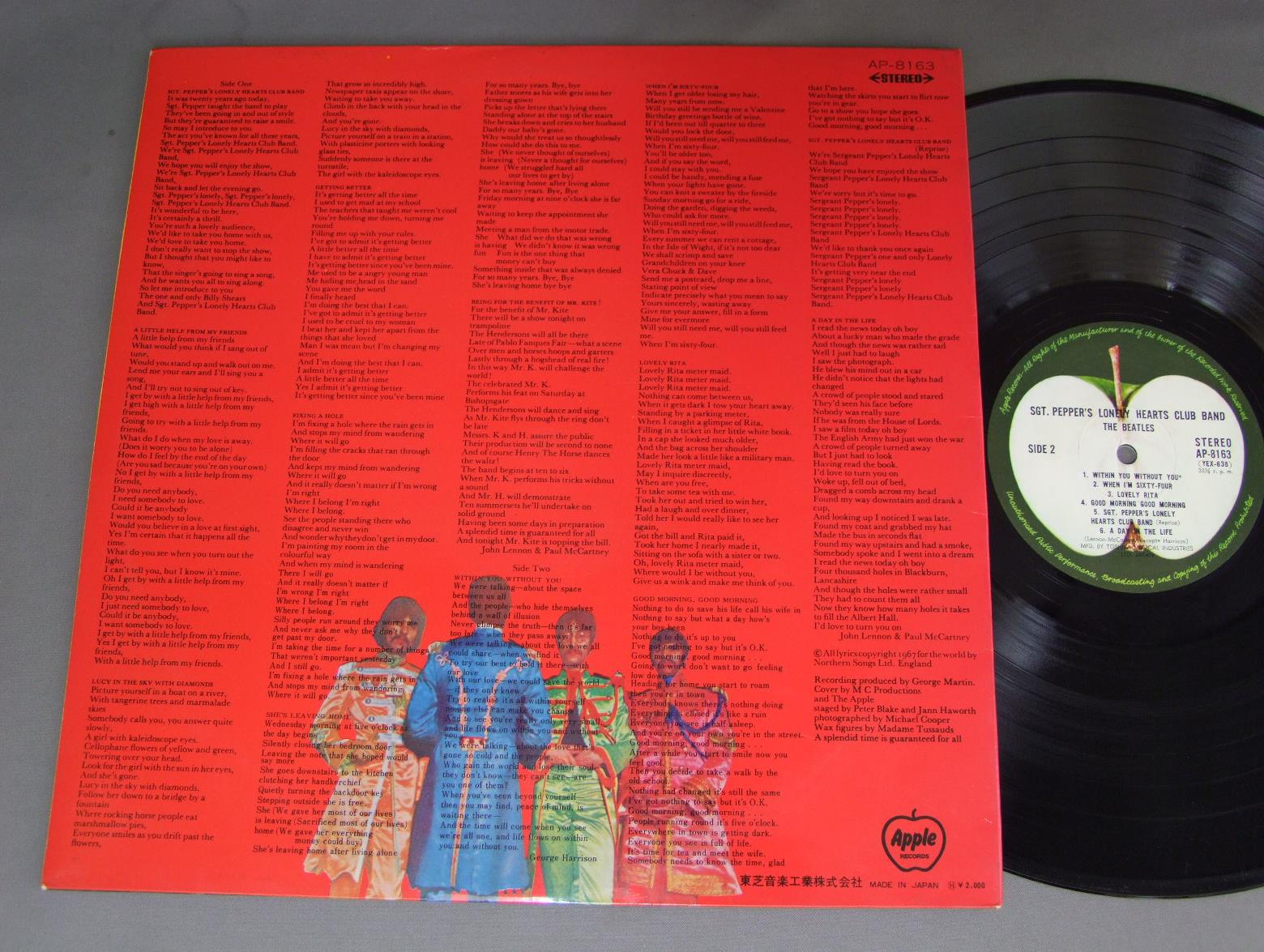BEATLES/SGT.PEPPERS LONELY HEARTS CLUB BAND AP8613 製造国:日本盤 / Media:LP外観:EX盤の状態:EX- 価格(税込):¥1,980(売約済) 送料 7inch:定形外郵便 360円~LP:定形外郵便 660円~送料は、注文の最終画面で確認頂けます。 > > BEATLES/SGT.PEPPERS LONELY HEARTS CLUB BAND 外観 (EX)特記事項:裏ジャケにレコードリングスレ。見開きにシミ。外観EXの共通説明:ダメージが限定的。中古品としては保存状態がよい方。シミ、ヨゴレ、スレ 少し~軽度。 盤の状態 (EX-)特記事項:A1に薄めの線キズ有りますが、ソフトプチが少し有るぐらいでした。他は薄いスリキズ・スレ少しある感じ。一見してきれいな感じです。盤EX-の共通説明:盤面のスリキズが多少有り。音に出そうなものは殆ど無いように見える~さほど気にならないぐらいの軽いプチ数カ所程度。 Tweet それぞれの画像をクリックすると、大きい写真が見られます こちらの商品もお勧めです 880円 PAUL MCCARTNEYポール・マッカートニー / TUG OF WARタッグ・オブ・ウォー 1,650円 WINGSウィングス / OVER AMERICAUSAライブ 770円 PAUL MCCARTNEY & WINGSポール・マッカートニー & ウイングス / WINGS AT THE SPEED OF SOUNDスピード・オヴ・サウンド 990円 WINGS / VENUS AND MARS 880円 PAUL McCARTNEYポール・マッカートニー / TUG OF WARタグ・オブ・ウォー 1,980円 GEORGE HARRISONジョージ・ハリスン / LIVING IN THE MATERIAL WORLDリヴィング・イン・ザ・マテリアル・ワールド 1,210円 WINGSウィングス / VENUS & MARSヴィーナス・アンド・マース 1,650円 GEORGE HARRISONジョージ・ハリソン / EXTRA TEXTUREジョージ・ハリソン帝国