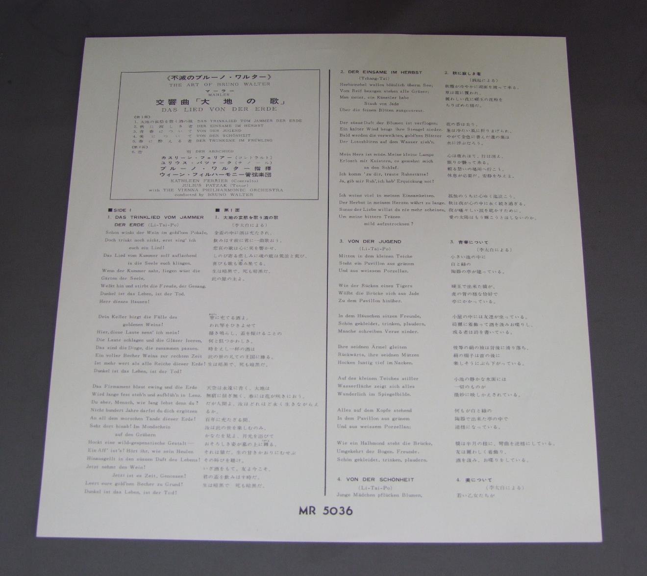 WALTERブルーノ・ワルター/MAHLER LIED VON DER ERDEマーラー:大地の歌 MR5036 製造国:日本盤 / Media:LP外観:EX盤の状態:EX 価格(税込):¥880(売約済) 送料 7inch:定形外郵便 360円~LP:定形外郵便 660円~送料は、注文の最終画面で確認頂けます。 > > WALTER/MAHLER LIED VON DER ERDE 外観 (EX)特記事項:特記なし。外観EXの共通説明:ダメージが限定的。中古品としては保存状態がよい方。シミ、ヨゴレ、スレ 少し~軽度。 盤の状態 (EX)特記事項:薄いスリキズ・スレ軽くある感じ。軽微なものの様子です。盤EXの共通説明:盤面のスリキズが薄いものが少し~軽度 音に出そうなものは無いように見える(軽微なソフトティック音は除く)。 Tweet それぞれの画像をクリックすると、大きい写真が見られます こちらの商品もお勧めです 990円 MARRINERマリナー / ACADEMY OF ST MARTIN IN THE FIELDS ENCOREアカデミー・アンコール・デラックス 990円 BRENDEL - ABBADO - LONDON SYM. ORCH.ブレンデル - アバド - ロンドン交響楽団 / SCHUMANN - PIANO CONC.シューマン - ピアノ協奏曲 1,430円 KARAJAN - BERLIN PHILHARMONIC ORCHESTRAカラヤン - ベルリンフィルハーモニー管弦楽団 / BRAHMS - SYMPHONY NO.1ブラームス - 交響曲第1番 990円 JOSEF KRIPSジョセフ・クリップス / MOZART-OVERTURESモーツァルト-オペラ序曲集 990円 JACQUES LANCELOTジャック・ランスロ / MOZART QUINTETTEモーツァルト&ブラームス-クラリネット五重奏曲 1,320円 WALTER - COLUMBIA SYM. ORCH.ワルター - コロンビア交響楽団 / MOZART - SYM. NO39 & NO35モーツァルト 交響曲第39番 & 35番 ハフナー 990円 ORMANDYオーマンディー / CAPRICCIO ITALIENイタリア奇想曲-華麗なるオーケストラ曲集 990円 ORMANDYユージン・オーマンディ / TCHAIKOVSKY-SUITE FROM SWAN LAKEチャイコフスキー-バレエ音楽白鳥の湖