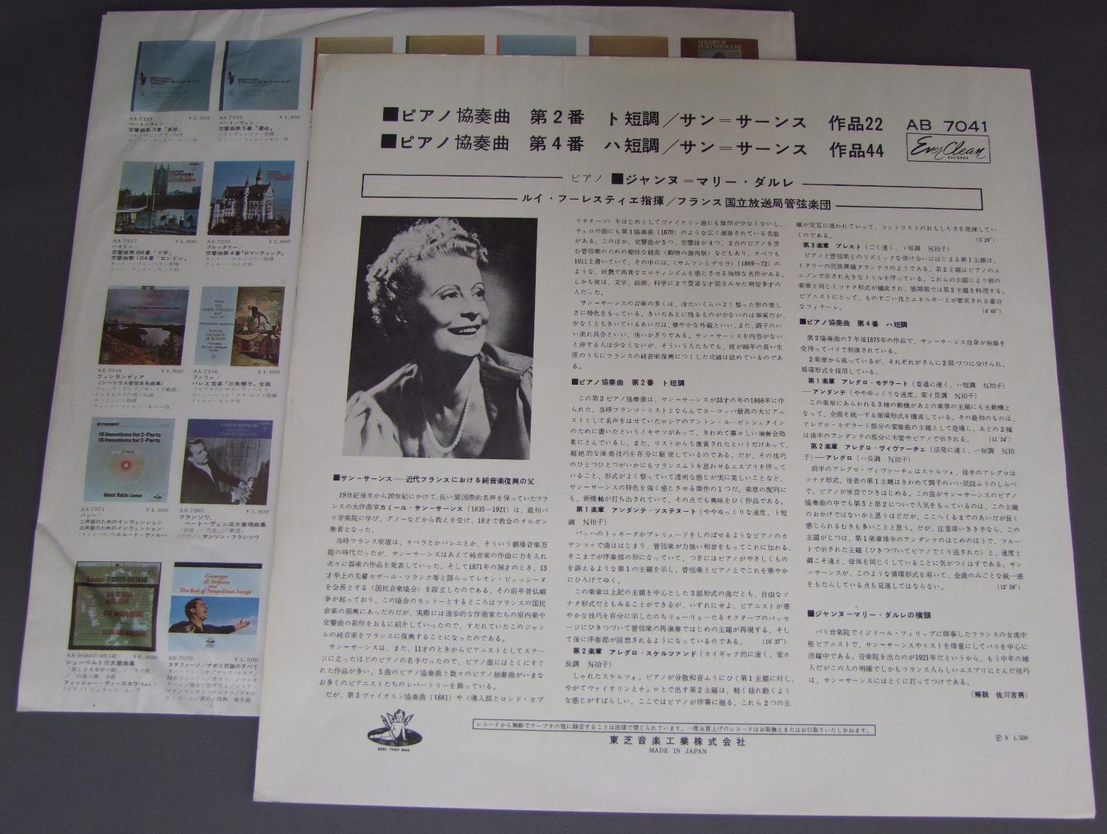 MARIE DARRE/SAINT-SAENS PIANO CONC 2&4赤盤 AB7041 製造国:日本盤 / Media:LP外観:EX+盤の状態:EX+ 価格(税込):¥880(売約済) 送料 7inch:定形外郵便 360円~LP:定形外郵便 660円~送料は、注文の最終画面で確認頂けます。 > > MARIE DARRE/SAINT-SAENS PIANO CONC 2&4 外観 (EX+)特記事項:特記なし。外観EX+の共通説明:中古としては美品、一見してきれいでダメージが軽微。シミ、ヨゴレ、スレ有っても僅か~少し。 盤の状態 (EX+)特記事項:薄いスリキズ・スレ少し。一見してきれいな状態です。盤EX+の共通説明:盤面の極薄いスリキズ、スレ少し程度 音に出そうなものは無いように見える(極軽微なソフトティック音は除く)。 Tweet それぞれの画像をクリックすると、大きい写真が見られます こちらの商品もお勧めです 990円 WALTERワルター / BRAHMS SYM. NO2ブラームス 交響曲第2番-大学祝典序曲 990円 KUBELIK - VIENNA PHIL.クーベリック指揮ウイーン・フィルハーモニー管弦楽団 / BEETOVEN - SYMPHONY No7ベートーヴェン交響曲第7番イ長調 1,320円 ANDRE - PAILLARD - ORCHESTRE DE CHAMBRE PAILLARDアンドレ - パイヤール - パイヤール室内管弦楽団 / HUMMEL - CONCERTO POUR TROMPETTEフンメル - トランペット協奏曲 990円 MUTIムーティ / MENDELSSOHN SYM. NO3 `SCOTCH` ETCメンデルスゾーン 交響曲 第3番 `スコッチ` 990円 POLLINI - BOHM - VIENNA PHIL.ポリーニ - ベーム - ウィーン・フィル / BEETHOVEN - PIANO CONC. NO4ベートーヴェン - ピアノ協奏曲第4番 1,320円 BARBIROLLI - VIENNA PHILHARMONIC ORCHESTRAバルビローリ - ウィーン・フィル / BRAHMS - SYMPHONY NO4ブラームス交響曲第4番 990円 TALICH - CZECH PHILHARMONIC ORCH.ターリッヒ - チェコ・フィルハーモニー管弦楽団 / SMETANA - MY COUNTRY 2スメタナ - 交響詩わが祖国 2 1,320円 DINU LIPATTIリッパティ / CHOPIN - PIANO CONCERTO NO1 & 3ショパン - ピアノ協奏曲第1番