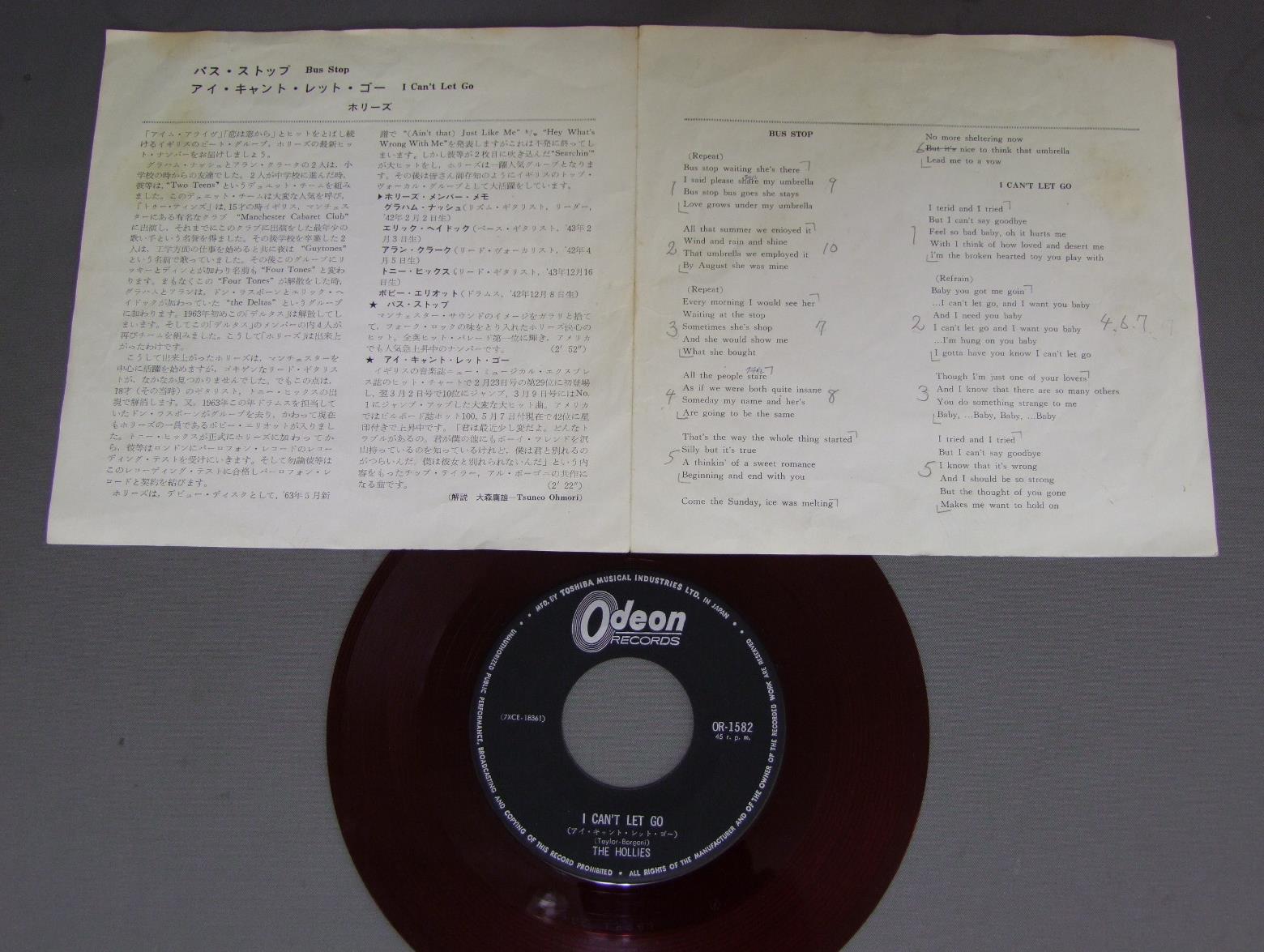 HOLLIESホリーズ/BUS STOPバス・ストップ 赤盤 OR1582 製造国:日本盤 / Media:7inch外観:VG+盤の状態:EX- 価格(税込):¥770(売約済) 送料 7inch:定形外郵便 360円~LP:定形外郵便 660円~送料は、注文の最終画面で確認頂けます。 > > HOLLIES/BUS STOP 外観 (VG+)特記事項:見開きにシミや書き込み。裏ジャケにシミ。外観VG+の共通説明:ダメージやや有り。シミ、ヨゴレ、スレなど多少~やや多め。 盤の状態 (EX-)特記事項:薄いスリキズ・細かい表面スレ軽くある感じ。全体的には殆どが軽微なものの様子です。盤EX-の共通説明:盤面のスリキズが多少有り。音に出そうなものは殆ど無いように見える~さほど気にならないぐらいの軽いプチ数カ所程度。 Tweet それぞれの画像をクリックすると、大きい写真が見られます こちらの商品もお勧めです 4,950円 ANIMALSアニマルズ / BEST ALBUM アニマルズのすべて 赤盤 2,640円 SPOTNICKSスプートニクス / KARELIA-THE BEST OF THE SPOTNICKS霧のカレリア-ベスト・オブ・ザ・スプートニクス