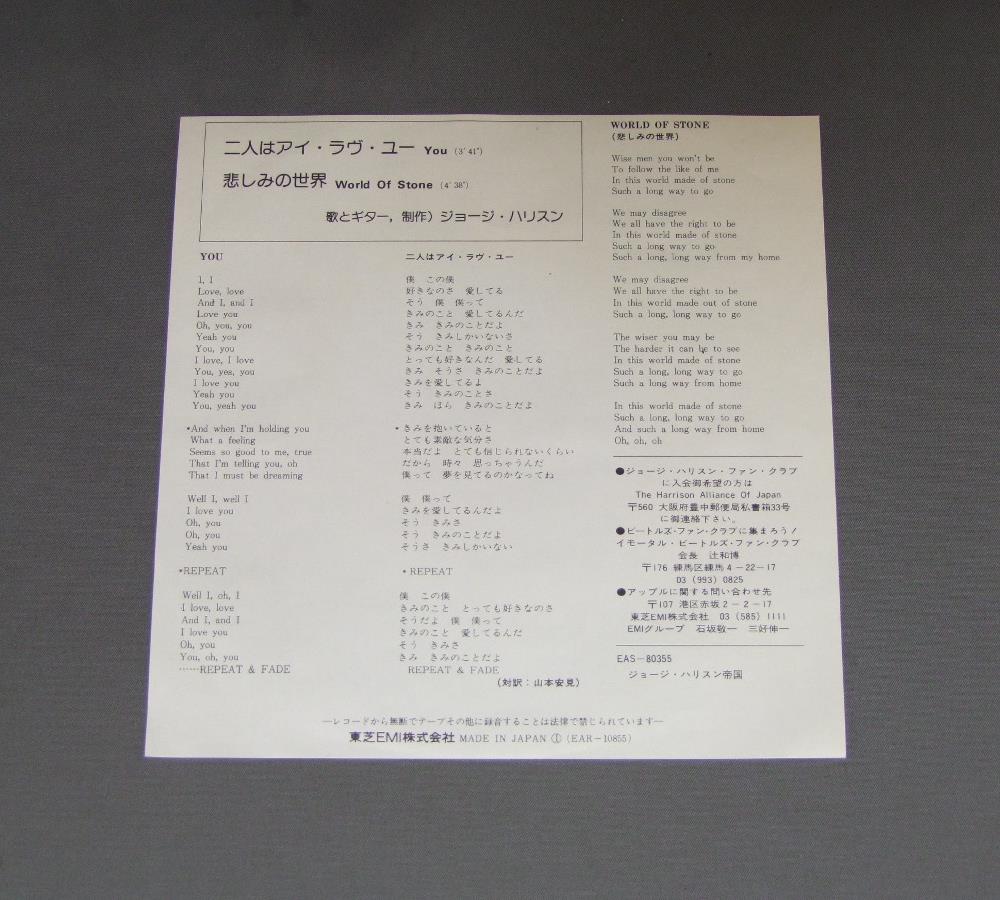 GEORGE HARRISONジョージ・ハリスン/YOU二人はアイ・ラヴ・ユー EAR10855 製造国:日本盤 / Media:7inch外観:EX盤の状態:EX+ 価格(税込):¥1,100(売約済) 送料 7inch:定形外郵便 360円~LP:定形外郵便 660円~送料は、注文の最終画面で確認頂けます。 > > GEORGE HARRISON/YOU 外観 (EX)特記事項:特記なし。外観EXの共通説明:ダメージが限定的。中古品としては保存状態がよい方。シミ、ヨゴレ、スレ 少し~軽度。 盤の状態 (EX+)特記事項:極薄いスリキズ・スレ少し。一見してきれいな状態です。盤EX+の共通説明:盤面の極薄いスリキズ、スレ少し程度 音に出そうなものは無いように見える(極軽微なソフトティック音は除く)。 Tweet それぞれの画像をクリックすると、大きい写真が見られます こちらの商品もお勧めです 1,650円 GEORGE HARRISONジョージ・ハリスン / DARK HORSEダーク・ホース 1,210円 WINGSウィングス / VENUS & MARSヴィーナス・アンド・マース 1,540円 WINGSポール・マッカートニーとウイングス / LONDON TOWN 1,650円 WINGSウィングス / OVER AMERICAUSAライブ 770円 PAUL MCCARTNEY&WINGSポール・マッカートニー&ウイングス / BAND ON THE RUNバンド・オン・ザ・ラン 880円 PAUL McCARTNEYポール・マッカートニー / TUG OF WARタグ・オブ・ウォー 770円 WINGSポール・マッカートニー&ウイングス / VENUS AND MARSヴィーナス・アンド・マース 770円 WINGSウイングス / AT THE SPEED OF SOUNDスピード・オブ・サウンド
