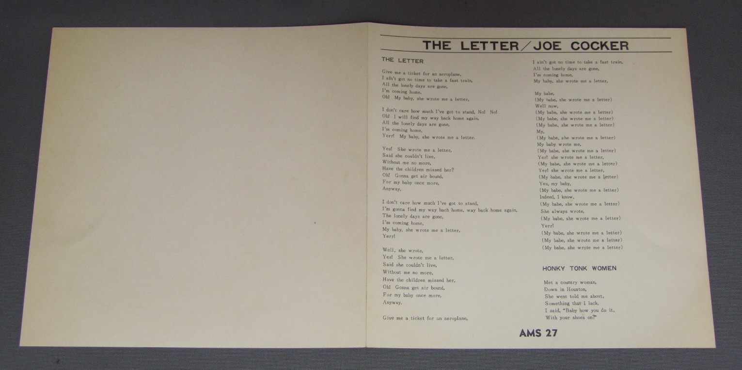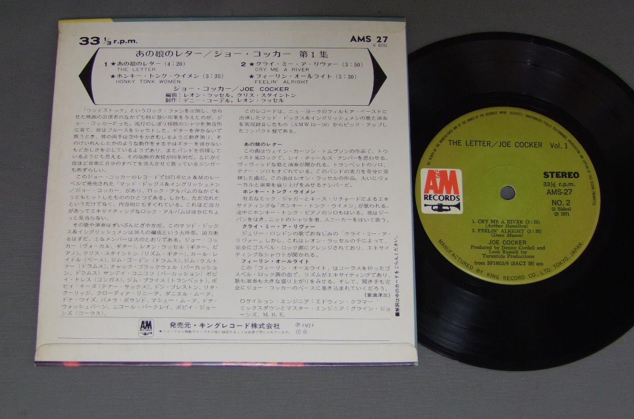 JOE COCKERジョー・コッカー/JOE COCKER VOL1 LETTERジョー・コッカー第1集 あの娘のレター AMS27 製造国:日本盤 / Media:7inch外観:EX盤の状態:EX+ 価格(税込):¥1,453(売約済) 送料 7inch:定形外郵便 360円~LP:定形外郵便 660円~送料は、注文の最終画面で確認頂けます。 > > JOE COCKER/JOE COCKER VOL1 LETTER 外観 (EX)特記事項:特記なし。外観EXの共通説明:ダメージが限定的。中古品としては保存状態がよい方。シミ、ヨゴレ、スレ 少し~軽度。 盤の状態 (EX+)特記事項:極薄いスリキズ・スレ少し。一見してきれいな状態です。盤EX+の共通説明:盤面の極薄いスリキズ、スレ少し程度 音に出そうなものは無いように見える(極軽微なソフトティック音は除く)。 Tweet それぞれの画像をクリックすると、大きい写真が見られます こちらの商品もお勧めです 1,320円 NEIL DIAMONDニール・ダイアモンド / HOT AUGUST NIGTグリーク・シアター・コンサート 660円 KEITH CARRADINEキース・キャラディン / LOST AND FOUND(MR. BLUE)ミスター・ブルー 1,320円 NEIL LAREN二ール・ラーセン / JUNGLE FEVERジャングル・フィーバー 770円 YVES MONTANDイヴ・モンタン / LE PARIS DE… YVES MONTANDモンタン. パリの心を歌う 880円 TONY BENETTトニー・ベネット / BEAT OF MY HEARTビート・オブ・マイ・ハード 770円 JOHN DENVERジョン・デンバー / EVENING WITH JOHN DENVERジョン・デンバー・ライブ 1,210円 TOMMY SHAWトミー・ショウ / GIRLS WITH GUNSガール・ウィズ・ガン 2,420円 BILLY JOELビリー・ジョエル / NYLON CURTEN MASTER SOUND PRESSINGナイロン・カーテン(マスター・サウンド盤)