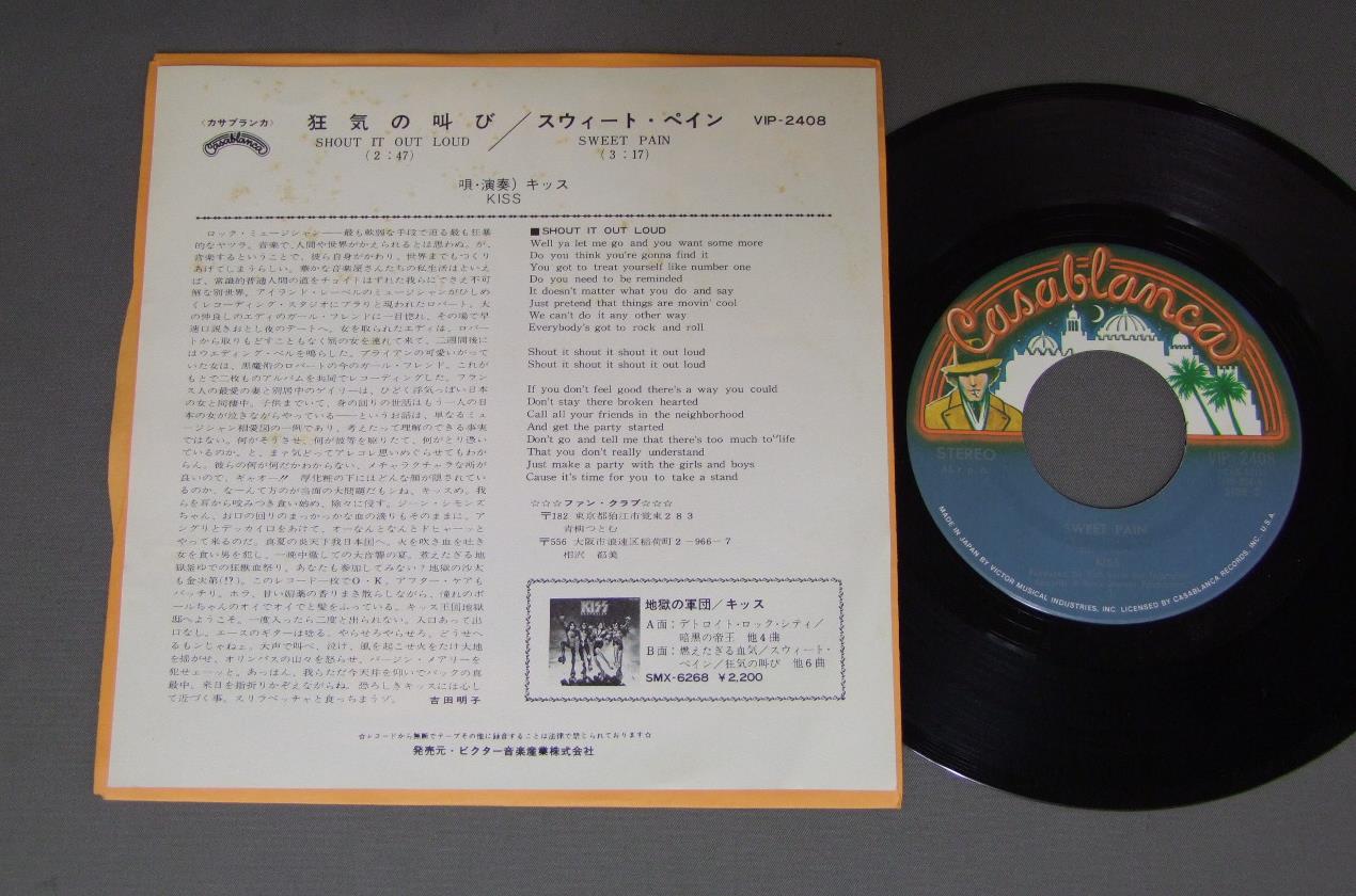 KISSキッス/SHOUT IT OUT LOUD狂気の叫び VIP2408 製造国:日本盤 / Media:7inch外観:EX盤の状態:EX+ 価格(税込):¥1,650(売約済) 送料 7inch:定形外郵便 360円~LP:定形外郵便 660円~送料は、注文の最終画面で確認頂けます。 > > KISS/SHOUT IT OUT LOUD 外観 (EX)特記事項:特記なし。外観EXの共通説明:ダメージが限定的。中古品としては保存状態がよい方。シミ、ヨゴレ、スレ 少し~軽度。 盤の状態 (EX+)特記事項:極薄いスリキズ・スレ少し。一見してきれいな状態です。盤EX+の共通説明:盤面の極薄いスリキズ、スレ少し程度 音に出そうなものは無いように見える(極軽微なソフトティック音は除く)。 Tweet それぞれの画像をクリックすると、大きい写真が見られます こちらの商品もお勧めです 1,320円 NIGHT RANGERナイト・レンジャー / MIDNIGHT MADNESSミッドナイト・マッドネス 770円 MONEYマネー / FIRST INVESTMENT誘惑の掟 2,200円 HARDCHOIRハードクワイア / HARDCHOIR WLP華麗なる戦慄 660円 NIGHT RANGER / DAWN PATROL緊急指令 770円 MICHAEL SCHENKER GROUPマイケル・シェンカー・グループ / CRY FOR THE NATIONSハーフ・ライブ 1,320円 MICHAEL SCHENKER GROUPマイケル・シェンカー・グループ / 1st ALBUM神(帰ってきたフライング・アロウ 770円 TED NUGENTテッド・ニュージェント / DOUBLE LIVE GONZO絶叫のライブ・ゴンゾー 1,210円 TYGERS OF PAN TANGタイガース・オブ・パンタン / CAGE危険なパラダイス