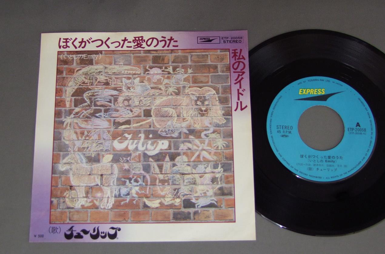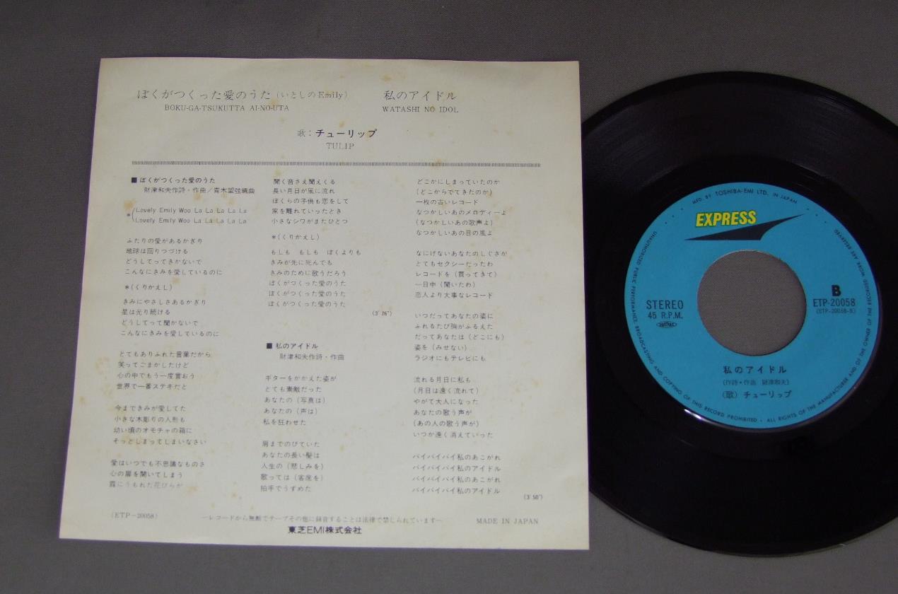 TULIPチューリップ/ぼくがつくった愛のうた(いとしのEMILY) ETP20058 製造国:日本盤 / Media:7inch外観:EX-盤の状態:EX+ 価格(税込):¥550(売約済) 送料 7inch:定形外郵便 360円~LP:定形外郵便 660円~送料は、注文の最終画面で確認頂けます。 > > TULIP/ 外観 (EX-)特記事項:裏ジャケにシミ。外観EX-の共通説明:ダメージ軽度~多少。 中古品としては普通の状態。シミ、ヨゴレ、スレなど軽く~多少。 盤の状態 (EX+)特記事項:極薄いスリキズ・スレ少し。一見してきれいな状態です。盤EX+の共通説明:盤面の極薄いスリキズ、スレ少し程度 音に出そうなものは無いように見える(極軽微なソフトティック音は除く)。 Tweet それぞれの画像をクリックすると、大きい写真が見られます こちらの商品もお勧めです 1,210円 YUKO OTOMO大友裕子 / KIZUNA絆(きずな) 770円 EMU絵夢 / EMU 2絵夢 II 990円 MARI AMACHI天地真理 / YOU&I小さな恋-ひとりじゃないの (あなたと私) 1,320円 JUN & NENEじゅん&ネネ / WORLD OF JUN & NENE愛するってこわい -じゅん&ネネの世界- 990円 HATUMI SHIBATAしばたはつみ / BEST 16マイ・ラグジュアリー・ナイト しばたはつみ ベスト16 2,750円 STAGE 101ステージ101 / AKAI YANE NO IE赤い屋根の家 880円 TULIPチューリップ / LOVE MAP SHOPラヴ・マップ・ショップ 660円 KENICHI HAGIWARA萩原健一 / NADJAナジャ