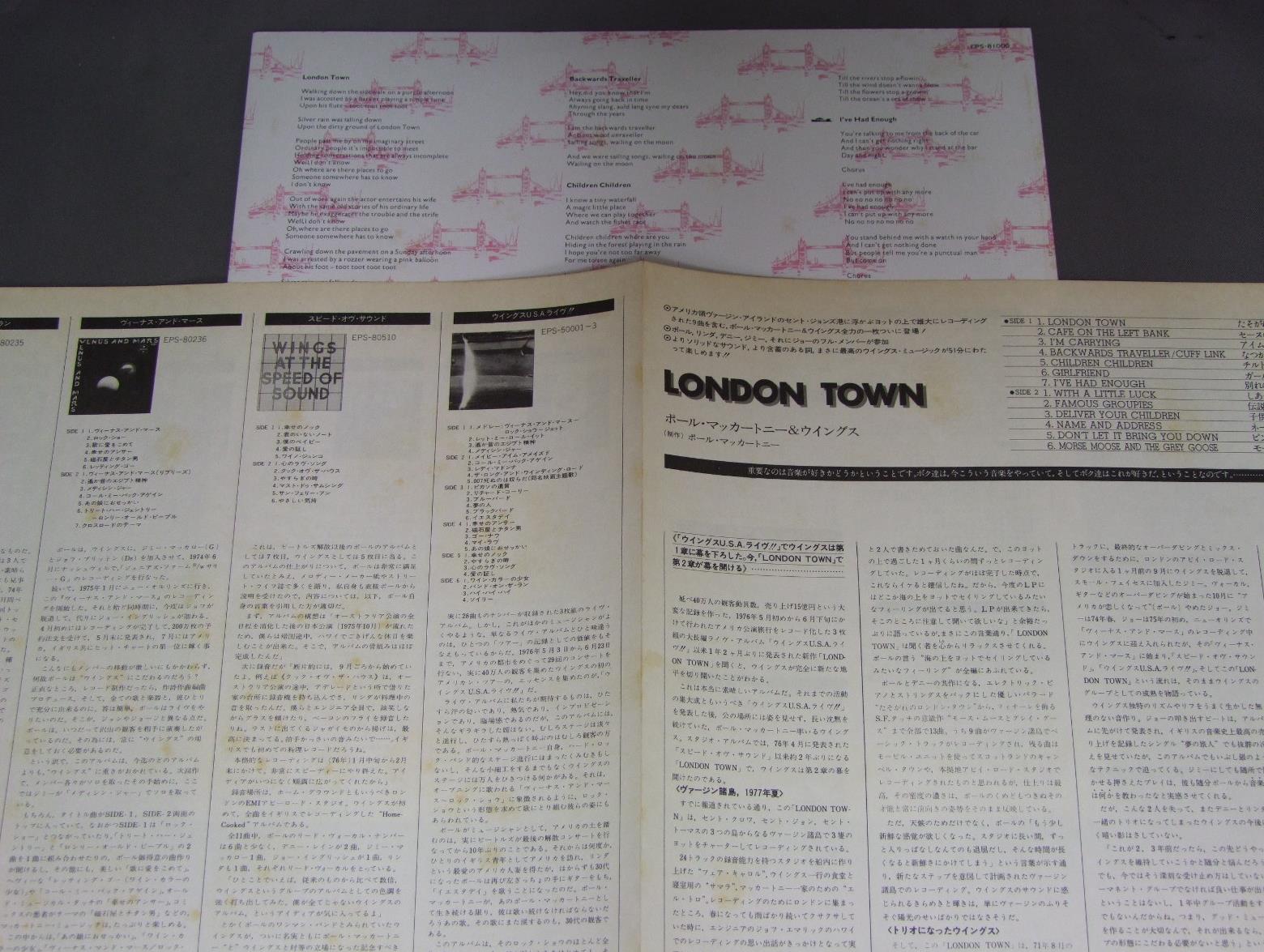 WINGSポール・マッカートニー&ウイングス/LONDON TOWN EPS81000 製造国:日本盤 / Media:LP外観:EX盤の状態:EX+帯:VG+ 価格(税込):¥1,100(売約済) 送料 7inch:定形外郵便 360円~LP:定形外郵便 660円~送料は、注文の最終画面で確認頂けます。 > > WINGS/LONDON TOWN 外観 (EX)特記事項:特記なし。外観EXの共通説明:ダメージが限定的。中古品としては保存状態がよい方。シミ、ヨゴレ、スレ 少し~軽度。 盤の状態 (EX+)特記事項:極薄いスリキズ・スレ少し。一見してきれいな状態です。盤EX+の共通説明:盤面の極薄いスリキズ、スレ少し程度 音に出そうなものは無いように見える(極軽微なソフトティック音は除く)。 帯の状態 (VG+):特記なし。 Tweet それぞれの画像をクリックすると、大きい写真が見られます こちらの商品もお勧めです 1,210円 WINGSウイングス / GREATEST HITSグレイテスト・ヒット 770円 WINGSポール・マッカートニー&ウイングス / VENUS AND MARSヴィーナス・アンド・マース 1,540円 WINGSポール・マッカートニーとウイングス / LONDON TOWN 1,650円 GEORGE HARRISONジョージ・ハリスン / DARK HORSEダーク・ホース 880円 PAUL McCARTNEYポール・マッカートニー / TUG OF WARタグ・オブ・ウォー 770円 JOHN LENNONジョン・レノン / PLASTIC ONO BANDプラスティック・オノ・バンド 1,320円 WINGSウイングス / WINGS OVER AMERICAウイングス U.S.A.ライヴ!! 1,210円 WINGSウィングス / VENUS & MARSヴィーナス・アンド・マース