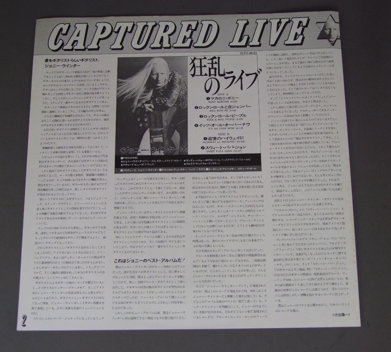 JOHNNY WINTERジョニー・ウインター/CAPTURED LIVE!狂乱のライブ ECPO88BS 製造国:日本盤 / Media:LP外観:EX盤の状態:EX+ 価格(税込):¥1,100(売約済) 送料 7inch:定形外郵便 360円~LP:定形外郵便 660円~送料は、注文の最終画面で確認頂けます。 > > JOHNNY WINTER/CAPTURED LIVE! 外観 (EX)特記事項:ヘリにスレ有。ジャケ表面にシミ、よごれ有。付属品にシミ、よごれ有。外観EXの共通説明:ダメージが限定的。中古品としては保存状態がよい方。シミ、ヨゴレ、スレ 少し~軽度。 盤の状態 (EX+)特記事項:薄いスリキズ・スレ少し。一見してきれいな状態です。盤EX+の共通説明:盤面の極薄いスリキズ、スレ少し程度 音に出そうなものは無いように見える(極軽微なソフトティック音は除く)。 Tweet それぞれの画像をクリックすると、大きい写真が見られます こちらの商品もお勧めです 1,320円 QUARTER FLASHクオーター・フラッシュ / QUARTER FLASHミッドナイト・フラッシュ 770円 SNEAKERスニーカー / LOOSE IN THE WORLDルーズ・イン・ザ・ワールド 880円 DOOBIE BROTHERSドゥービー・ブラザーズ / ONE STEP CLOSERワン・ステップ・クローサー 770円 DOOBIE BROTHERSドゥービー・ブラザーズ / LIVIN`ON THE FAULT LINE運命の掟 880円 JOHN CAFFERTY AND BEAVER BROWN BAND / TOUGH ALL OVER 770円 CHICAGOシカゴ / X 1,210円 EAGLESイーグルス / LONG RUNザ・ロング・ラン 770円 REO SPEEDWAGONREO スピードワゴン / HI INFIDELITY禁じられた夜