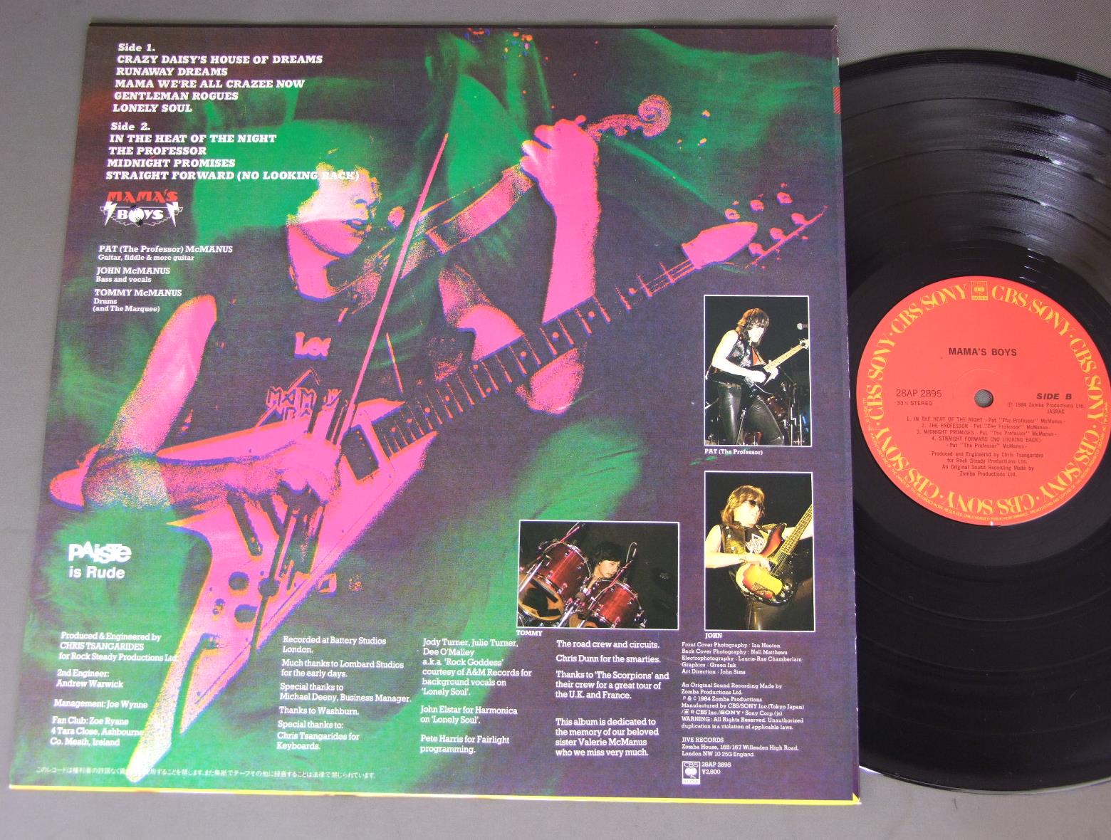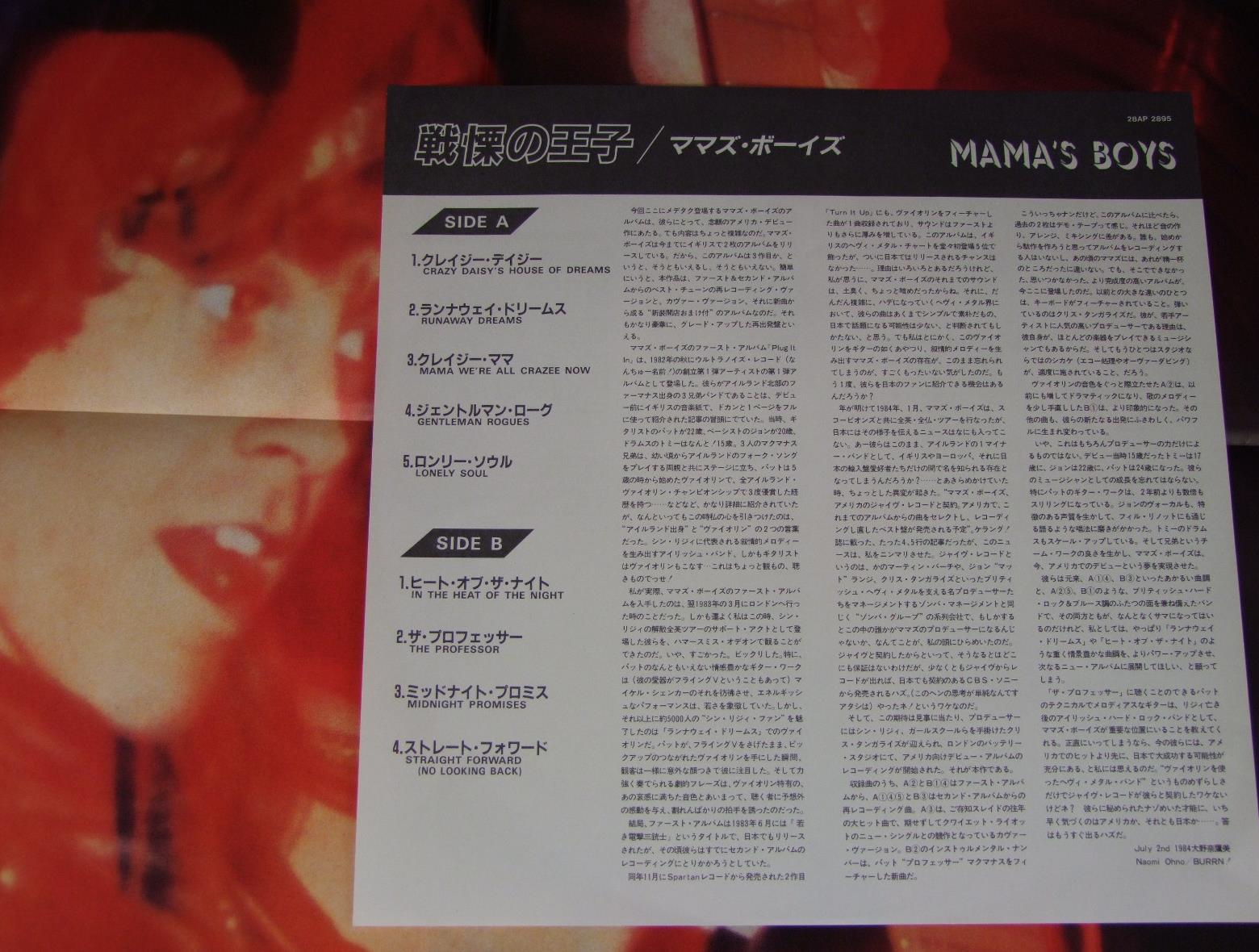 MAMA`S BOYSママズ・ボーイズ/MAMA`S BOYS w/POSTER戦慄の王子 28AP2895 製造国:日本盤 / Media:LP外観:EX+盤の状態:EX+ 価格(税込):¥1,100(売約済) 送料 7inch:定形外郵便 360円~LP:定形外郵便 660円~送料は、注文の最終画面で確認頂けます。 > > MAMA`S BOYS/MAMA`S BOYS w/POSTER 外観 (EX+)特記事項:特記なし。外観EX+の共通説明:中古としては美品、一見してきれいでダメージが軽微。シミ、ヨゴレ、スレ有っても僅か~少し。 盤の状態 (EX+)特記事項:極薄いスリキズ・スレ少し。一見してきれいな状態です。盤EX+の共通説明:盤面の極薄いスリキズ、スレ少し程度 音に出そうなものは無いように見える(極軽微なソフトティック音は除く)。 Tweet それぞれの画像をクリックすると、大きい写真が見られます こちらの商品もお勧めです 770円 MONTROSEモントローズ / WARNER BROS PRESENTS MONTROSEワーナー・ブラザース・プレゼンツ・モントローズ 1,320円 NIGHT RANGERナイト・レンジャー / MIDNIGHT MADNESSミッドナイト・マッドネス 770円 NIGHT RANGERナイト・レンジャー / DAWN PATROL緊急指令 770円 HAGAR SCHON AARONSON HRIEVEヘイガー、ショーン、アローソン、シュリーヴ / THROUGH THE FIRE炎の饗宴 990円 ANGELエンジェル / ANGEL天使の美学 660円 BERLIN / COUNT THREE & PRAY 770円 MICHAEL SCHENKER GROUPマイケル・シェンカー・グループ / CRY FOR THE NATIONSハーフ・ライブ 1,210円 NIGHT RANGERナイト・レンジャー / MIDNIGHT MADNESSナイト・レンジャー