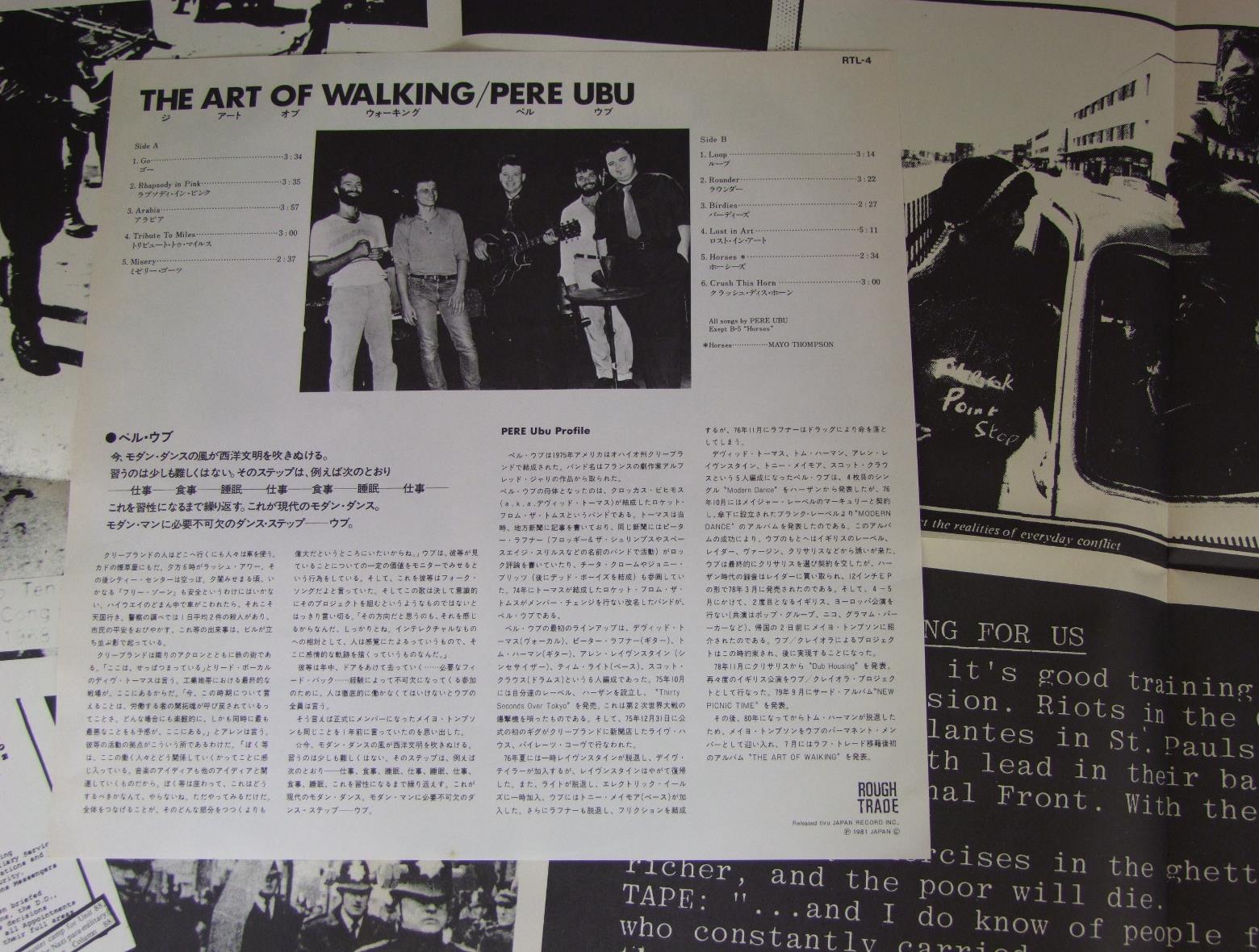PERE UBUペル・ウブ/ART OF WALKING w/POSTERアートオブウォーキング RTL4 製造国:日本盤 / Media:LP外観:EX盤の状態:EX 価格(税込):¥1,320(売約済) 送料 7inch:定形外郵便 360円~LP:定形外郵便 660円~送料は、注文の最終画面で確認頂けます。 > > PERE UBU/ART OF WALKING w/POSTER 外観 (EX)特記事項:特記なし。外観EXの共通説明:ダメージが限定的。中古品としては保存状態がよい方。シミ、ヨゴレ、スレ 少し~軽度。 盤の状態 (EX)特記事項:薄いスリキズ・スレ軽くある感じ。軽微なものの様子です。盤EXの共通説明:盤面のスリキズが薄いものが少し~軽度 音に出そうなものは無いように見える(軽微なソフトティック音は除く)。 Tweet それぞれの画像をクリックすると、大きい写真が見られます こちらの商品もお勧めです 1,320円 CULTURE CLUBカルチャー・クラブ / COLOUR BY NUMBERSカラー・バイ・ナンバーズ 1,210円 ULTRAVOXウルトラヴォックス / NEW EUROPEANS新欧州人 1,320円 ELVIS COSTELLOエルヴィス・コステロ / GOODBYE CRUEL WORLDグッバイ・クルエル・ワールド 1,320円 KEVIN ROWL & DEXYS MIDNIGHT RUNNERSテキシーズ・ミッドナイト・ランナーズ / TOO-RYE-AY女の泪はワザモンだ!! 880円 SNIFF `N` THE TEARSスニッフ&ザ・ティアーズ / LOVE ACTION夜の眩暈 1,320円 BLONDIEブロンディ / AUTOAMERICANオート・アメリカン 440円 TUBESチューブス / OUTSIDE INSIDEアウトサイド・インサイド 770円 CULTURE CLUB / KISSING TO BE CLEVER