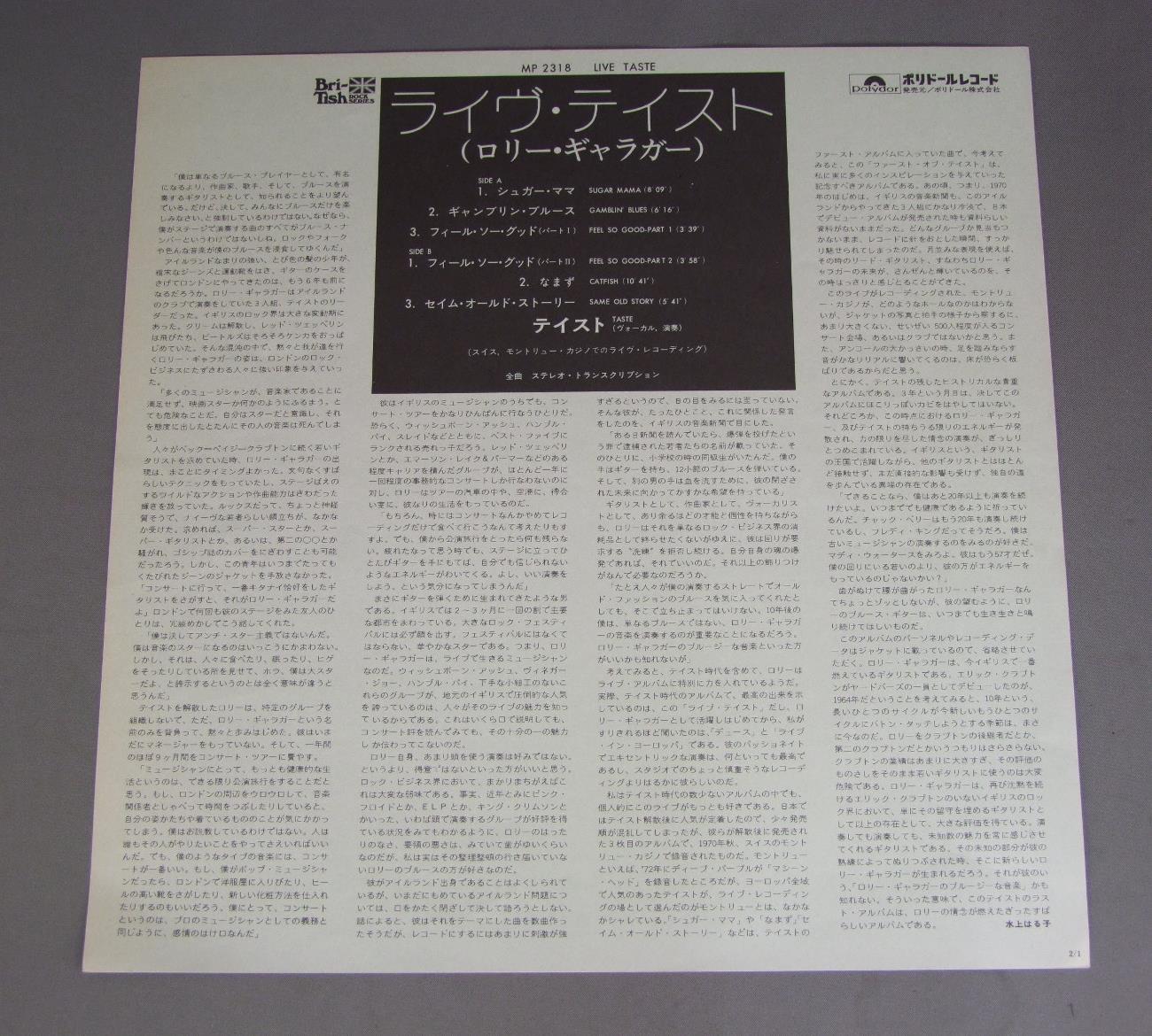 RORY GALLAGHERロリー・ギャラガー/LIVE TASTEライヴ・テイスト MP2318 製造国:日本盤 / Media:LP外観:EX-盤の状態:EX 価格(税込):¥2,365(売約済) 送料 7inch:定形外郵便 360円~LP:定形外郵便 660円~送料は、注文の最終画面で確認頂けます。 > > RORY GALLAGHER/LIVE TASTE 外観 (EX-)特記事項:ヘリスレ有。裏ジャケにシミ。外観EX-の共通説明:ダメージ軽度~多少。 中古品としては普通の状態。シミ、ヨゴレ、スレなど軽く~多少。 盤の状態 (EX)特記事項:薄いスリキズ・スレ軽くある感じ。殆どが軽微なものの様子です。盤EXの共通説明:盤面のスリキズが薄いものが少し~軽度 音に出そうなものは無いように見える(軽微なソフトティック音は除く)。 Tweet それぞれの画像をクリックすると、大きい写真が見られます こちらの商品もお勧めです 770円 CHARLES AZNAVOURシャルル・アズナヴール / GOLDEN PRIZEゴールデン・プライズ 880円 RUPERT HOLMESルパート・ホルムズ / ADVENTUREアドヴェンチャー 770円 FRED BONGUSTOフレッド・ボングスト / IL GIORNO E LA NOTTE昼と夜 770円 JACKSON BROWNEジャクソン・ブラウン / LAWYERS IN LOVE愛の使者 880円 TONY BENETTトニー・ベネット / BEAT OF MY HEARTビート・オブ・マイ・ハード 770円 PETER ALLENピーター・アレン / BI-COASTALバイ・コースタル 880円 JULIEN CLERCジュリアン・クレール / JALOUX嫉妬 990円 GLENN FREYグレン・フライ / ALLNIGHTER