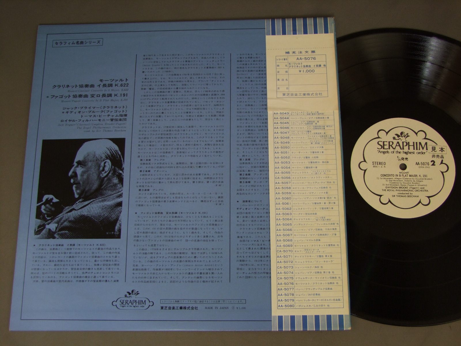 JACK BRYMERジャック・ブライマー/MOZART/CLARINET CONCERTOモーツァルト:クラリネット協奏曲 他 AA5076 製造国:日本盤 / Media:LP外観:EX盤の状態:EX+ 価格(税込):¥880(売約済) 送料 7inch:定形外郵便 360円~LP:定形外郵便 660円~送料は、注文の最終画面で確認頂けます。 > > JACK BRYMER/MOZART/CLARINET CONCERTO 外観 (EX)特記事項:特記なし。外観EXの共通説明:ダメージが限定的。中古品としては保存状態がよい方。シミ、ヨゴレ、スレ 少し~軽度。 盤の状態 (EX+)特記事項:薄いスリキズ・スレ少し。一見してきれいな状態です。盤EX+の共通説明:盤面の極薄いスリキズ、スレ少し程度 音に出そうなものは無いように見える(極軽微なソフトティック音は除く)。 帯の状態 ():ヨレ有。シミ有。 その他:白見本盤 Tweet それぞれの画像をクリックすると、大きい写真が見られます こちらの商品もお勧めです 1,650円 H.IWAKI & COLUMBIA POPS ORCH.岩城宏之-コロムビア・ポップス・オーケストラ / LYRICS OF JAPAN日本の抒情 990円 KUBELIK - VIENNA PHIL.クーベリック指揮ウイーン・フィルハーモニー管弦楽団 / BEETOVEN - SYMPHONY No7ベートーヴェン交響曲第7番イ長調 990円 SCHURICHTシューリヒト / BEETHOVEN SYM. NO7-NO8ベートーヴェン-交響曲 第7番 & 第8番 990円 MUNCHシャルル・ミンシュ / BEETHOVEN -SYM. NO5ベートーヴェン-交響曲第5番-シューベルト-交響曲第8番 未完成 1,320円 FURTWANGLER - VIENNA PHIL.フルトヴェングラー - ウィーン・フィル / BEETHOVEN SYM. NO3 EROICAベートーヴェン 交響曲第3番英雄 1,320円 SUITNER - STAATSKAPELLE DRESDENスウィトナー・ドレスデン国立歌劇場管弦楽団 / MOZART - SYMPHONY NO.41JUPITER / NO.28モーツァルト・交響曲第41番ジュピター、第28番 990円 ANSERMET - SUISS ROMANDEアンセルメ - スイス・ロマンド / BIZET - KARMENビゼー - カルメン 990円 BERNSTEINバーンスティン / MENDELSSOHN-ITALIAN SYM.メンデルスゾーン-イタリア交響曲-ハイドン-ロンドン交響曲