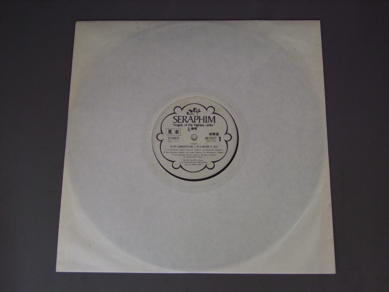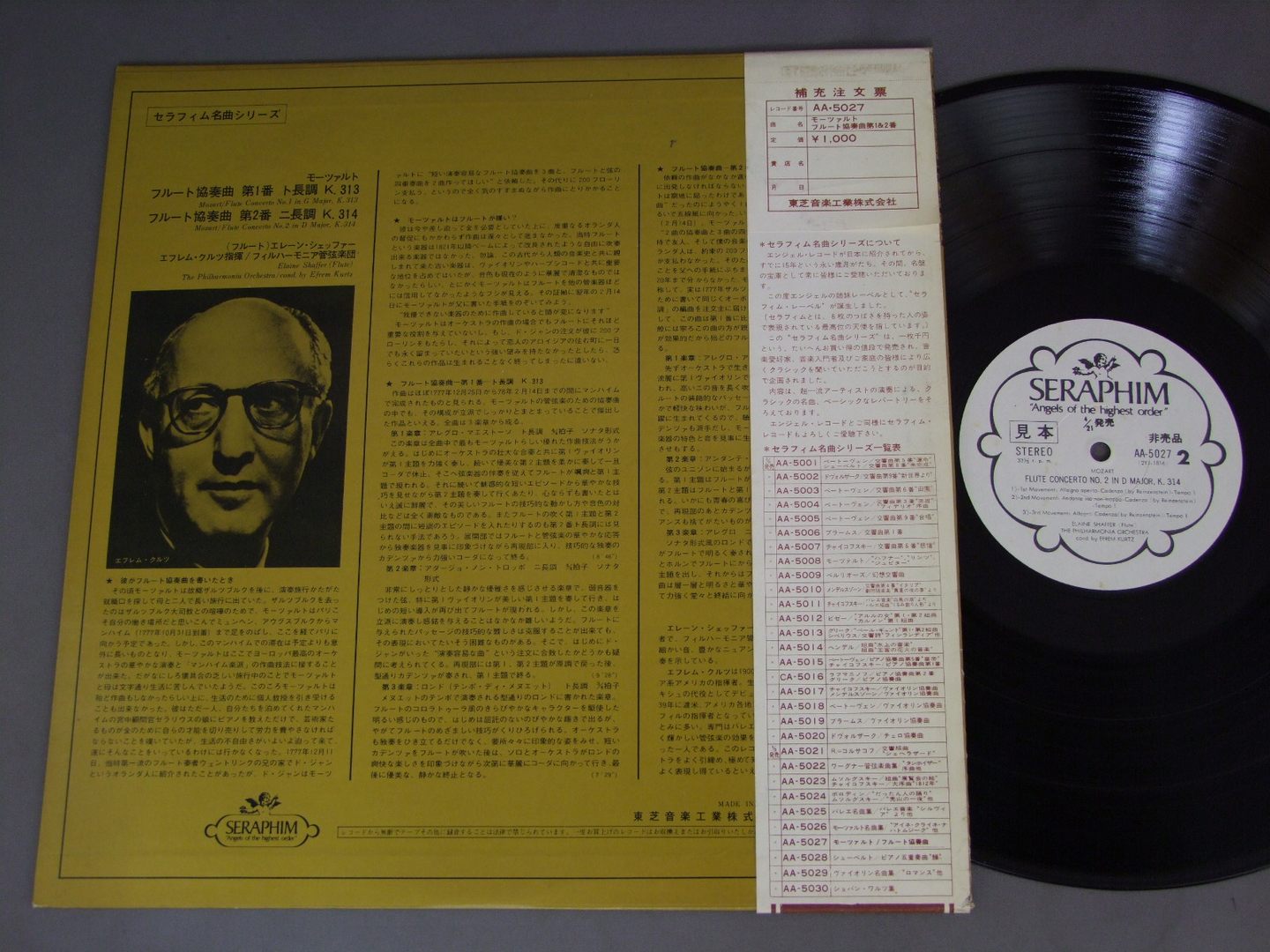 ELAINE SHAFFERエレーン・シェッファー/MOZART/FLUTE CONCERTO NO.1.2モーツァルト:フルート協奏曲第1&2番 AA5027 製造国:日本盤 / Media:LP外観:EX-盤の状態:EX 価格(税込):¥880(売約済) 送料 7inch:定形外郵便 360円~LP:定形外郵便 660円~送料は、注文の最終画面で確認頂けます。 > > ELAINE SHAFFER/MOZART/FLUTE CONCERTO NO.1.2 外観 (EX-)特記事項:ジャケ表面にシミ、よごれ有。外観EX-の共通説明:ダメージ軽度~多少。 中古品としては普通の状態。シミ、ヨゴレ、スレなど軽く~多少。 盤の状態 (EX)特記事項:薄いスリキズ・スレ軽くある感じ。プチ出そうなところは少しだけで、ほとんどが軽微なものの様子です。盤EXの共通説明:盤面のスリキズが薄いものが少し~軽度 音に出そうなものは無いように見える(軽微なソフトティック音は除く)。 帯の状態 ():ヨレ有。切れ、やぶれ有。シミ有。 その他:白見本盤 Tweet それぞれの画像をクリックすると、大きい写真が見られます こちらの商品もお勧めです 1,320円 VAUGHAN - THE ORCHESTRA OF NAPLESヴォーン - ナポリ管弦楽団 / HAYDN - SYMPHONY NO.84ハイドン - 交響曲大84番85番 990円 TOSCANINIトスカニーニ / MOZART WEBER OVERTURESモーツァルト&ウェーバー 990円 I MUSICIイ・ムジチ / VIVALDI - VIOLIN CONCERTOSヴィヴァルディ - ヴァイオリン協奏曲集 990円 BERNSTEIN-NEW YORK PHILHARMONICバーンスタイン - ニューヨーク・フィル / PROKOFIEV - PETER&THE WOLF etcプロコフィエフ - ピーターと狼他 990円 ANSERMETアンサルメ / ANSERMET&RAVELアンサルメ-ラヴェル名演集 1,320円 MICHAIL PLETNEV ミハイル・プレトニョフ / TCHAIKOVSKY - CONCERT SUITE FROM BALLET THE NUTCRACHERチャイコフスキー - 演奏会用組曲`くるみ割り人形` 990円 WALTER - NEW YORK PHIL.ワルター - ニューヨーク・フィル / BEETHOVEN - SYM. NO9 CHORALベートーヴェン - 交響曲第9番合唱 990円 BERNSTEINバーンステイン / TCHAIKOVSKY-PATHETIQUE SYM.チャイコフスキー-悲愴