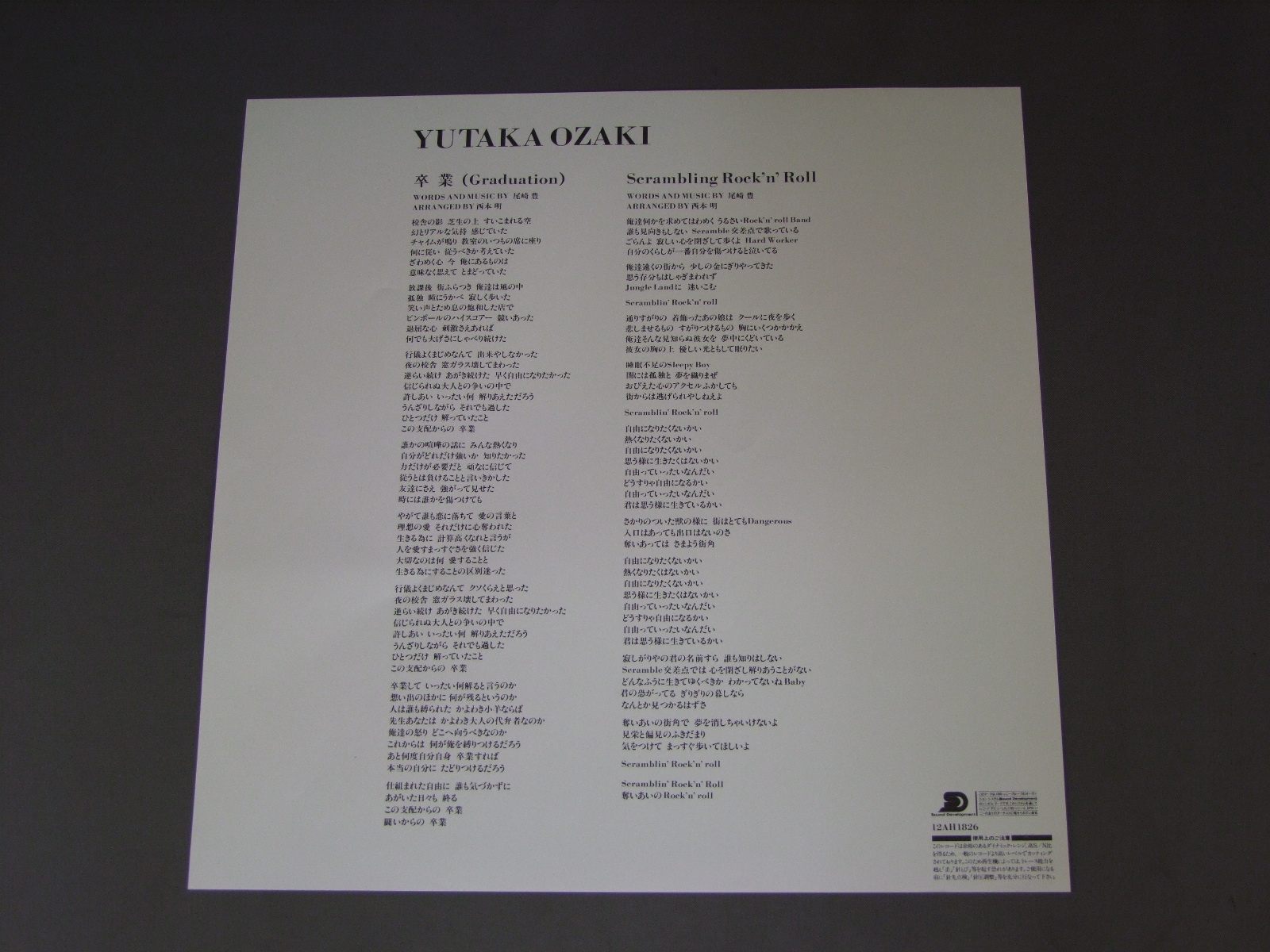 YUTAKA OZAKI尾崎豊/GRADUATION/SCRAMBLING ROCK`N`ROLL卒業/スクランブリング・ロックンロール 12AH1826 製造国:日本盤 / Media:12inch外観:EX+盤の状態:EX+ 価格(税込):¥1,100(売約済) 送料 7inch:定形外郵便 360円~LP:定形外郵便 660円~送料は、注文の最終画面で確認頂けます。 > > YUTAKA OZAKI/GRADUATION/SCRAMBLING ROCK`N`ROLL 外観 (EX+)特記事項:内袋に乱れ有。外観EX+の共通説明:中古としては美品、一見してきれいでダメージが軽微。シミ、ヨゴレ、スレ有っても僅か~少し。 盤の状態 (EX+)特記事項:薄いスリキズ・スレ少し。一見してきれいな状態です。盤EX+の共通説明:盤面の極薄いスリキズ、スレ少し程度 音に出そうなものは無いように見える(極軽微なソフトティック音は除く)。 Tweet それぞれの画像をクリックすると、大きい写真が見られます こちらの商品もお勧めです 1,210円 SNAKEMAN SHOWスネークマン・ショー / SNAKEMAN SHOWスネークマン・ショー 990円 HATUMI SHIBATAしばたはつみ / BEST 16マイ・ラグジュアリー・ナイト しばたはつみ ベスト16 990円 MAYUMI ITUWA五輪真弓 / SHUNNSHUU春愁 770円 YOUSUI INOUE井上陽水 / DANZETU断絶 1,210円 SHOUGO HAMADA浜田省吾 / KIMIGA JINSEI NO TOKI君が人生の時 770円 TAKURO YOSHIDA吉田拓郎 / ONLY YOUオンリー・ユー 880円 MAYUMI ITSUWA五輪真弓 / MY SONGSさよならだけは言わないで 770円 FINGER FIVEフィンガー・ファイブ / GOLDEN HITS