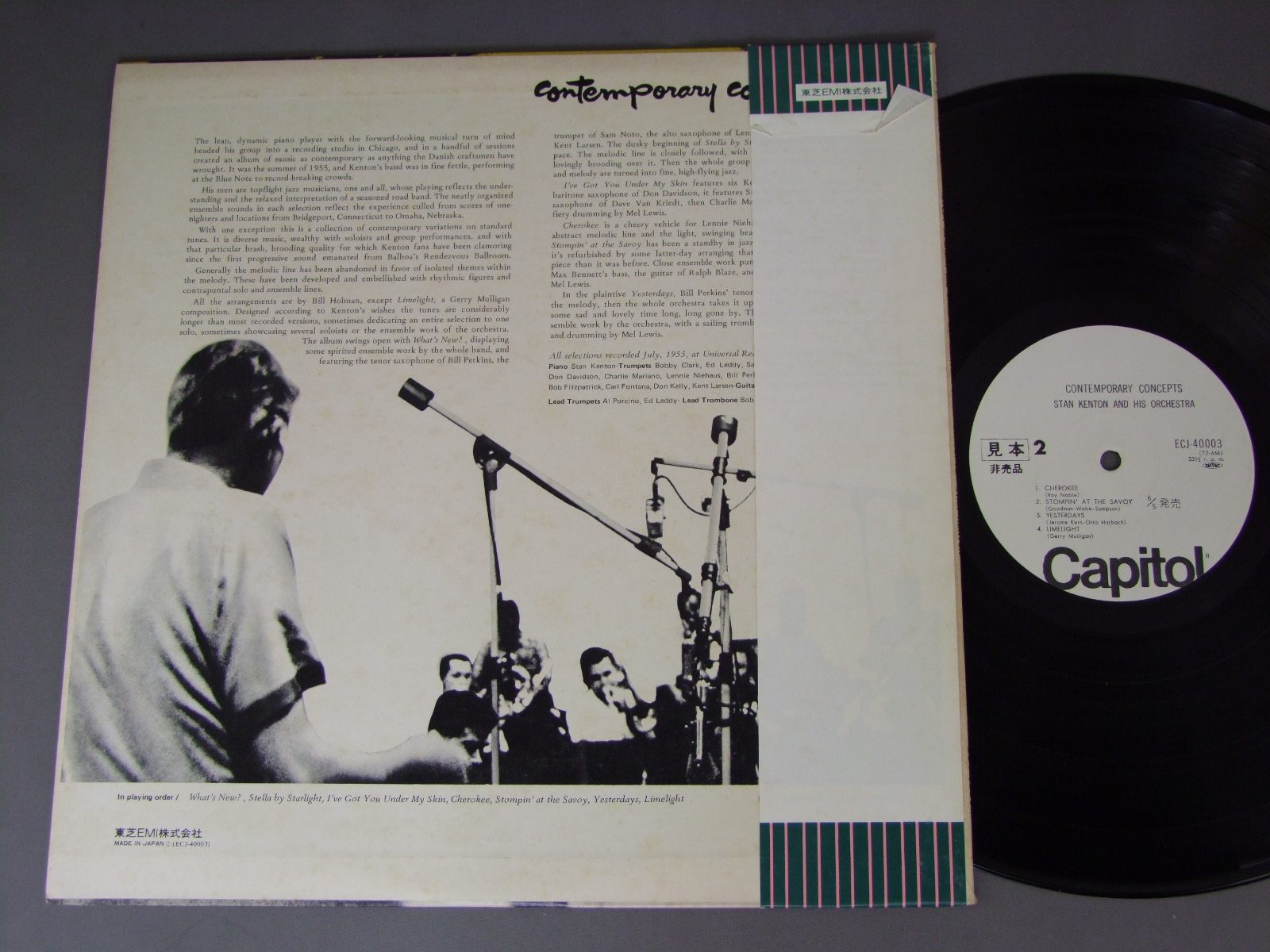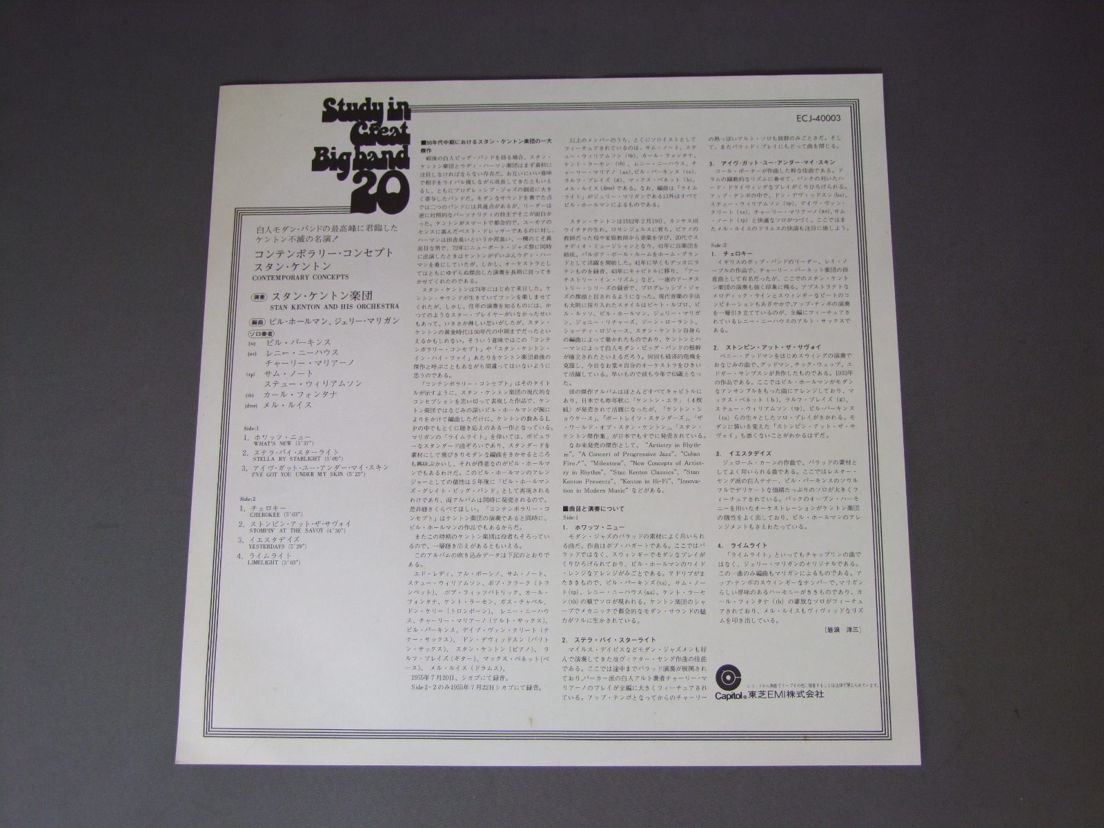 STAN KENTONスタン・ケントン楽団/CONTEMPORARY CONCEPTSコンテンポラリー・コンセプト FCJ40003 製造国:日本盤 / Media:LP外観:VG+盤の状態:EX帯:EX- 価格(税込):¥660(売約済) 送料 7inch:定形外郵便 360円~LP:定形外郵便 660円~送料は、注文の最終画面で確認頂けます。 > > STAN KENTON/CONTEMPORARY CONCEPTS 外観 (VG+)特記事項:表裏ジャケ共にシミ有り。外観VG+の共通説明:ダメージやや有り。シミ、ヨゴレ、スレなど多少~やや多め。 盤の状態 (EX)特記事項:薄いスリキズ・スレ軽くある感じ。軽微なものの様子です。盤EXの共通説明:盤面のスリキズが薄いものが少し~軽度 音に出そうなものは無いように見える(軽微なソフトティック音は除く)。 帯の状態 (EX-):裏側によごれ その他:白見本盤 Tweet それぞれの画像をクリックすると、大きい写真が見られます こちらの商品もお勧めです 770円 HAL McKUSICKハル・マジック / JAZZ WORKSHOPジャズ・ワークショップ 770円 TERUMASA HINO日野皓正 / DOUBLE RAINBOWダブル・レインボー 770円 VARIOUS ARTISTSエドモンド・ホール他 / 52nd STREET SESSIONS52番街セッションズ 1,320円 GREAT JAZZ TRIOグレート・ジャズ・トリオ / AT THE VILLAGE VANGUARD VOL2アット・ザ・ヴィレッジ・ヴァンガードVOL2 990円 HERBIE MANNハービー・マン / GLORY OF LOVEグローリー・オブ・ラヴ 1,980円 MIROSLAV VITOUSミロスラフ・ヴィトウス / INFINITE SEARCH限りなき探究 1,320円 PAUL WINTER SEXTETポール・ウィンター・セクステット / JAZZ MEETS THE FOLK SONG 60s ISUUEフォーク・モダン・ジャズ ペラジャケ 1,980円 EIJI KITAMURA北村英治 / APRIL DATE ( MASTER SOUND PRESSING )エイプリル・デイト (マスターサウンド盤)