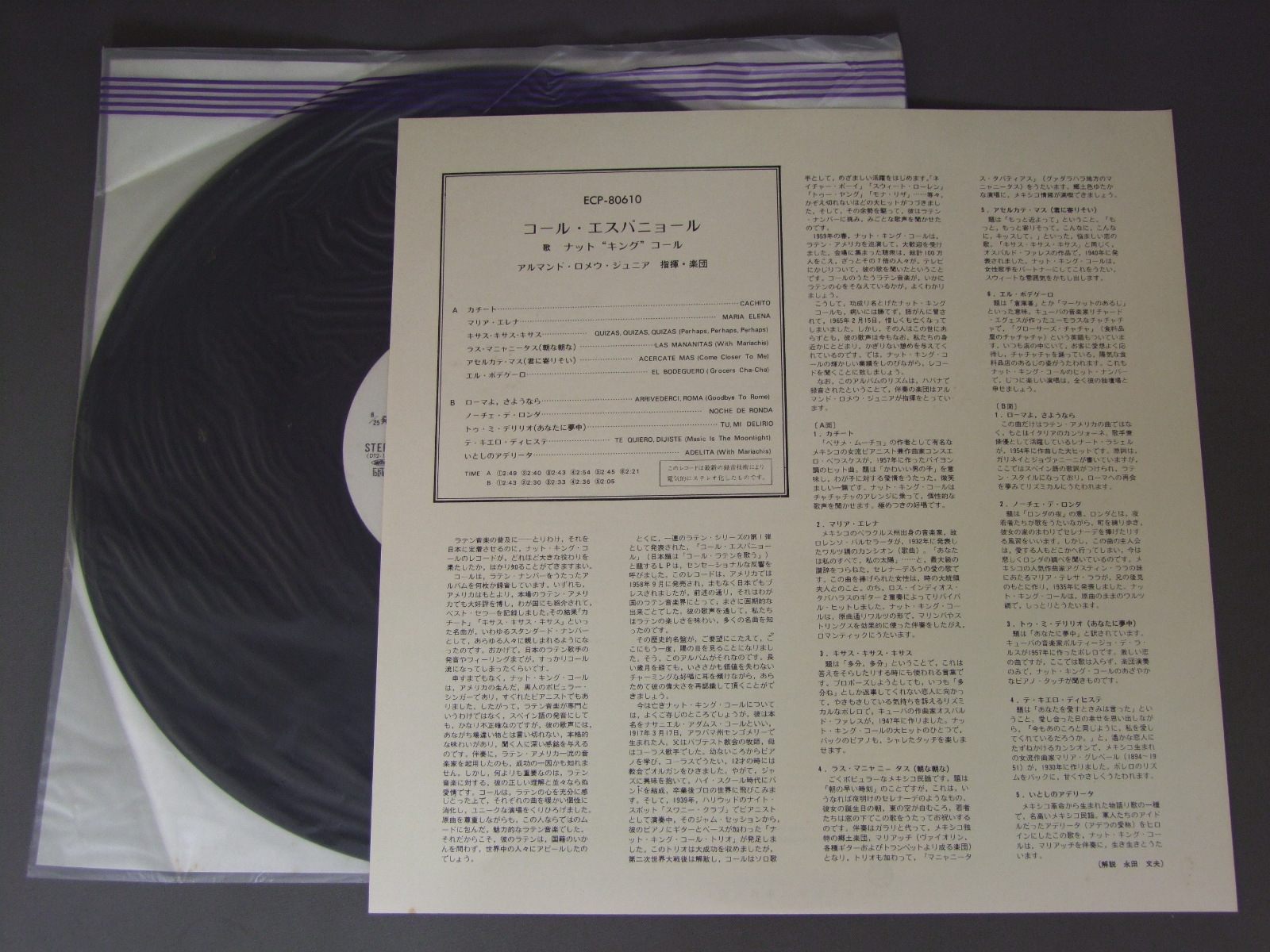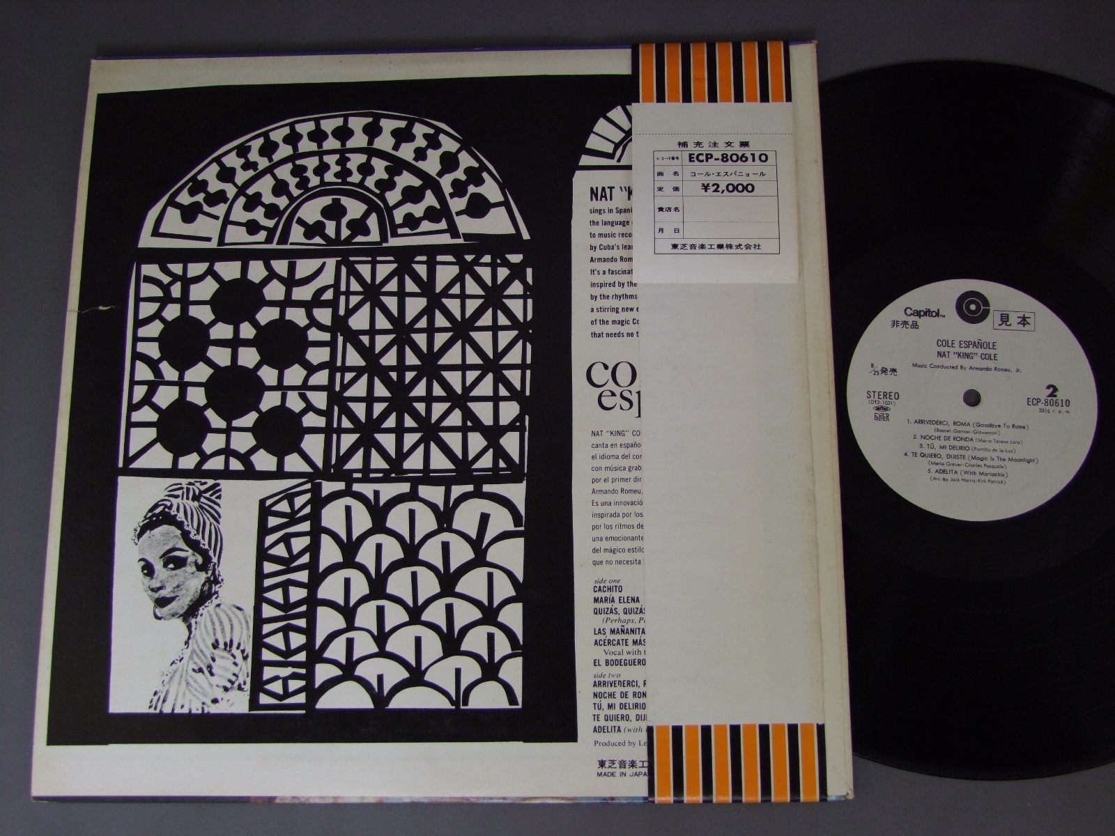 NAT KING COLEナット・キング・コール/COLE ESPANOLコール・エスパニョール ECP80610 製造国:日本盤 / Media:LP外観:EX-盤の状態:EX+帯:EX- 価格(税込):¥990(売約済) 送料 7inch:定形外郵便 360円~LP:定形外郵便 660円~送料は、注文の最終画面で確認頂けます。 > > NAT KING COLE/COLE ESPANOL 外観 (EX-)特記事項:裏ジャケにシミ軽。外観EX-の共通説明:ダメージ軽度~多少。 中古品としては普通の状態。シミ、ヨゴレ、スレなど軽く~多少。 盤の状態 (EX+)特記事項:薄いスリキズ・スレ少し。一見してきれいな状態です。盤EX+の共通説明:盤面の極薄いスリキズ、スレ少し程度 音に出そうなものは無いように見える(極軽微なソフトティック音は除く)。 帯の状態 (EX-):特記なし。 その他:白見本盤 Tweet それぞれの画像をクリックすると、大きい写真が見られます こちらの商品もお勧めです 440円 MARI NAKAMOTO中本マリ / APHORODITEアフロディーの祈り 990円 CLEO LAINE & JAMES GALWAYクレオ・レーン&ジェームズ・ゴールウェイ / SOMETIMES WHEN WE TOUCHベスト・フレンズ? 1,320円 MATT DENNISマット・デニス / DENNIS ANYONE?デニス・エニワン 770円 TONY MARTINトニー・マーティン / HIS GREATEST HITS 770円 MITCH MILLER AND THE GANGミッチ・ミラー合唱団 / HOME CHORUS PARTY VOL2 60s ISSUEホーム・コーラス・パーティ 第2集 ペラジャケ 990円 THREE SOUNDS / THEREE MOODS 770円 BRENDA LEEブレンダ・リー / BEST OF BRENDA LEEブレンダ・リー大全集 990円 CLEO LAINEクレオ・レーン / RETURN TO CARNEGIEリターン・トゥ・カーネギー