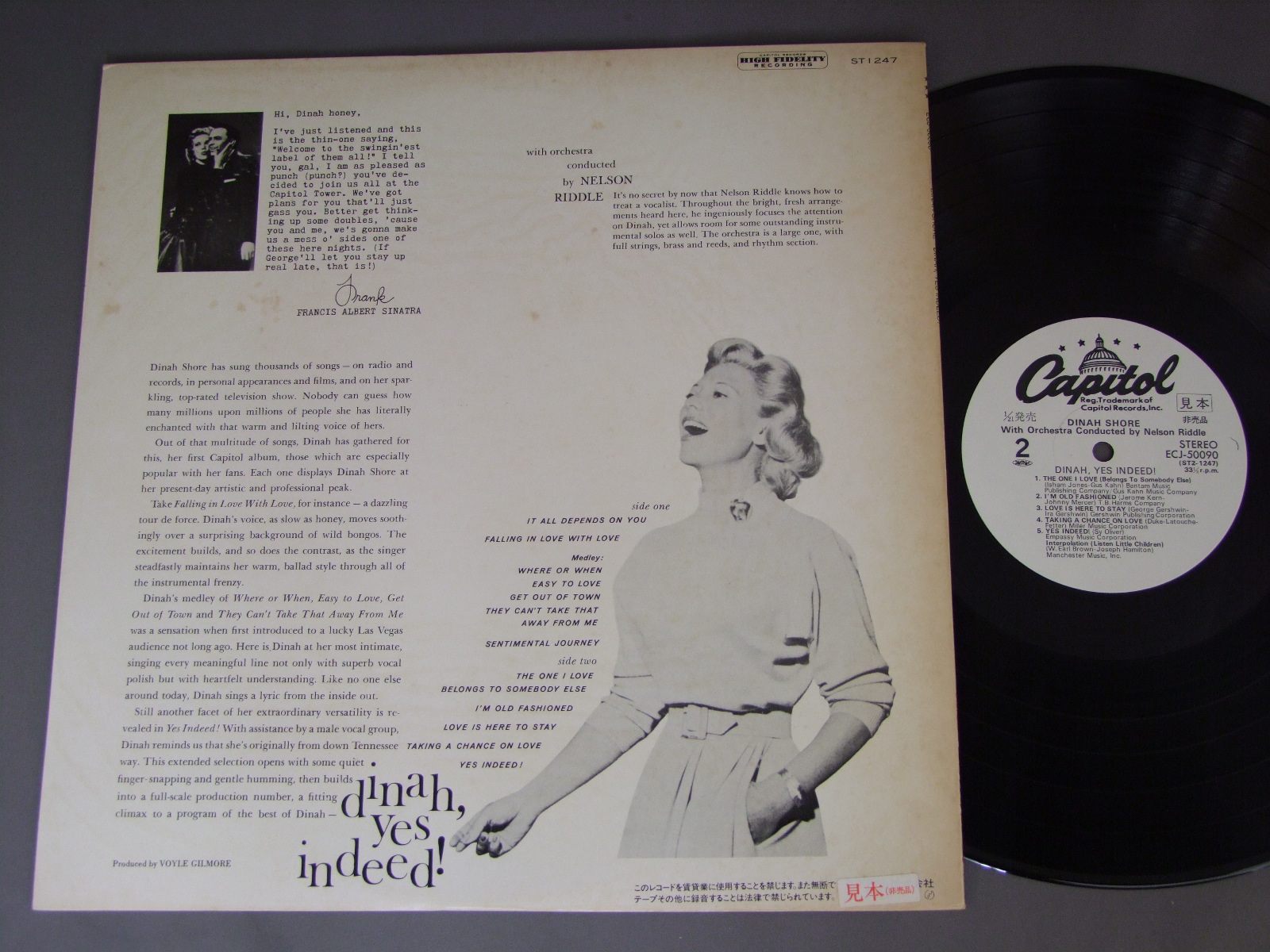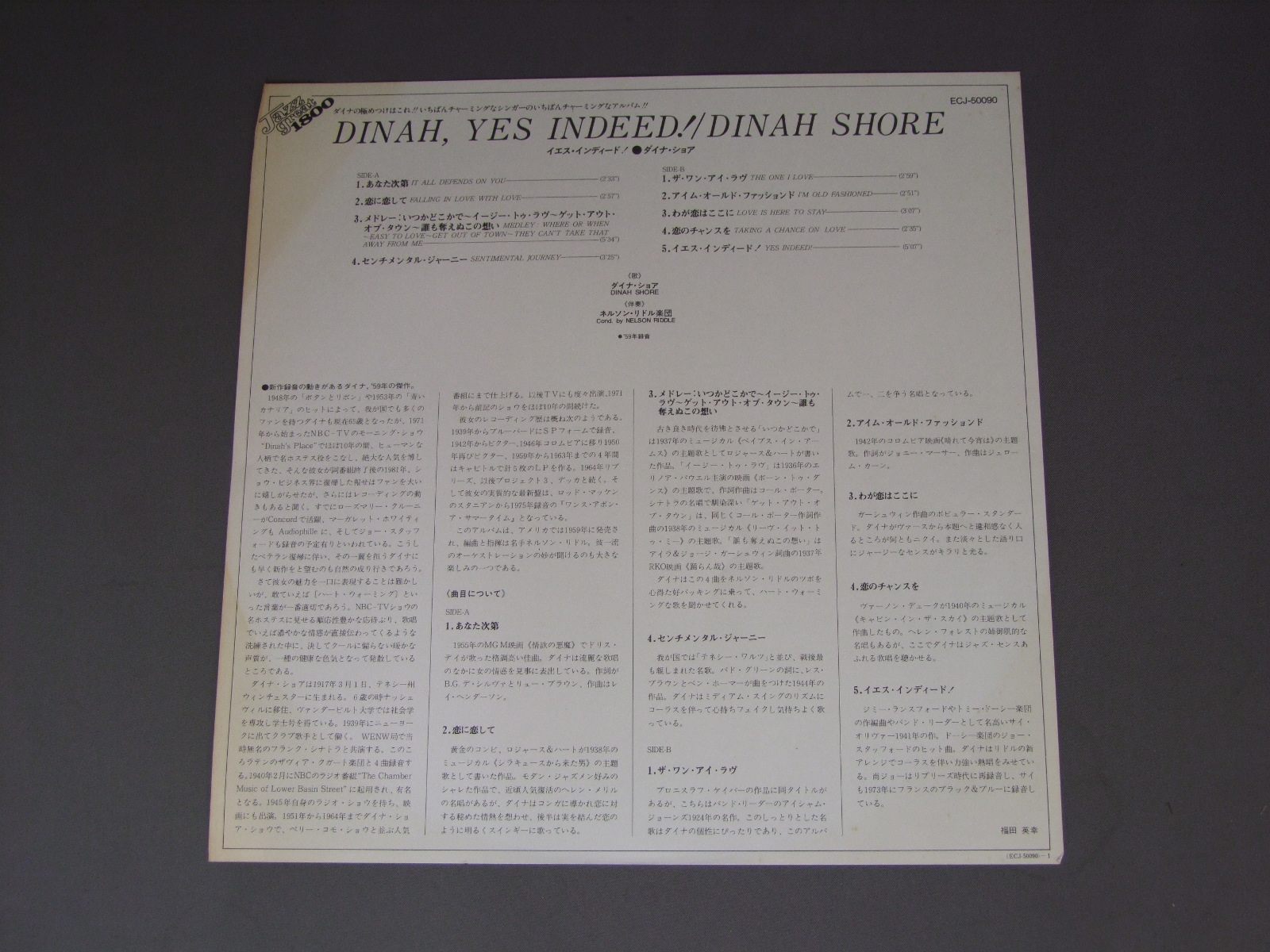 DINAH SHOREダイナ・ショア/DINAH.YES INDEED!イエス・インディード ECJ50090 製造国:日本盤 / Media:LP外観:EX-盤の状態:EX+ 価格(税込):¥1,100(売約済) 送料 7inch:定形外郵便 360円~LP:定形外郵便 660円~送料は、注文の最終画面で確認頂けます。 > > DINAH SHORE/DINAH.YES INDEED! 外観 (EX-)特記事項:裏側にシミあり。背に日焼け。外観EX-の共通説明:ダメージ軽度~多少。 中古品としては普通の状態。シミ、ヨゴレ、スレなど軽く~多少。 盤の状態 (EX+)特記事項:薄いスリキズ・スレ少し。一見してきれいな状態です。盤EX+の共通説明:盤面の極薄いスリキズ、スレ少し程度 音に出そうなものは無いように見える(極軽微なソフトティック音は除く)。 その他:白見本盤 Tweet それぞれの画像をクリックすると、大きい写真が見られます こちらの商品もお勧めです 990円 BING CROSBYビング・クロスビー / BING CROSBY STORYビング・クロスビー・ストーリー 770円 YUKARI KANEKO金子由香利 / BEST COLLECTIONベスト・コレクション 1,210円 TONY BENNETTトニー・ベネット / ART OF EXCELLENCEアート・オブ・エクセレンス 1,320円 YUKARI KANEKO金子由香利 / MEGURIAIめぐり逢い 1,210円 YASUKO阿川泰子 / JOURNEY-YASUKO LOVE-BIRDジャーニー-ヤスコ・ラブ・バード 1,650円 NAMI HIDAKA日高なみ / NAMI HIDAKA AUTOGRAPHED日高なみ サイン付 770円 MAHALIA JACKSONマヘリア・ジャクソン / MAHALIA JACKSON IN CONCERTマヘリア・ジャクソン・イン・コンサート 660円 PAUL ROBESONポール・ロブソン / ROBESON IN HOLY NIGHTロブソン・イン・ホーリーナイト