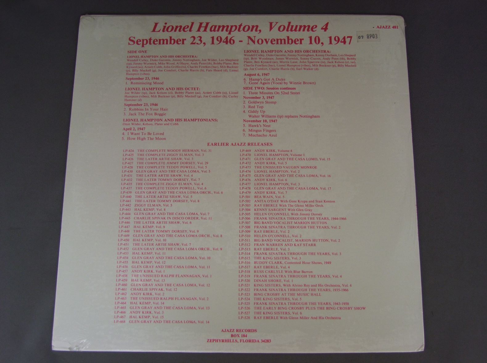 LIONEL HAMPTON/SEPTEMBER 23.1946-NOVEMBER 10.1947 AJAZZ481 製造国:米国盤 / Media:LP外観:EX+盤の状態:M 価格(税込):¥880(売約済) 送料 7inch:定形外郵便 360円~LP:定形外郵便 660円~送料は、注文の最終画面で確認頂けます。 > > LIONEL HAMPTON/SEPTEMBER 23.1946-NOVEMBER 10.1947 外観 (EX+)特記事項:特記なし。外観EX+の共通説明:中古としては美品、一見してきれいでダメージが軽微。シミ、ヨゴレ、スレ有っても僅か~少し。 盤の状態 (M)特記事項:未開封盤Mの共通説明:新品。 Tweet それぞれの画像をクリックすると、大きい写真が見られます こちらの商品もお勧めです 1,210円 MONTE BALLOU AND HIS NEW CASTLE JAZZ BAND / THEY`RE MOVING WILLIE`S GRAVE TO DIG A SEWER (BUTCH THOMPSON AUTOGRAPHED )THEY`RE MOVING WILLIE`S GRAVE TO DIG A SEWER(BUTCH THOMPSONサイン付) 1,210円 YANK LAWSON & BOB HAGGART / PLAYS COLE PORTER AUTOGREPHED (RALPH SUTTON)PLAYS COLE PORTER (RALPH SUTTON サイン付) 1,100円 BENNY GOODMAN / ESSENTIAL 1,100円 HARRY JAMESハリー・ジェイムズ / ALL ABOUT HARRY JAMES 1,320円 YANK LAWSON AND BOB HAGGART / WORLD`S GREATEST JAZZ BAND 1,210円 HARRY JAMES etc / BIG BANDS GREATEST HITS VOLUME 2 1,210円 WORLD`S GREATEST JAZZ BAND OF YANK LAWSON & BOB HAGGART / LIVE (RALPH SUTTON AUTOGRAPHED)LIVE (RALPH SUTTONサイン付) 550円 BUNNY BERIGAN & ORIGINAL DIXIELAND JAZZ BAND / SATURDAY NIGHT SWING CLUB 1936