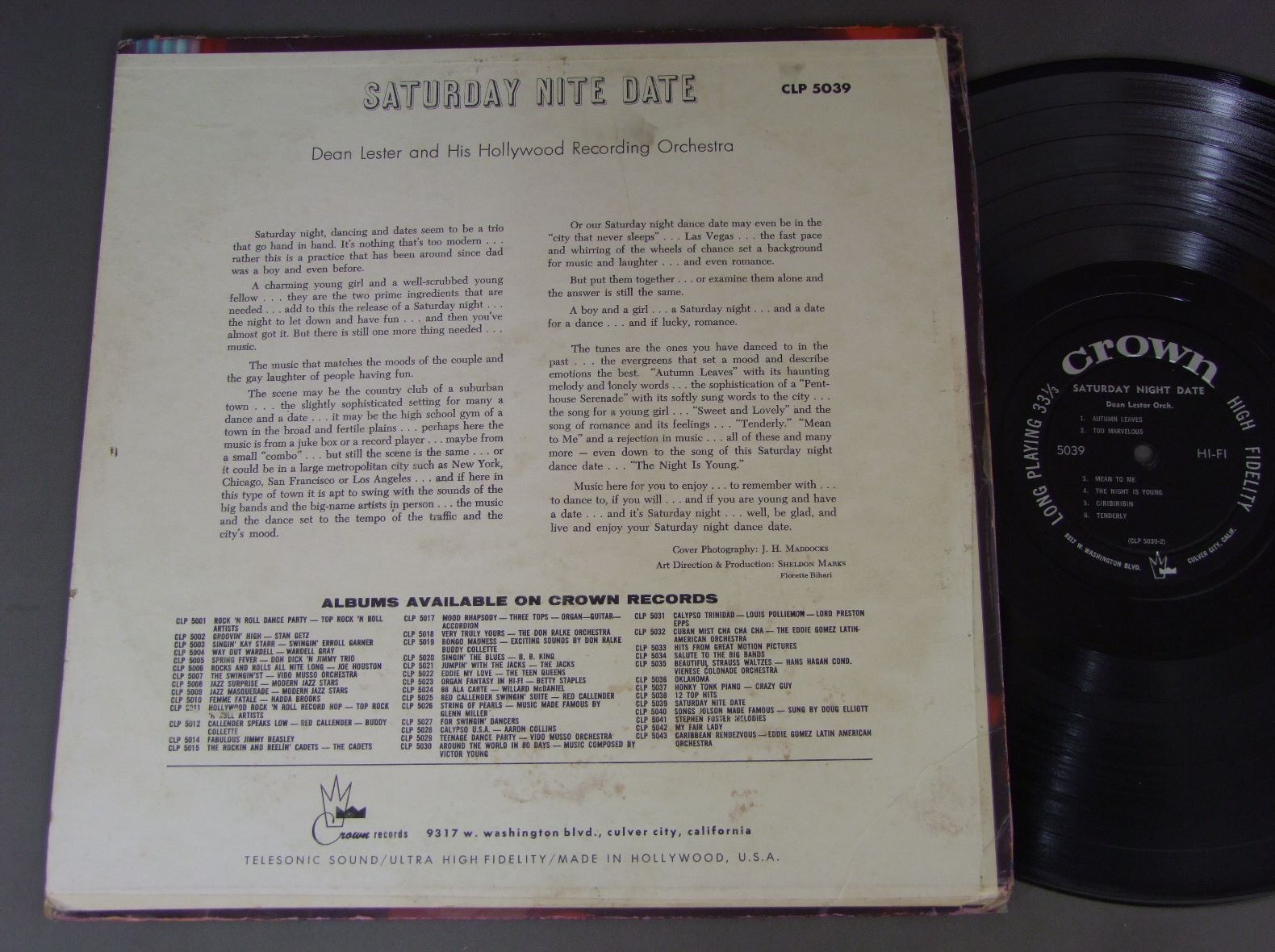 DEAN LESTER & HIS HOLLYWOOD RECORDING ORCHESTRA/SATURDAY NITE DATE CLP5039 製造国:米国盤 / Media:LP外観:VG盤の状態:VG 価格(税込):¥550(売約済) 送料 7inch:定形外郵便 360円~LP:定形外郵便 660円~送料は、注文の最終画面で確認頂けます。 > > DEAN LESTER & HIS HOLLYWOOD RECORDING ORCHESTRA/SATURDAY NITE DATE 外観 (VG)特記事項:背を含めてヘリスレ大。着色補修有り。背と上ヘリにテープ。外観VGの共通説明:ダメージが見るからに多い。 盤の状態 (VG)特記事項:スリキズ、スレ多め。プチ出そうなものも多少有り。少し聴いてみたところ、チリプチやや有りますが、音もしっかり鳴っているようです。盤VGの共通説明:盤面にスリキズがやや有り、音に出そうなものも所々有る。 Tweet それぞれの画像をクリックすると、大きい写真が見られます こちらの商品もお勧めです 1,100円 HARRY JAMESハリー・ジェイムズ / ALL ABOUT HARRY JAMES 770円 LIONEL HAMPTON / LIONEL HAMPTON&HIS BIG BAND `OUTRAGEOUS` 1,155円 GLENN MILLER - TOMMY DORSEY / GLENN MILLER`S MODERNAIRES 1,210円 HARRY JAMES etc / BIG BANDS GREATEST HITS VOLUME 2 990円 FRANKIE CARLE / GOLDEN TOUCH 1,100円 LIONEL HAMPTON / ROCK ROCK ROCK 1,320円 YANK LAWSON AND BOB HAGGART / WORLD`S GREATEST JAZZ BAND 770円 HARRY JAMES AND HIS ORCHESTRA / BEGINING
