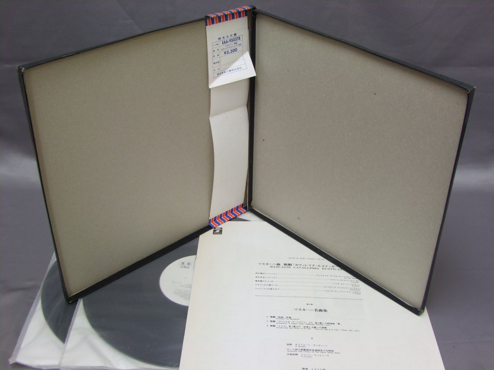 SANTINIガブリエーレ・サンティーニ/MASCAGNI:CAVALLERIA RUSTICANAマスカーニ/歌劇「カヴァレリア・ルスティカーナ」〈全曲〉 EAA95037B 製造国:日本盤 / Media:LP外観:EX-盤の状態:EX+ 価格(税込):¥880(売約済) 送料 7inch:定形外郵便 360円~LP:定形外郵便 660円~送料は、注文の最終画面で確認頂けます。 > > SANTINI/MASCAGNI:CAVALLERIA RUSTICANA 外観 (EX-)特記事項:特記なし。外観EX-の共通説明:ダメージ軽度~多少。 中古品としては普通の状態。シミ、ヨゴレ、スレなど軽く~多少。 盤の状態 (EX+)特記事項:薄いスリキズ・スレ少し。一見してきれいな状態です。盤EX+の共通説明:盤面の極薄いスリキズ、スレ少し程度 音に出そうなものは無いように見える(極軽微なソフトティック音は除く)。 帯の状態 ():VG+ その他:白見本盤 Tweet それぞれの画像をクリックすると、大きい写真が見られます こちらの商品もお勧めです 1,320円 BOHM - STAATSKAPELLE DRESEN / MOZART - ENTFUHRUNG AUS DEM SERAIL 3LP SET 990円 YASUKO HAYASHI林康子-加納悟郎 / ARIE ANTICHE ITALIANEイタリア古典歌曲集 1,320円 BENIAMINO GIGLIベニャミーノ・ジーリ / ART OF BENIAMINO GIGLIジーリ名唄集 440円 AMES BROTHERSエームス・ブラザース - ジューン・ヴァリ - ダイナ・ショア 他 / MEMORABLE HITS FROM `S`想い出のS盤アワー VOL2 1,320円 FRANCO CORELLIフランコ・コレルリ / BEST OF FRANCO CORELLI OPERA ARIASオペラ・アリア集 990円 YOICHIRO FUKUNAGA福永陽一郎 / YOSHINAO NAKATA WORKS都会・蝶/中田喜直作品集 990円 RENADO CELLINI - RCA VICTOR ORCHESTRAチェリーニ - RCAビクター管弦楽団 / VERDI - IL TROVATOREヴェルディ - トロヴァトーレ ハイライト 1,430円 BRUNO TURNER - PRO CANTIONE ANTIQUAブルーノ・ターナー - プロ・カンツィーオーネ・アンティカ / ORLANDO DI LASSO - MUSICA DEI DONUMラッソ - モントウス 音楽は神の贈り物