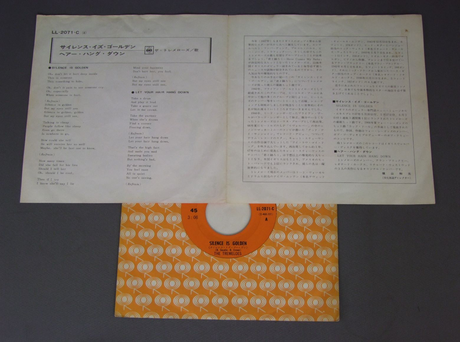 TREMELOESトレメローズ/SILENCE IS GOLDENサイレンス・イズ・ゴールデン LL2071C 製造国:日本盤 / Media:7inch外観:EX-盤の状態:EX 価格(税込):¥1,100(売約済) 送料 7inch:定形外郵便 360円~LP:定形外郵便 660円~送料は、注文の最終画面で確認頂けます。 > > TREMELOES/SILENCE IS GOLDEN 外観 (EX-)特記事項:ヨレやシミ有り。外観EX-の共通説明:ダメージ軽度~多少。 中古品としては普通の状態。シミ、ヨゴレ、スレなど軽く~多少。 盤の状態 (EX)特記事項:薄いスリキズ・スレ軽くある感じ。殆どが軽微なものの様子です。盤EXの共通説明:盤面のスリキズが薄いものが少し~軽度 音に出そうなものは無いように見える(軽微なソフトティック音は除く)。 Tweet それぞれの画像をクリックすると、大きい写真が見られます こちらの商品もお勧めです 4,950円 ANIMALSアニマルズ / BEST ALBUM アニマルズのすべて 赤盤 2,640円 SPOTNICKSスプートニクス / KARELIA-THE BEST OF THE SPOTNICKS霧のカレリア-ベスト・オブ・ザ・スプートニクス