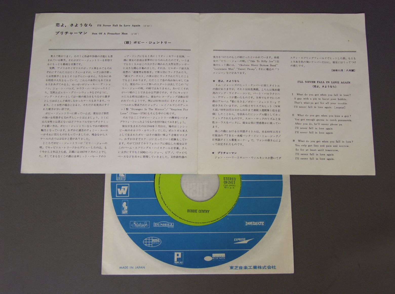 BOBBIE GENTRYボビー・ジェントリー/I`LL NEVER FALL IN LOVE AGAIN恋よ.さようなら CR2411 製造国:日本盤 / Media:7inch外観:EX盤の状態:EX 価格(税込):¥770 送料 7inch:定形外郵便 360円~LP:定形外郵便 660円~送料は、注文の最終画面で確認頂けます。 > > BOBBIE GENTRY/I`LL NEVER FALL IN LOVE AGAIN 外観 (EX)特記事項:ジャケ表面にシミ有。続きシワ有。外観EXの共通説明:ダメージが限定的。中古品としては保存状態がよい方。シミ、ヨゴレ、スレ 少し~軽度。 盤の状態 (EX)特記事項:薄いスリキズ・スレ軽くある感じ。殆どが軽微なものの様子です。盤EXの共通説明:盤面のスリキズが薄いものが少し~軽度 音に出そうなものは無いように見える(軽微なソフトティック音は除く)。 Tweet それぞれの画像をクリックすると、大きい写真が見られます こちらの商品もお勧めです 770円 PAT BENATARパット・べネター / GET NERVOUSゲット・ナーヴァス 770円 CORA VAUCAIREコラ・ヴォーケール / COMPLAINTE DE LA BUTTEモンマルトルの丘 660円 JESSI COLTERジェシー・コルター / DIAMOND IN THE ROUGH粗野なダイアモンド 1,320円 CYNDI LAUPERシンディ・ローパー / TRUE COLORSトゥルー・カラーズ 1,650円 VIKKI CARRヴィッキー・カー / VIKKI CARR LIVE AT THE GREEK THEATREグリーク・シアターのヴィッキー・カー 660円 MARLENE DIETRICHマレーネ・ディートリッヒ / MAGIC OF MARLENE永遠の名花 1,320円 JUDY COLLINSジュディ・コリンズ / TRUE STORIES真実と夢 550円 RITA COORIDGEリタ・クーリッジ / HEARTBREAK RADIOハートブレイク・ラジオ