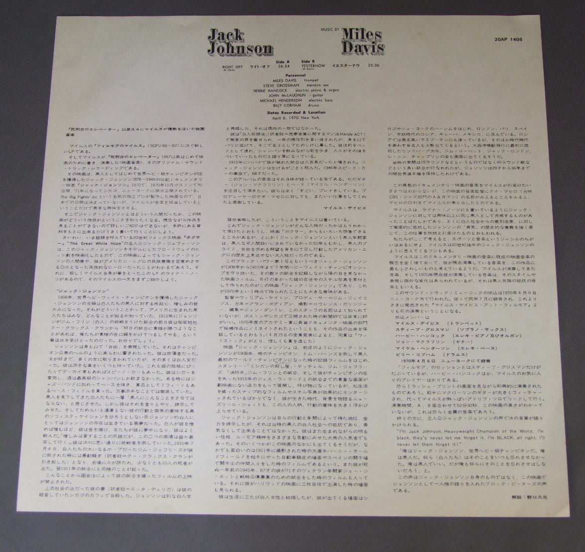 MILES DAVIS/JACK JOHNSON 20AP1405 製造国:日本盤 / Media:LP外観:EX-盤の状態:EX+ 価格(税込):¥990(売約済) 送料 7inch:定形外郵便 360円~LP:定形外郵便 660円~送料は、注文の最終画面で確認頂けます。 > > MILES DAVIS/JACK JOHNSON 外観 (EX-)特記事項:裏ジャケにシミ。外観EX-の共通説明:ダメージ軽度~多少。 中古品としては普通の状態。シミ、ヨゴレ、スレなど軽く~多少。 盤の状態 (EX+)特記事項:薄いスリキズ・スレ少し。一見してきれいな状態です。盤EX+の共通説明:盤面の極薄いスリキズ、スレ少し程度 音に出そうなものは無いように見える(極軽微なソフトティック音は除く)。 Tweet それぞれの画像をクリックすると、大きい写真が見られます こちらの商品もお勧めです 880円 V-DISC ALL-STAR JAM SESSIONSVディスク・オールスター・ジャムセッション / V-DISC ALL-STAR JAM SESSIONSVディスク・オールスター・ジャムセッション VOL.5 880円 MASAMI NAKAGAWA中川昌三 / PRELUDE FOR AUTUMNプレリュード・フォー・オータム 990円 FORCEフォース / SECOND FORCEセカンド・フォース 1,210円 MODERN JAZZ QUARTET + NEW YORK CHAMBER SYMPHONYMJQ + ニューヨーク・チェンバー・シンフォニー / THREE WINDOWSスリー・ウインドウズ 1,320円 HERBIE MANNハービー・マン楽団 / ST.THOMAS 60s ISSUEセント・トーマス ペラジャケ 1,320円 GREAT JAZZ TRIOグレート・ジャズ・トリオ / AT THE VILLAGE VANGUARD VOL2アット・ザ・ヴィレッジ・ヴァンガードVOL2 1,320円 PHIL WOODSフィル・ウッズ / AT THE FRANKFORT JAZZ FESTIVAL 770円 VARIOUS ARTISTSエドモンド・ホール他 / 52nd STREET SESSIONS52番街セッションズ