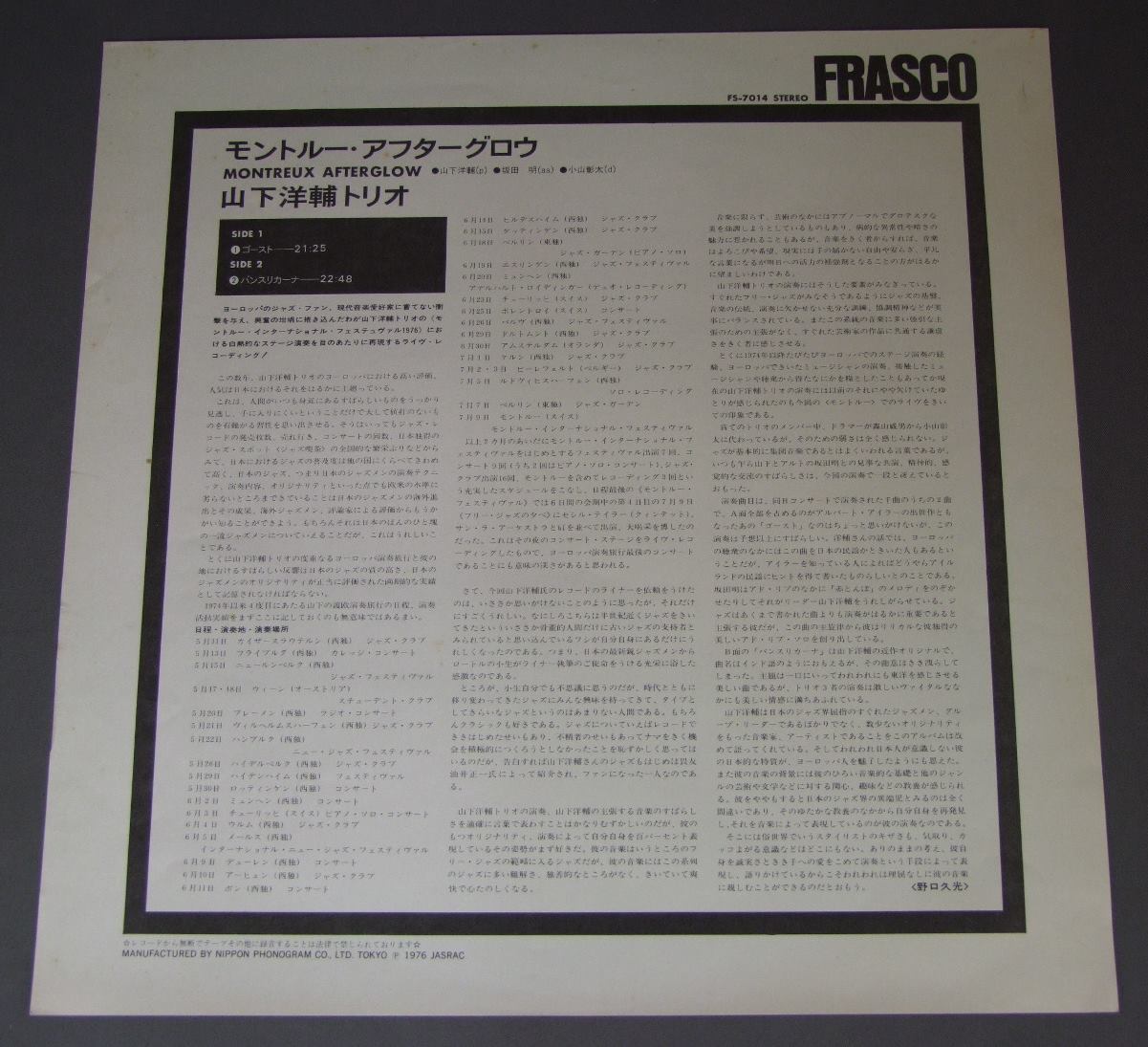 YOSUKE YAMASHITA TRIO山下洋輔トリオ/MONTREUX AFTERGLOWモントルー・アフターグロウ FS7014 製造国:日本盤 / Media:LP外観:VG+盤の状態:EX 価格(税込):¥1,320(売約済) 送料 7inch:定形外郵便 360円~LP:定形外郵便 660円~送料は、注文の最終画面で確認頂けます。 > > YOSUKE YAMASHITA TRIO/MONTREUX AFTERGLOW 外観 (VG+)特記事項:ジャケ表面にスレよごれ有。付属品にシミ、よごれ有。外観VG+の共通説明:ダメージやや有り。シミ、ヨゴレ、スレなど多少~やや多め。 盤の状態 (EX)特記事項:薄いスリキズ・スレ軽くある感じ。軽微なものの様子です。盤EXの共通説明:盤面のスリキズが薄いものが少し~軽度 音に出そうなものは無いように見える(軽微なソフトティック音は除く)。 Tweet それぞれの画像をクリックすると、大きい写真が見られます こちらの商品もお勧めです 770円 SADAO WATANABE渡辺貞夫 / MY DEAR LIFEマイ・ディア・ライフ 1,210円 MODERN JAZZ QUARTETMJQ / ART OF THE MODERN JAZZ QUARTETアート・オブ・MJQ 1,210円 RAY BROWN & MILT JACKSONレイ・ブラウンとミルト・ジャクソン / BROWN & JACKSON 770円 ART TATUM&HIS BANDアート・テイタム楽団 / ART TATUM & HIS SWINGSTERSアート・テイタム・オール・スター・セッション 1,210円 BUCK CLAYTON SEPTETバック・クレイトン / BUCKIN`THE BLUESバッキン・ザ・ブルース 1,320円 BOB CROSBY`S BOB CATSボブ・クロスビーのボブ・キャッツ / BOB CROSBY`S BOB CATSボブ・クロスビーのボブ・キャッツ 770円 CHICK COREAチック・コリア / PIANO IMPROVISATIONS VOL1チック・コリア・ソロ VOL1 770円 JOHN KLEMMERジョン・クレマー / FINESSEフィネス