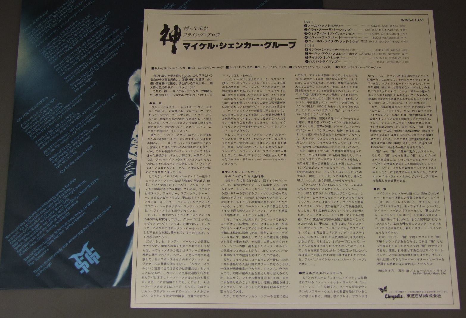 MICHAEL SCHENKERマイケル・シェンカー/1st ALBUM WWS81376 製造国:日本盤 / Media:LP外観:EX+盤の状態:EX+ 価格(税込):¥1,100(売約済) 送料 7inch:定形外郵便 360円~LP:定形外郵便 660円~送料は、注文の最終画面で確認頂けます。 > > MICHAEL SCHENKER/1st ALBUM 外観 (EX+)特記事項:特記なし。外観EX+の共通説明:中古としては美品、一見してきれいでダメージが軽微。シミ、ヨゴレ、スレ有っても僅か~少し。 盤の状態 (EX+)特記事項:薄いスリキズ・スレ少し。一見してきれいな状態です。盤EX+の共通説明:盤面の極薄いスリキズ、スレ少し程度 音に出そうなものは無いように見える(極軽微なソフトティック音は除く)。 Tweet それぞれの画像をクリックすると、大きい写真が見られます こちらの商品もお勧めです 660円 NIGHT RANGER / DAWN PATROL緊急指令 660円 NIGHT RANGER / MIDNIGHT MADNESS + BOOKMIDNIGHT MADNESS + BOOK付 770円 IAN GILLAN BANDイアン・ギラン・バンド / LIVE AT THE BUDOKANライブ・イン・ジャパン 1,210円 TYGERS OF PAN TANGタイガース・オブ・パンタン / CAGE危険なパラダイス 1,320円 RUSSIA露西亜 / RUSSIA露西亜 `ペテルスブルグ炎上` 770円 IAN GILLAN BANDイアン・ギラン・バンド / LIVE AT THE BUDOKAN VOL2ライブ・イン・ジャパン VOL2 2,200円 KEELキール / FINAL FRONTIERファイナル・フロンティア 2,200円 HARDCHOIRハードクワイア / HARDCHOIR WLP華麗なる戦慄